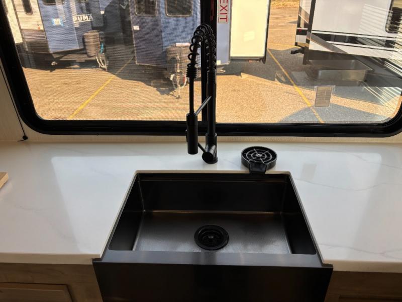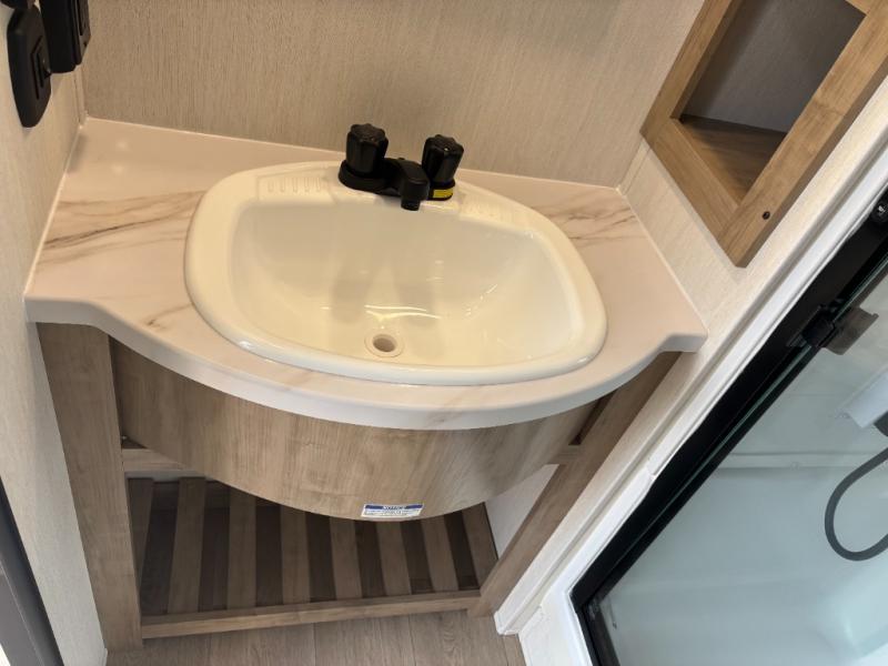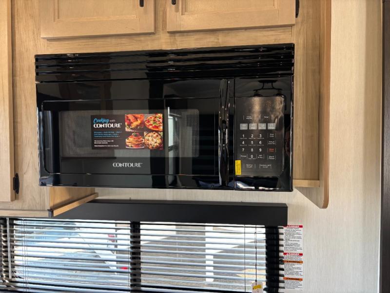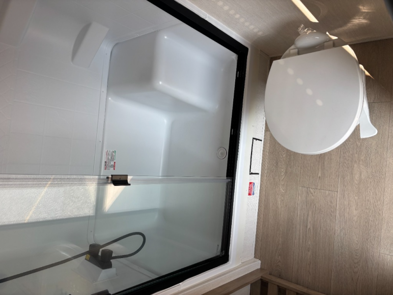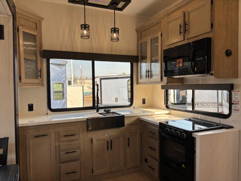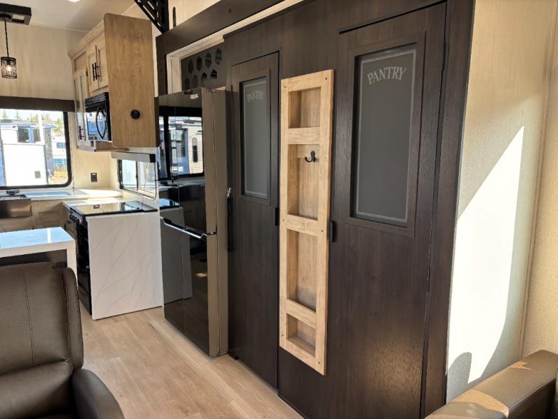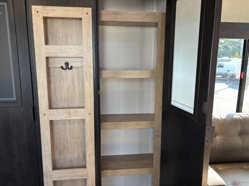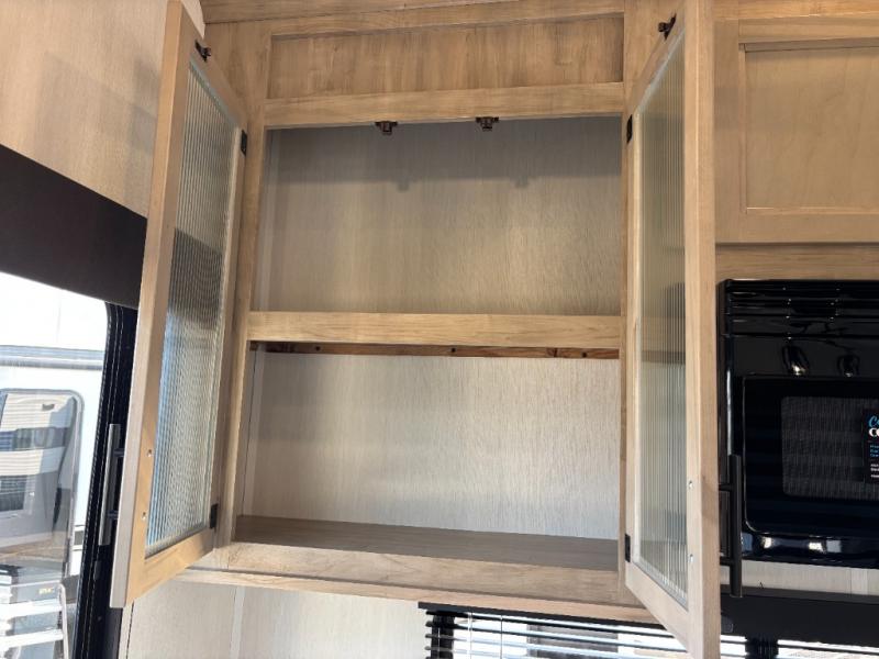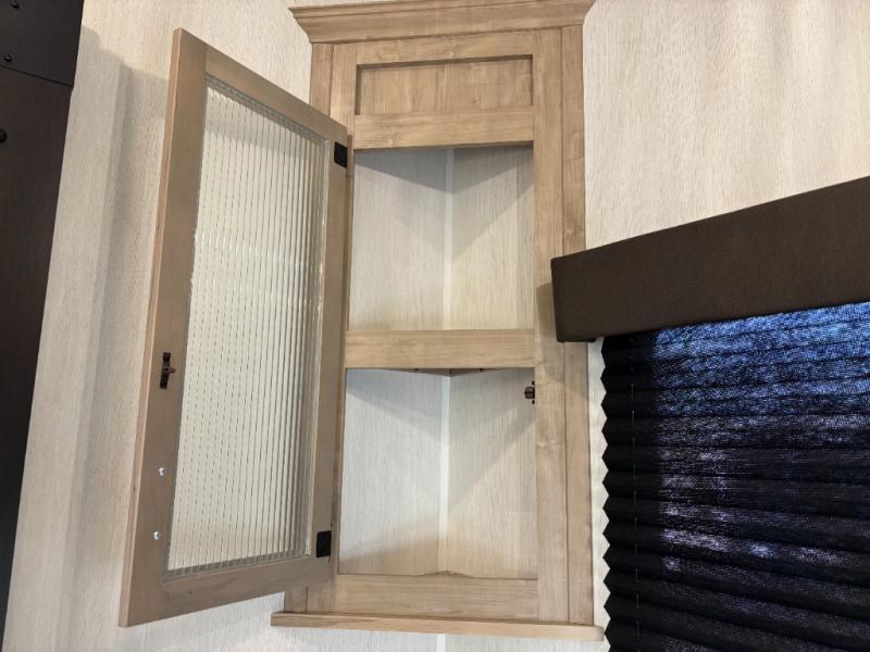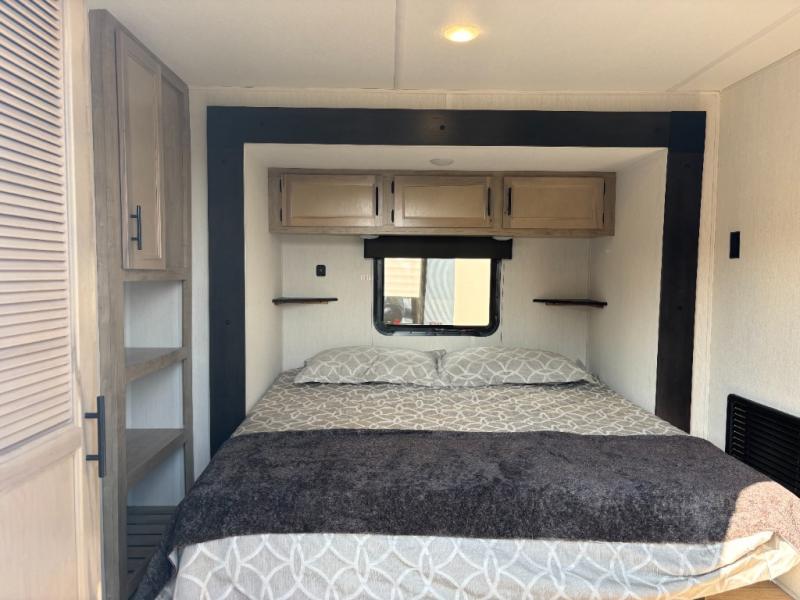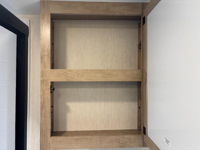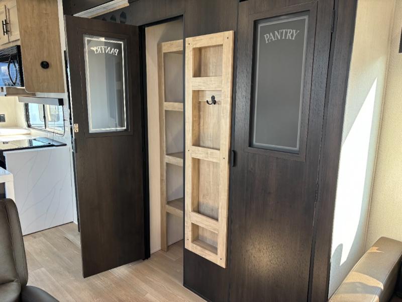 It won't be hard to find comfort in this front kitchen destination trailer! There is ample counter space to prep meals, a free-standing dinette with a slide out, plus a large pantry and 18 cu. ft. refrigerator for food storage. The bar top with stools overlooks the middle living area, where you'll also find dual hide-a-bed sofas and an entertainment center with a fireplace. The full bath includes a shower with a seat for more comfort, and one of the dual entry doors is right across from the bath so you can quickly get back outside. Head up the steps to the dual loft areas with two bunk mats and cabinets on one side, and an open area on the other, perfect for a play room or extra storage! And under the loft you'll find the rear private bedroom with a king bed slide, a wardrobe and an entertainment center, plus washer and dryer prep if you want to add these appliances!