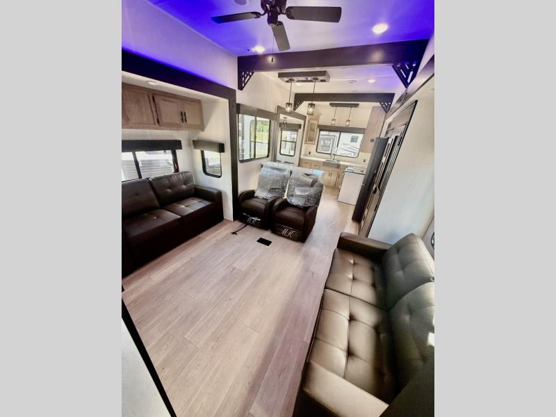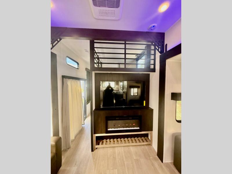 The 2026 Forest River Cherokee Timberwolf 39DK is a front kitchen destination trailer designed for comfort and space, featuring four slides, a rear king bedroom with a wardrobe and washer/dryer prep, double loft areas with bunk mats and a play space, a full bath with a shower and seat, and an entertainment center with a fireplace. This model is equipped with a residential-style kitchen, dual lounge chairs, and a free-standing dinette to create a large, open living area perfect for long-term stays at a campsite.
