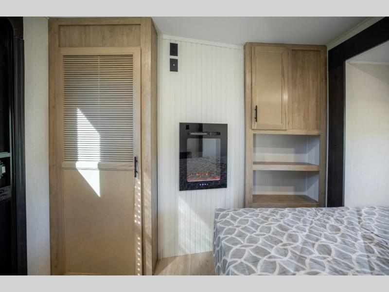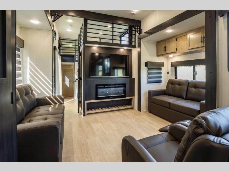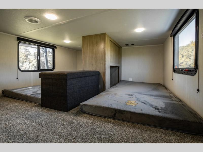 It won't be hard to find comfort in this front kitchen destination trailer! There is ample counter space to prep meals, a free-standing dinette with a slide out, plus a large pantry and 18 cu. ft. refrigerator for food storage. The bar top with stools overlooks the middle living area, where you'll also find dual hide-a-bed sofas and an entertainment center with a fireplace. The full bath includes a shower with a seat for more comfort, and one of the dual entry doors is right across from the bath so you can quickly get back outside. Head up the steps to the dual loft areas with two bunk mats and cabinets on one side, and an open area on the other, perfect for a play room or extra storage! And under the loft you'll find the rear private bedroom with a king bed slide, a wardrobe and an entertainment center, plus washer and dryer prep if you want to add these appliances!