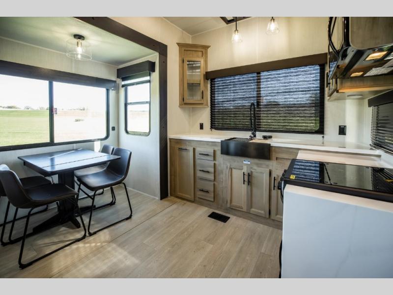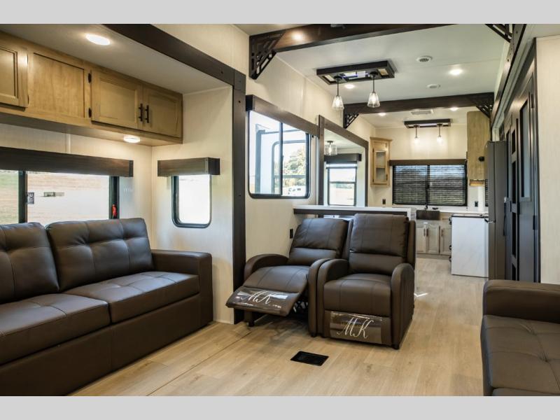 Massive Living Space: Featuring four expansive slide-outs, the 39DK offers one of the most generous living areas in its class, complete with dual lounge chairs, theater seats, and a hide-a-bed sofa for maximum relaxation