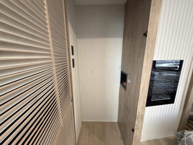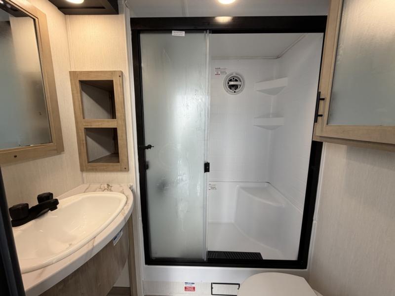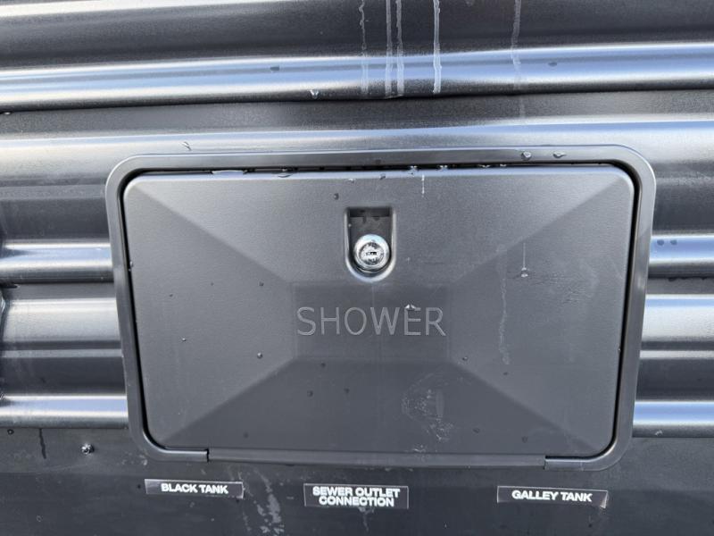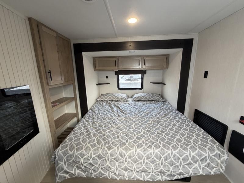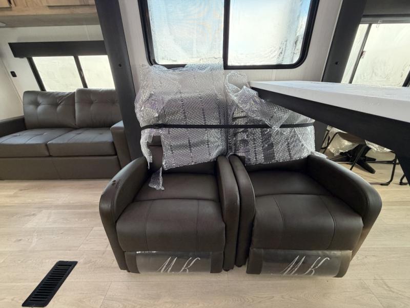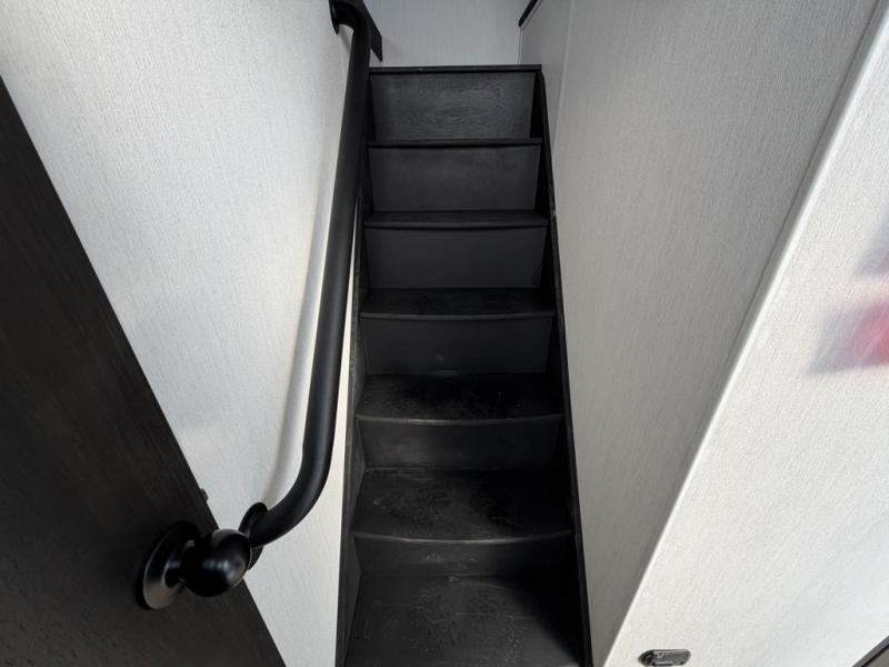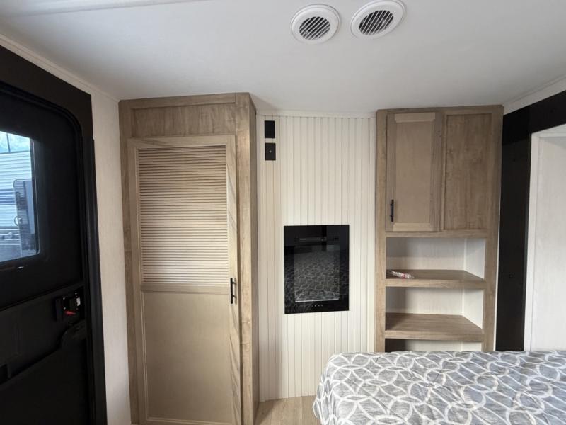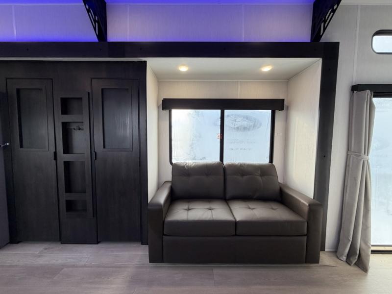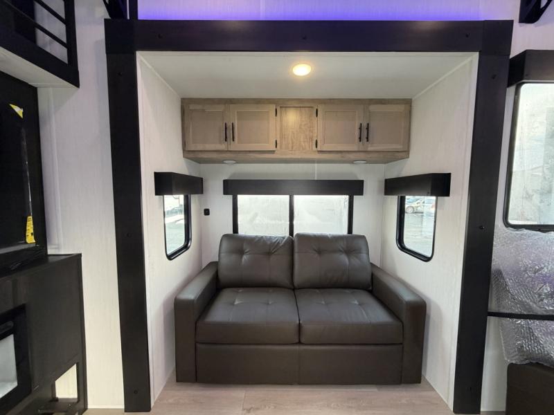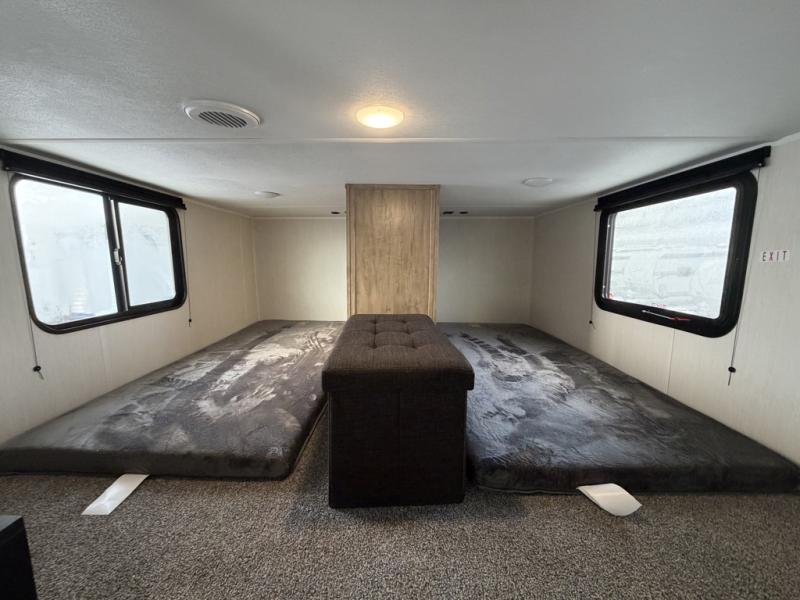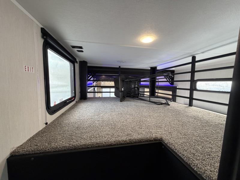 It won't be hard to find comfort in this front kitchen destination trailer! There is ample counter space to prep meals, a free-standing dinette with a slide out, plus a large pantry and 18 cu. ft. refrigerator for food storage. The bar top with stools overlooks the middle living area, where you'll also find dual hide-a-bed sofas and an entertainment center with a fireplace. The full bath includes a shower with a seat for more comfort, and one of the dual entry doors is right across from the bath so you can quickly get back outside. Head up the steps to the dual loft areas with two bunk mats and cabinets on one side, and an open area on the other, perfect for a play room or extra storage! And under the loft you'll find the rear private bedroom with a king bed slide, a wardrobe and an entertainment center, plus washer and dryer prep if you want to add these appliances!