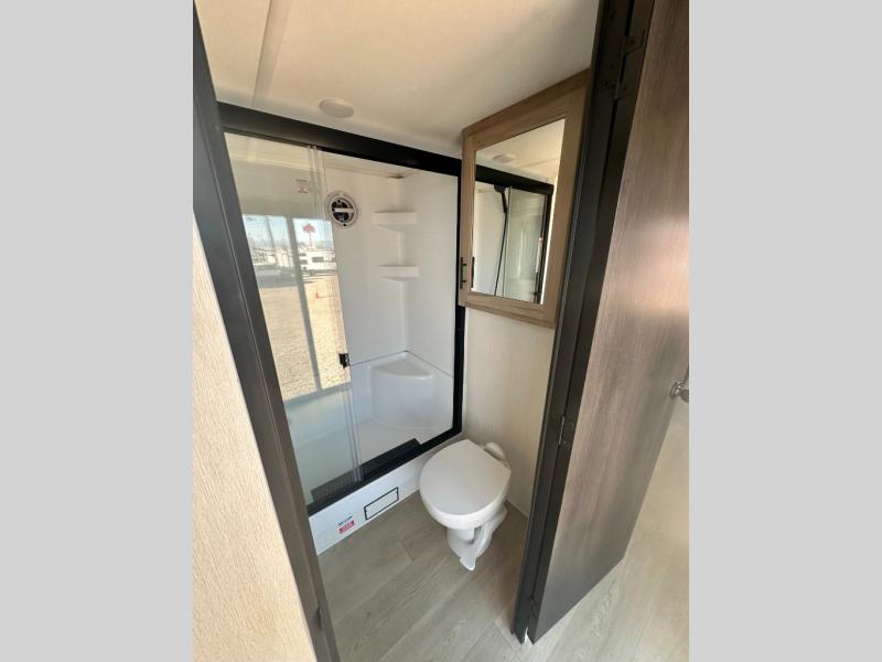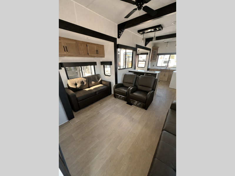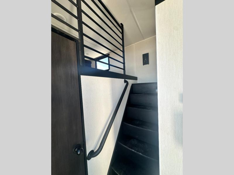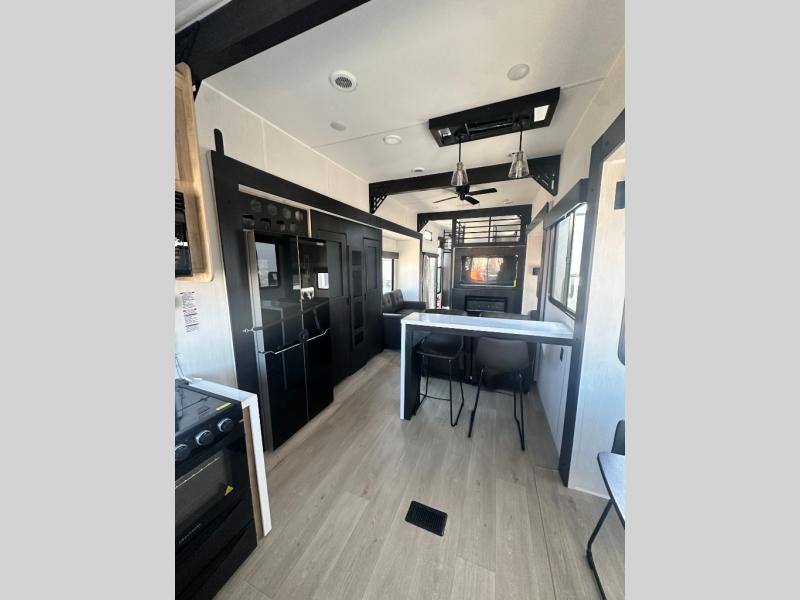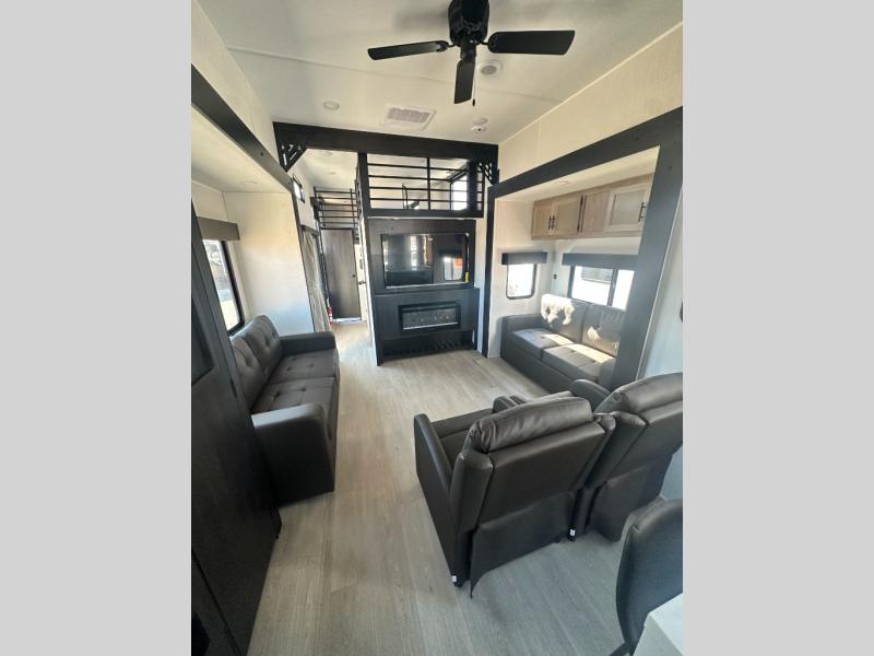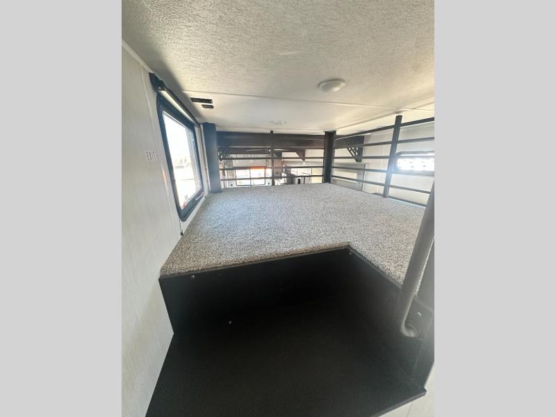 It won't be hard to find comfort in this front kitchen destination trailer! There is ample counter space to prep meals, a free-standing dinette with a slide out, plus a large pantry and 18 cu. ft. refrigerator for food storage. The bar top with stools overlooks the middle living area, where you'll also find dual hide-a-bed sofas and an entertainment center with a fireplace. The full bath includes a shower with a seat for more comfort, and one of the dual entry doors is right across from the bath so you can quickly get back outside. Head up the steps to the dual loft areas with two bunk mats and cabinets on one side, and an open area on the other, perfect for a play room or extra storage! And under the loft you'll find the rear private bedroom with a king bed slide, a wardrobe and an entertainment center, plus washer and dryer prep if you want to add these appliances!