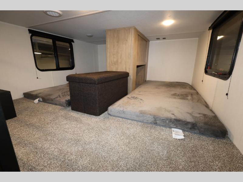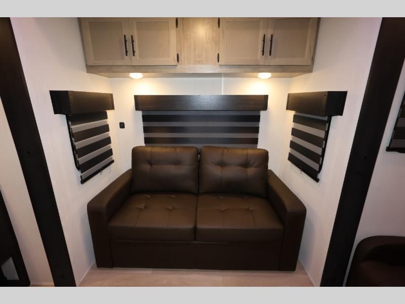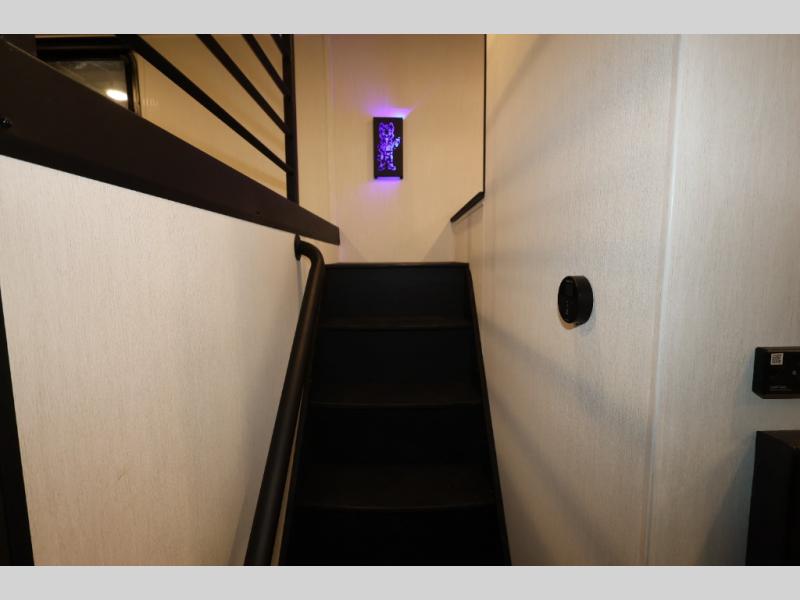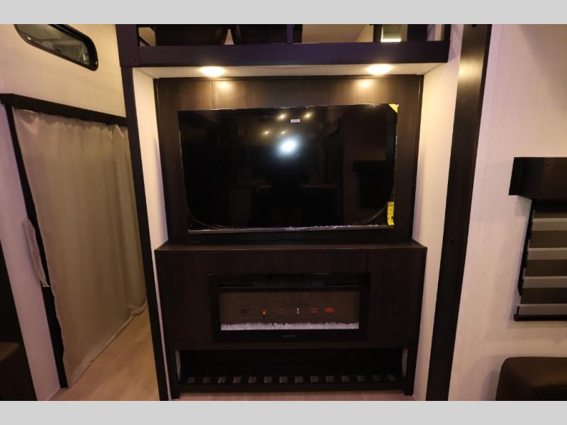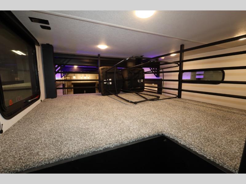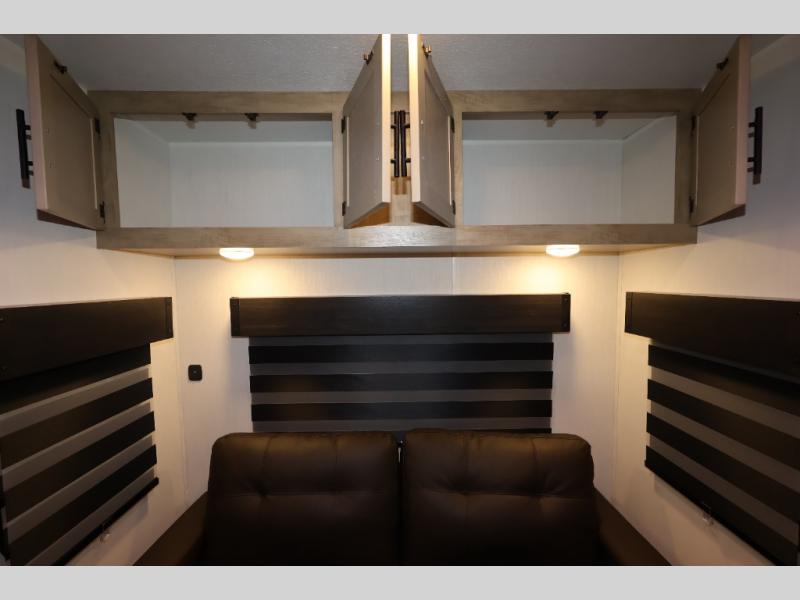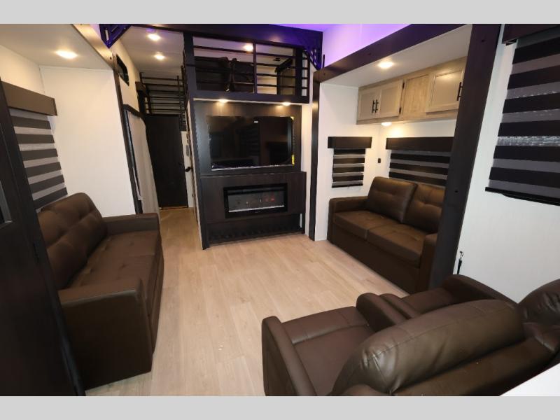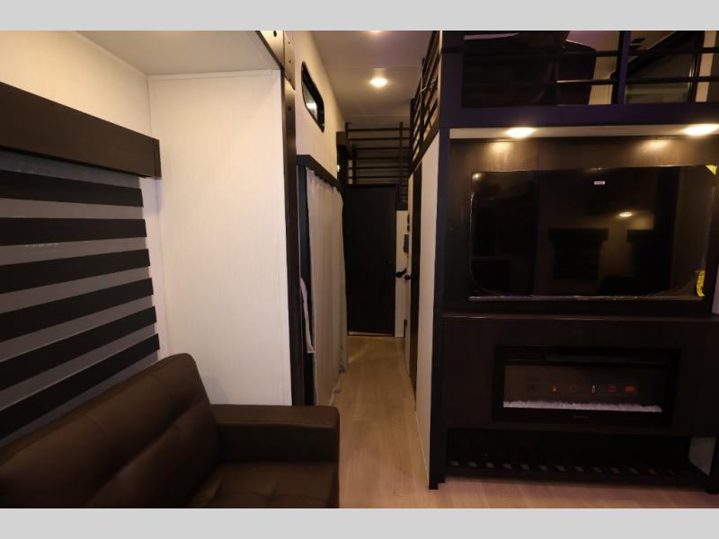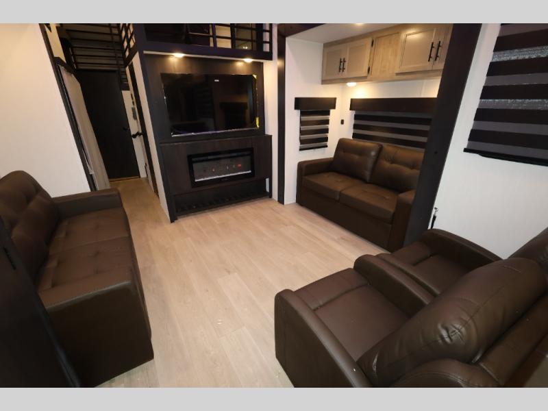 It won't be hard to find comfort in this front kitchen destination trailer! There is ample counter space to prep meals, a free-standing dinette with a slide out, plus a large pantry and 18 cu. ft. refrigerator for food storage. The bar top with stools overlooks the middle living area, where you'll also find dual hide-a-bed sofas and an entertainment center with a fireplace. The full bath includes a shower with a seat for more comfort, and one of the dual entry doors is right across from the bath so you can quickly get back outside. Head up the steps to the dual loft areas with two bunk mats and cabinets on one side, and an open area on the other, perfect for a play room or extra storage! And under the loft you'll find the rear private bedroom with a king bed slide, a wardrobe and an entertainment center, plus washer and dryer prep if you want to add these appliances!
