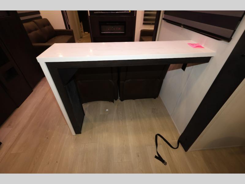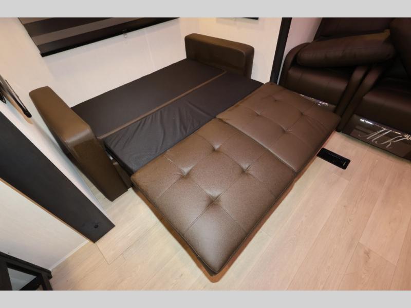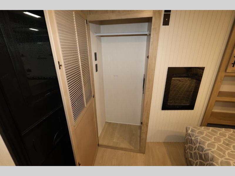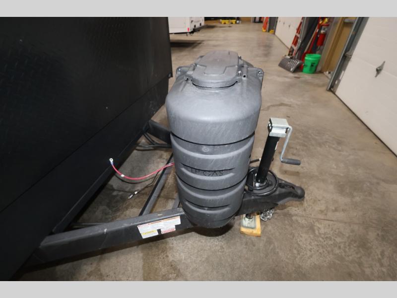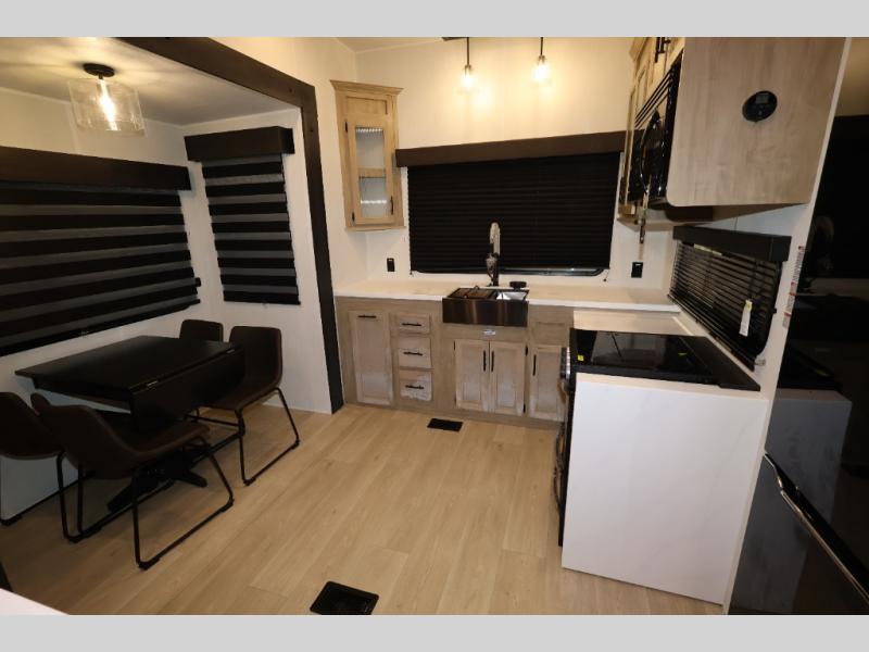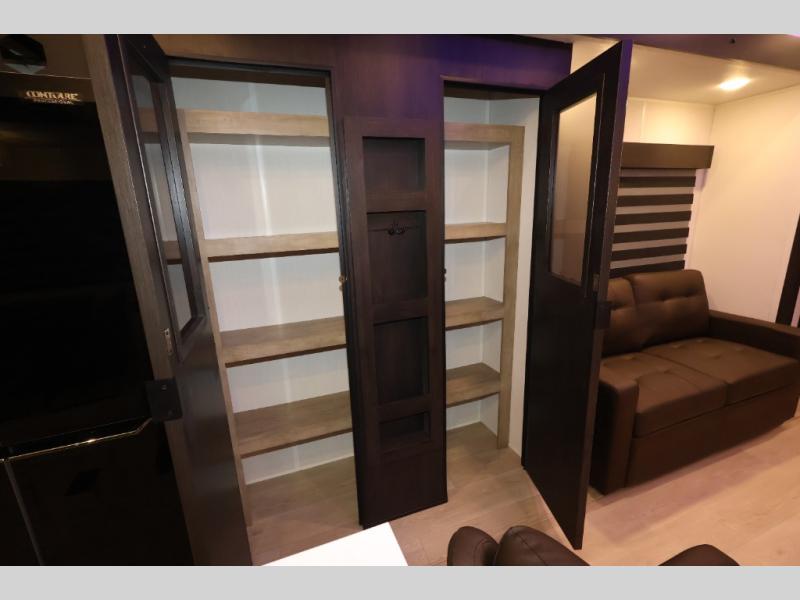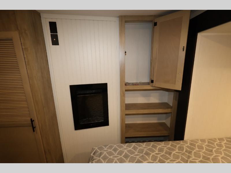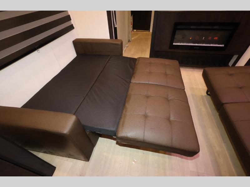 It won't be hard to find comfort in this front kitchen destination trailer! There is ample counter space to prep meals, a free-standing dinette with a slide out, plus a large pantry and 18 cu. ft. refrigerator for food storage. The bar top with stools overlooks the middle living area, where you'll also find dual hide-a-bed sofas and an entertainment center with a fireplace. The full bath includes a shower with a seat for more comfort, and one of the dual entry doors is right across from the bath so you can quickly get back outside. Head up the steps to the dual loft areas with two bunk mats and cabinets on one side, and an open area on the other, perfect for a play room or extra storage! And under the loft you'll find the rear private bedroom with a king bed slide, a wardrobe and an entertainment center, plus washer and dryer prep if you want to add these appliances!