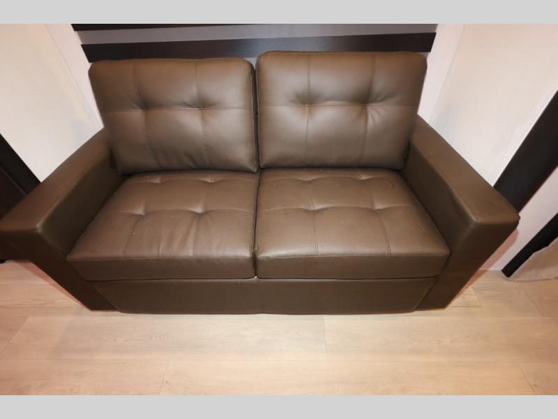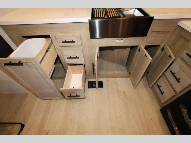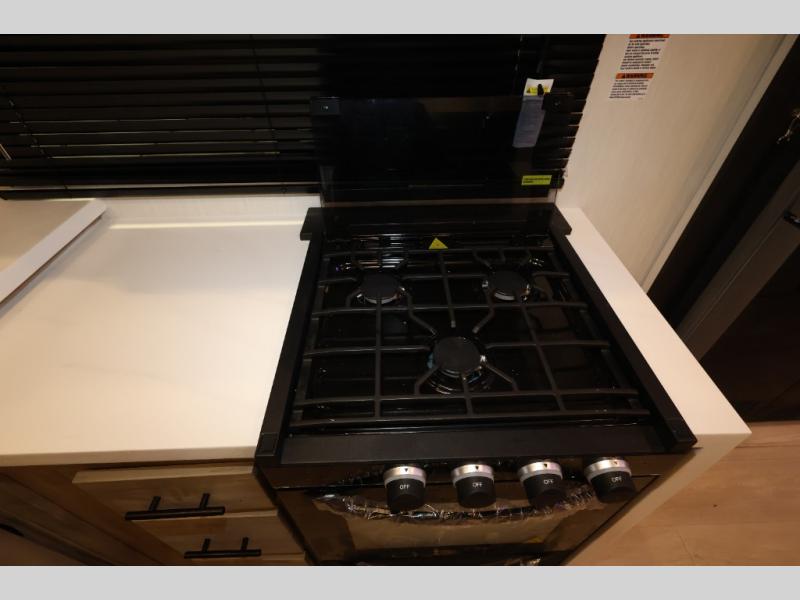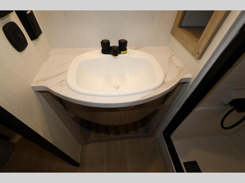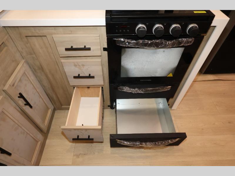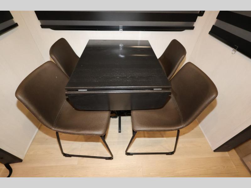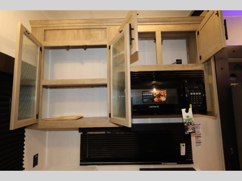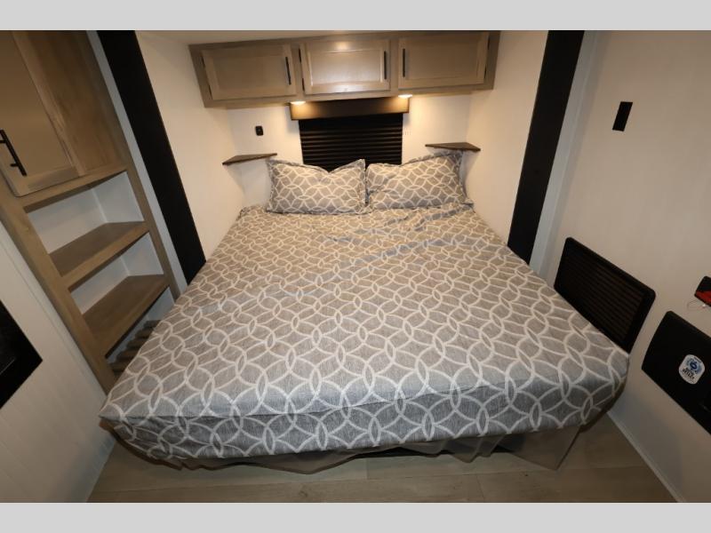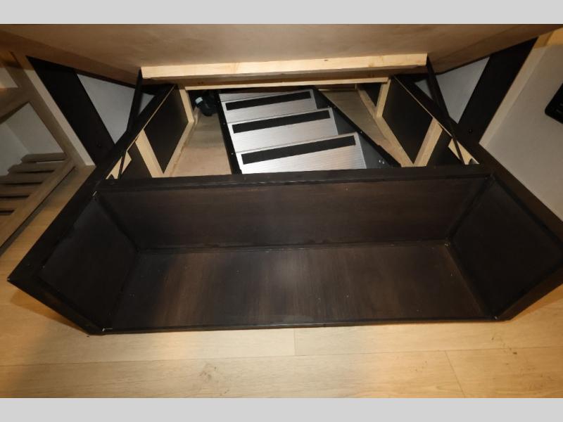 It won't be hard to find comfort in this front kitchen destination trailer! There is ample counter space to prep meals, a free-standing dinette with a slide out, plus a large pantry and 18 cu. ft. refrigerator for food storage. The bar top with stools overlooks the middle living area, where you'll also find dual hide-a-bed sofas and an entertainment center with a fireplace. The full bath includes a shower with a seat for more comfort, and one of the dual entry doors is right across from the bath so you can quickly get back outside. Head up the steps to the dual loft areas with two bunk mats and cabinets on one side, and an open area on the other, perfect for a play room or extra storage! And under the loft you'll find the rear private bedroom with a king bed slide, a wardrobe and an entertainment center, plus washer and dryer prep if you want to add these appliances!