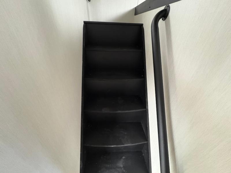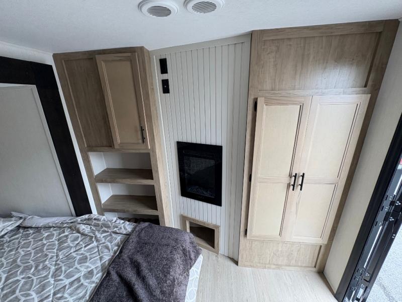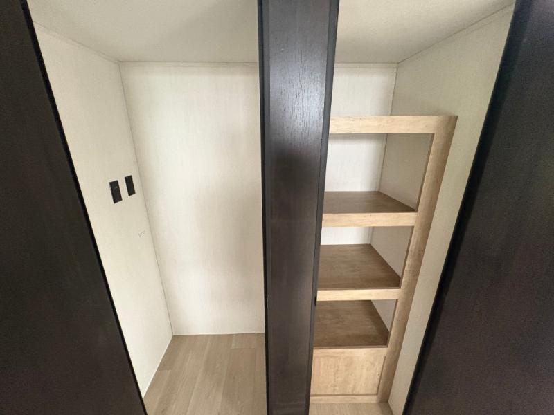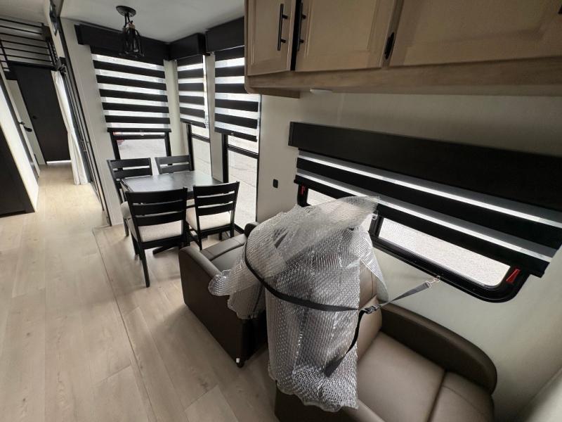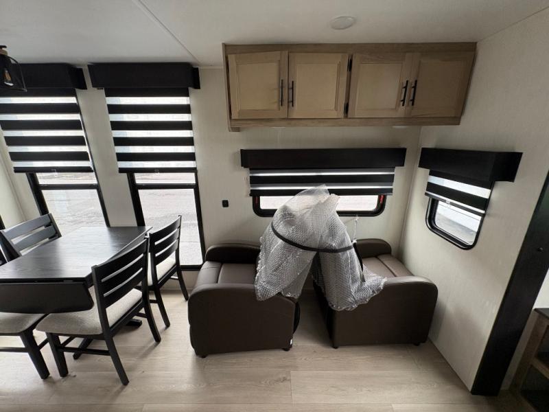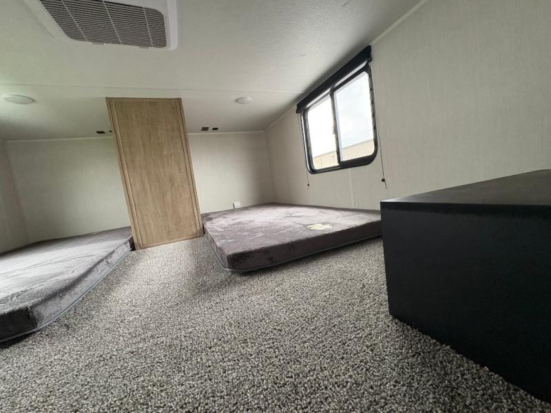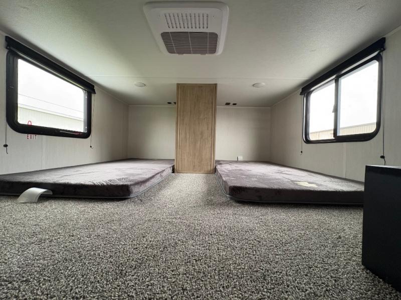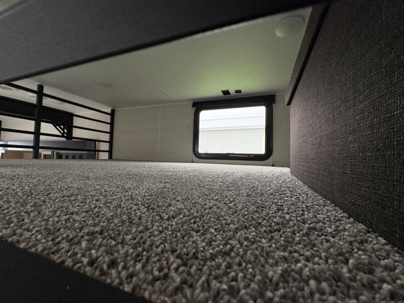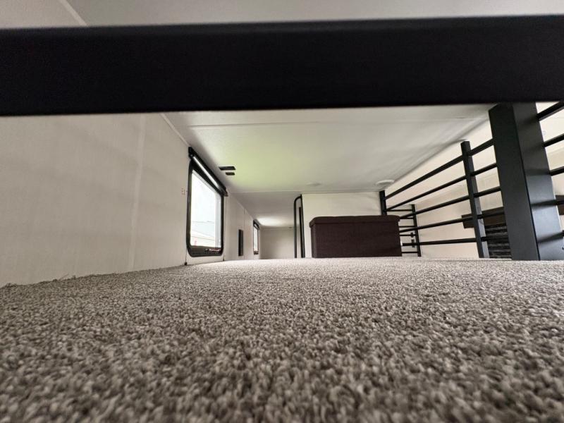 This destination trailer is an excellent and accommodating trailer that will make you feel right at home as soon as you enter through one of the two entry doors. The front private bedroom has a king bed slide and lots of storage with a wardrobe and a linen closet. There is also an entertainment center where you can add your own TV and the bedroom even has a second exterior entry door so that you can come and go as you please. Above the bedroom is where the huge loft is located. When you take the stairs up to the loft, you'll find two 36" x 74" bunk mats, cabinets, and a large open area with a railing. The main living area has a free-standing dinette with chairs, theater seats, and a hide-a-bed sofa, so you will have plenty of seating as you watch the main entertainment center.