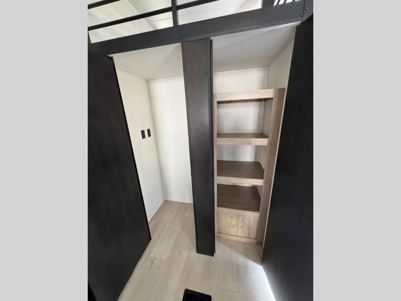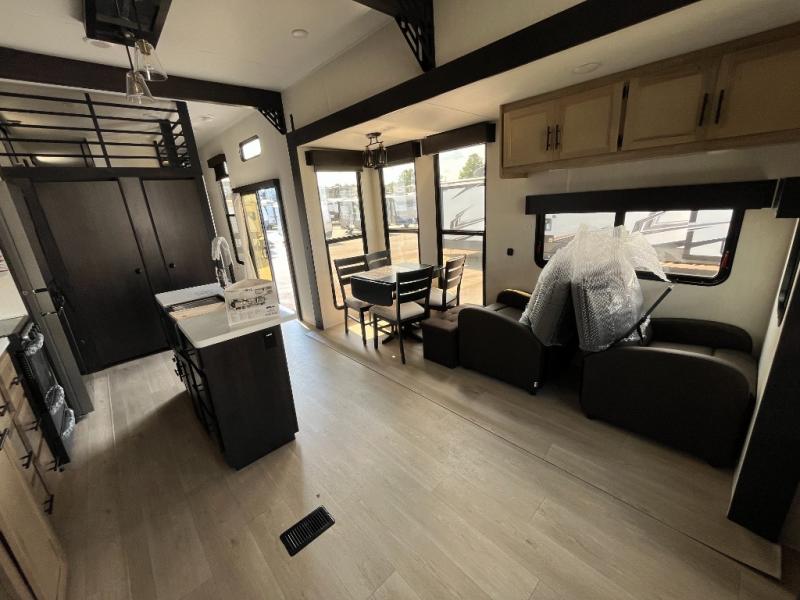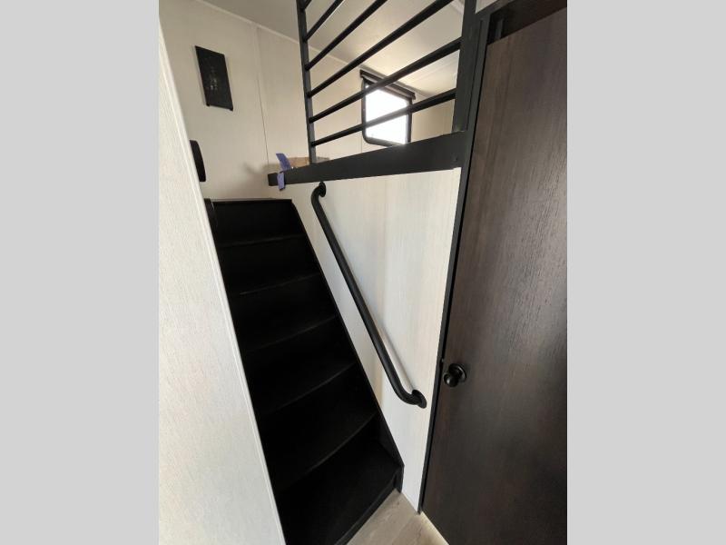 This destination trailer is an excellent and accommodating trailer that will make you feel right at home as soon as you enter through one of the two entry doors. The front private bedroom has a king bed slide and lots of storage with a wardrobe and a linen closet. There is also an entertainment center where you can add your own TV and the bedroom even has a second exterior entry door so that you can come and go as you please. Above the bedroom is where the huge loft is located. When you take the stairs up to the loft, you'll find two 36" x 74" bunk mats, cabinets, and a large open area with a railing. The main living area has a free-standing dinette with chairs, theater seats, and a hide-a-bed sofa, so you will have plenty of seating as you watch the main entertainment center.