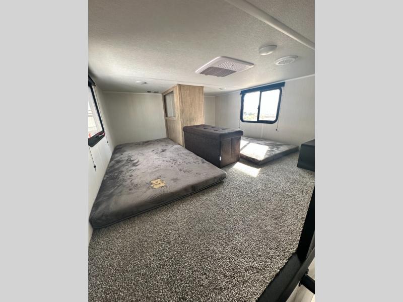 This destination trailer is an excellent and accommodating trailer that will make you feel right at home as soon as you enter through one of the two entry doors. The front private bedroom has a king bed slide and lots of storage with a wardrobe and a linen closet. There is also an entertainment center where you can add your own TV and the bedroom even has a second exterior entry door so that you can come and go as you please. Above the bedroom is where the huge loft is located. When you take the stairs up to the loft, you'll find two 36" x 74" bunk mats, cabinets, and a large open area with a railing. The main living area has a free-standing dinette with chairs, theater seats, and a hide-a-bed sofa, so you will have plenty of seating as you watch the main entertainment center.