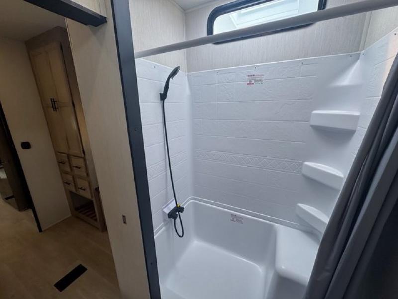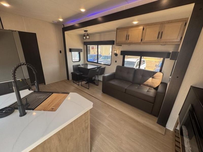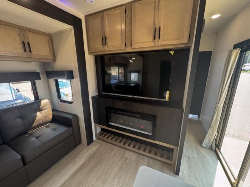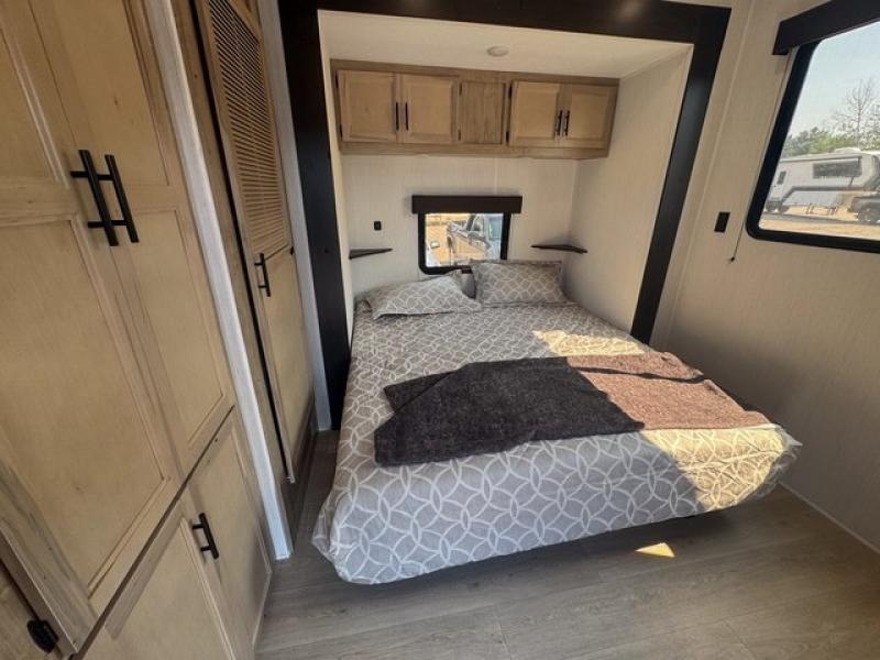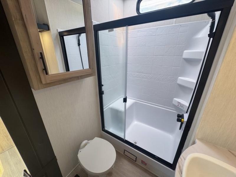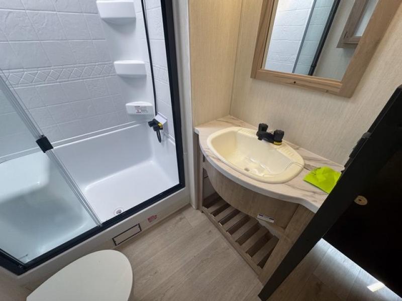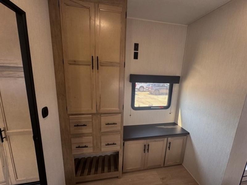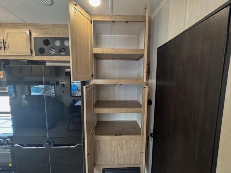 Spacious and comfortable is how you will describe this destination travel trailer featuring triple slides, two full baths, and a spacious combined kitchen and living area thanks to the large slide here featuring a free standing dinette and sofa. The kitchen includes everything you need to comfortably cook while you are away, and allows you to make meals for your family just like at home. There is a large pantry where you can keep plenty of snacks and dry goods for your trip. In the rear of the coach, there is a private bedroom featuring a queen bed slide for added space, comfortable sleeping, as well as ample storage between a dresser and wardrobe for your clothing. In the very back, a master suite bath featuring a vanity with sink, a shower with a seat, and linen storage for your towels and toiletries. This front bedroom also features a king bed slide!
