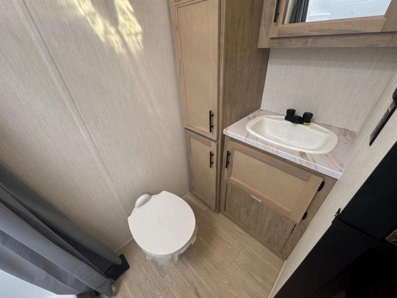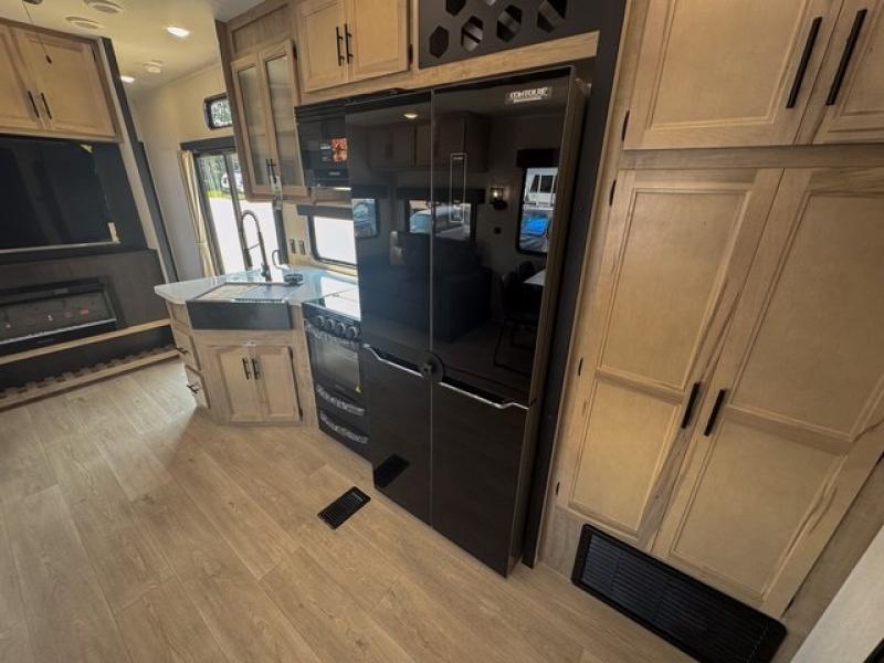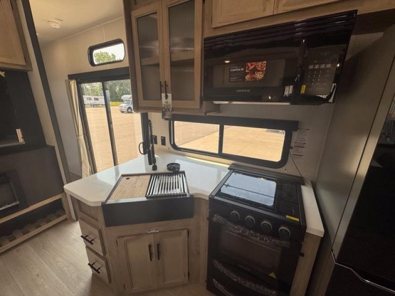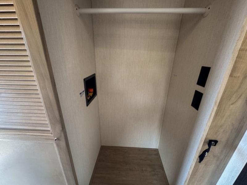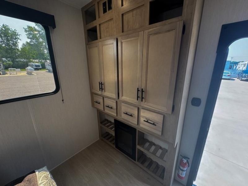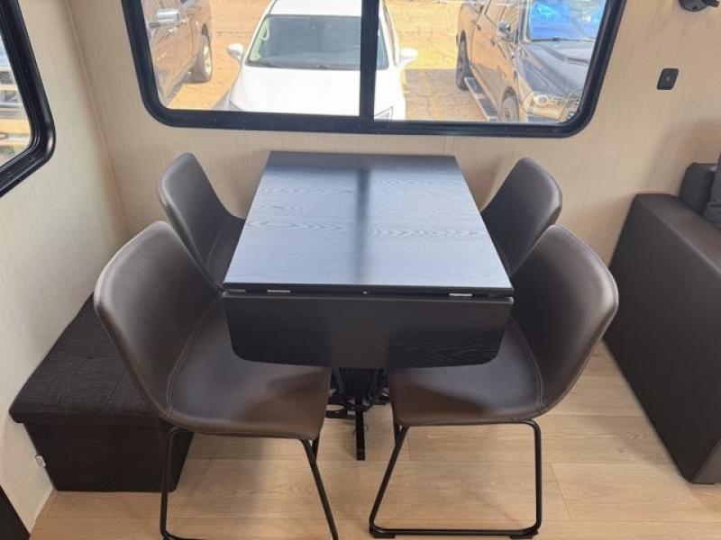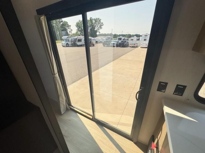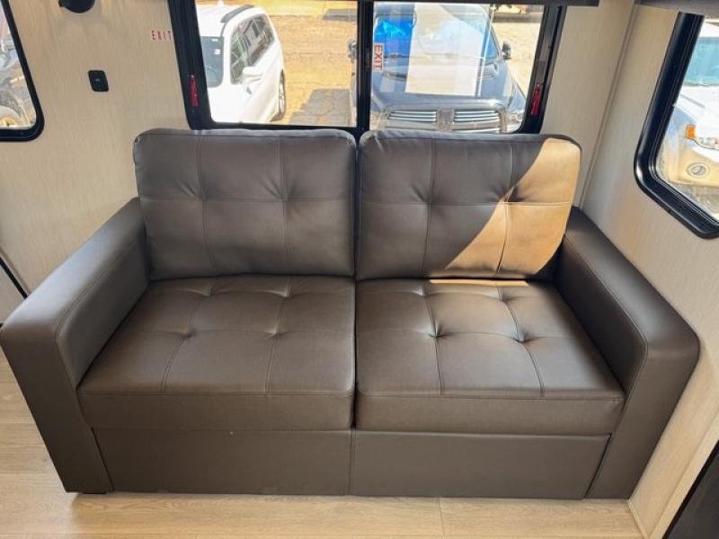 Spacious and comfortable is how you will describe this destination travel trailer featuring triple slides, two full baths, and a spacious combined kitchen and living area thanks to the large slide here featuring a free standing dinette and sofa. The kitchen includes everything you need to comfortably cook while you are away, and allows you to make meals for your family just like at home. There is a large pantry where you can keep plenty of snacks and dry goods for your trip. In the rear of the coach, there is a private bedroom featuring a queen bed slide for added space, comfortable sleeping, as well as ample storage between a dresser and wardrobe for your clothing. In the very back, a master suite bath featuring a vanity with sink, a shower with a seat, and linen storage for your towels and toiletries. This front bedroom also features a king bed slide!