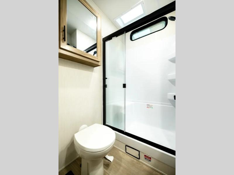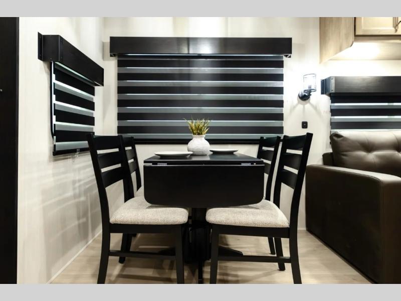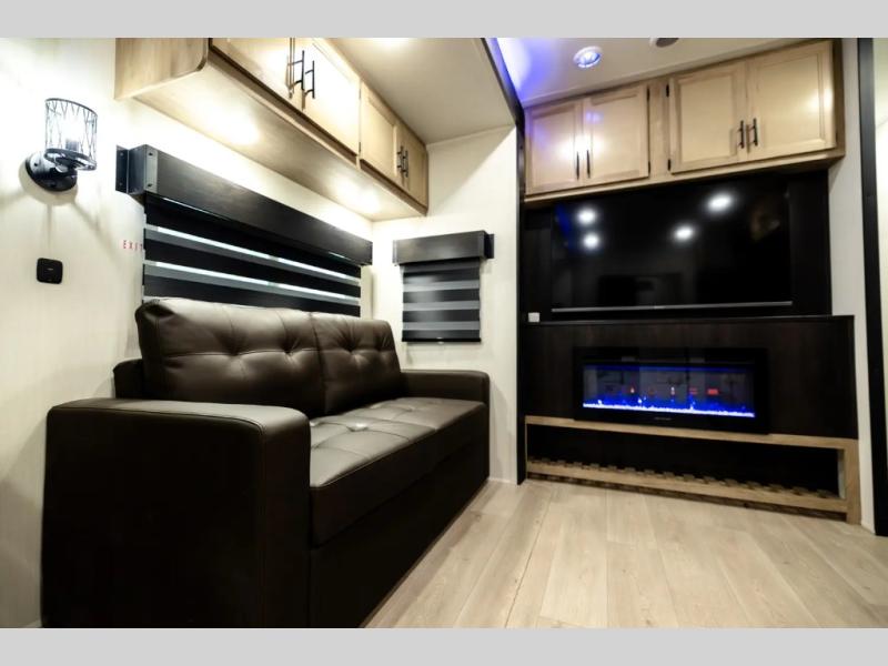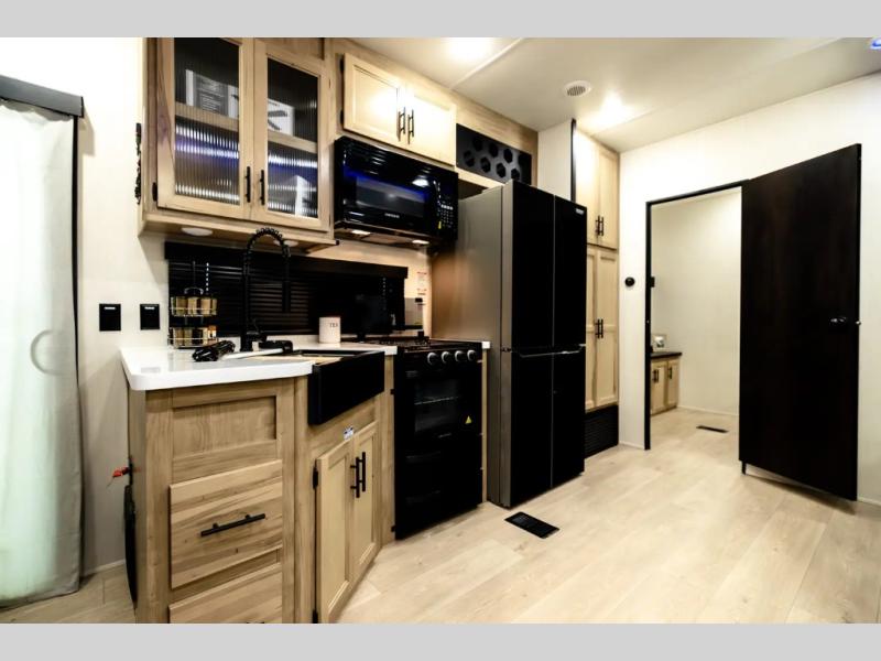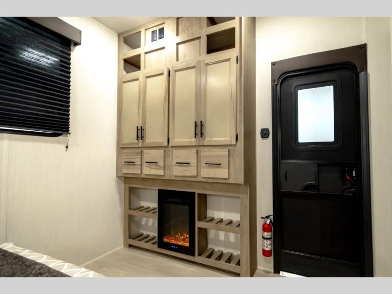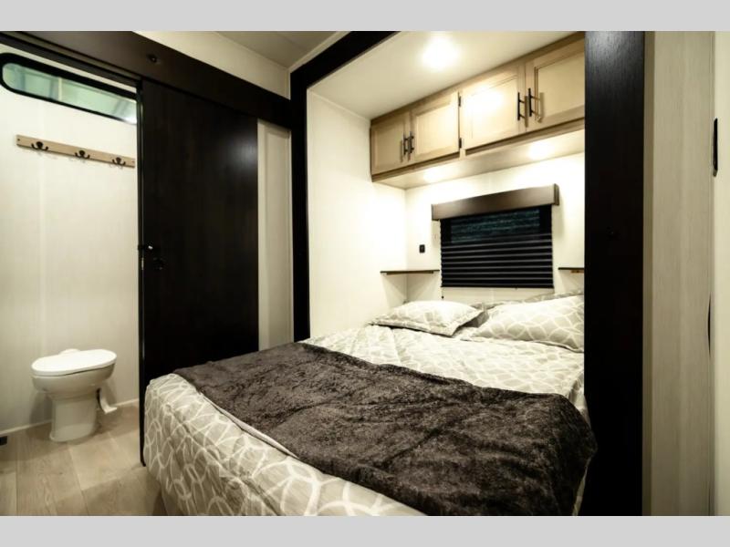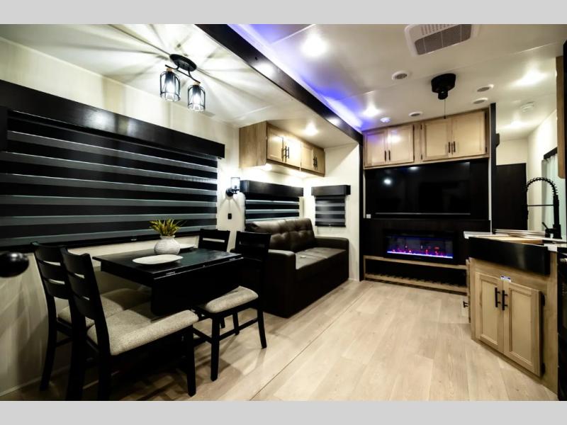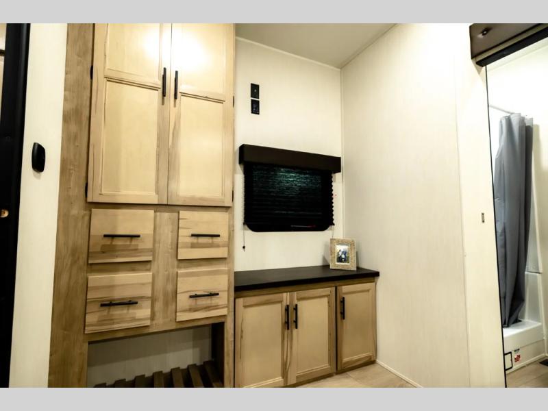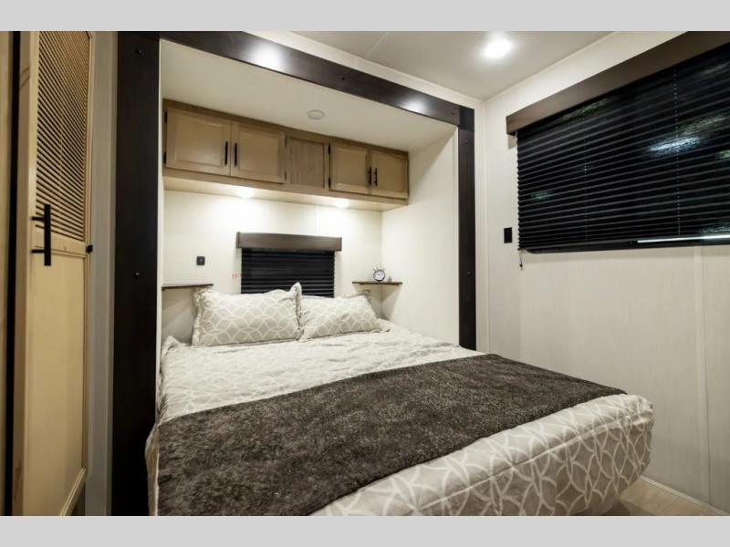 Spacious and comfortable is how you will describe this destination travel trailer featuring triple slides, two full baths, and a spacious combined kitchen and living area thanks to the large slide here featuring a free standing dinette and sofa. The kitchen includes everything you need to comfortably cook while you are away, and allows you to make meals for your family just like at home. There is a large pantry where you can keep plenty of snacks and dry goods for your trip. In the rear of the coach, there is a private bedroom featuring a queen bed slide for added space, comfortable sleeping, as well as ample storage between a dresser and wardrobe for your clothing. In the very back, a master suite bath featuring a vanity with sink, a shower with a seat, and linen storage for your towels and toiletries. This front bedroom also features a king bed slide!