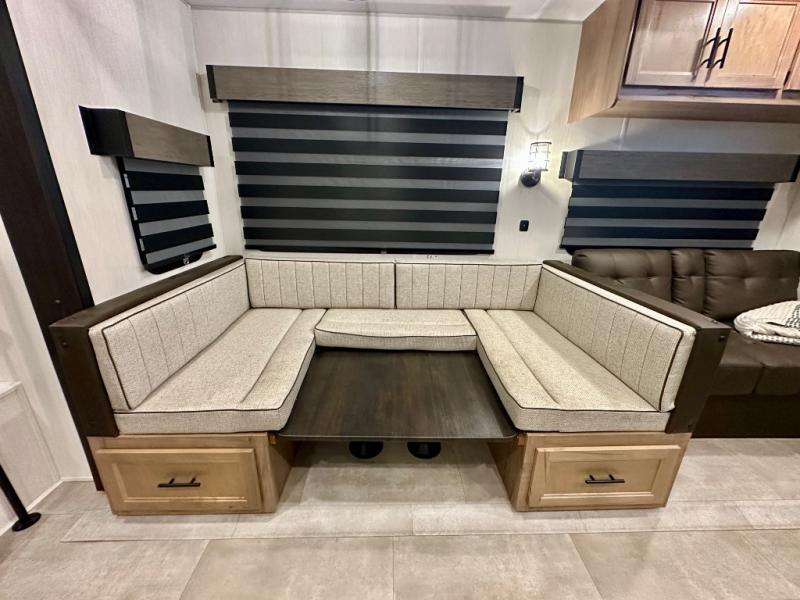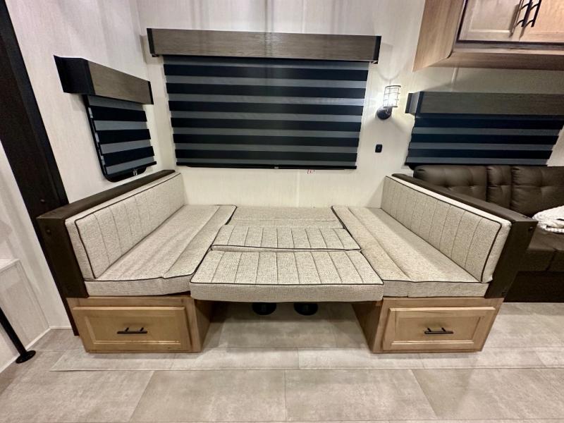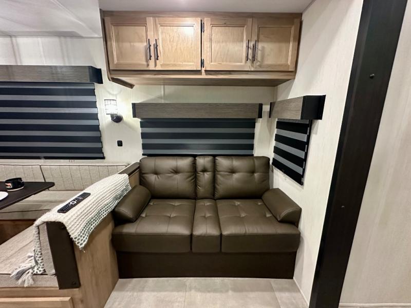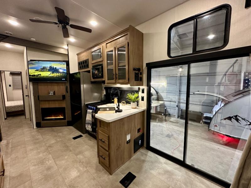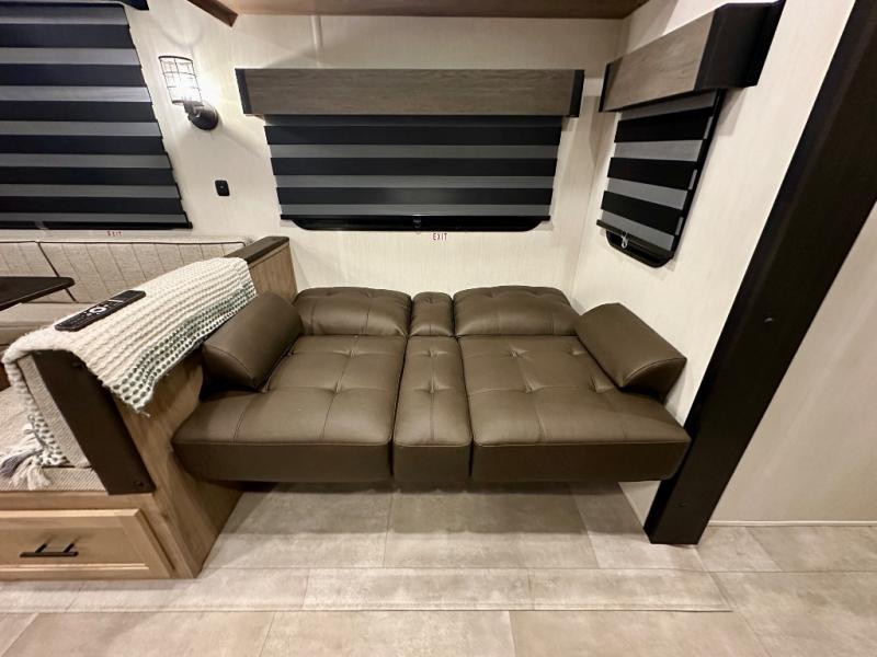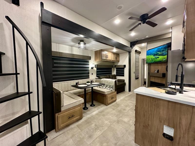 If you enjoy camping with a larger group, this destination trailer has everything you need! The front private bedroom includes an RV king bed slide, one of the dual entry doors, ample storage space, and bedroom fireplace with a TV mount if you want to add entertainment. And a full bath is right next to the bedroom for easy nighttime use. Your guests can take the rear den which includes a sofa slide out, storage space, and the second full bath for added convenience. There is also a loft above the den for even more sleeping space! In the morning, everyone can meet in the combined kitchen and living room while the chef makes breakfast, and there is a U-shaped dinette and sofa for comfy seating space. The huge side patio here will let the morning sunshine in, helping you all wake up to face the day!