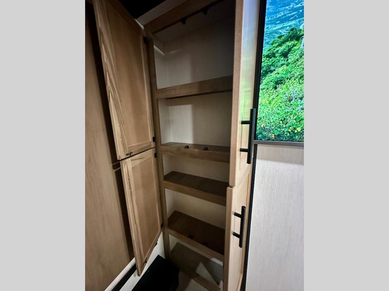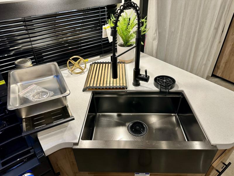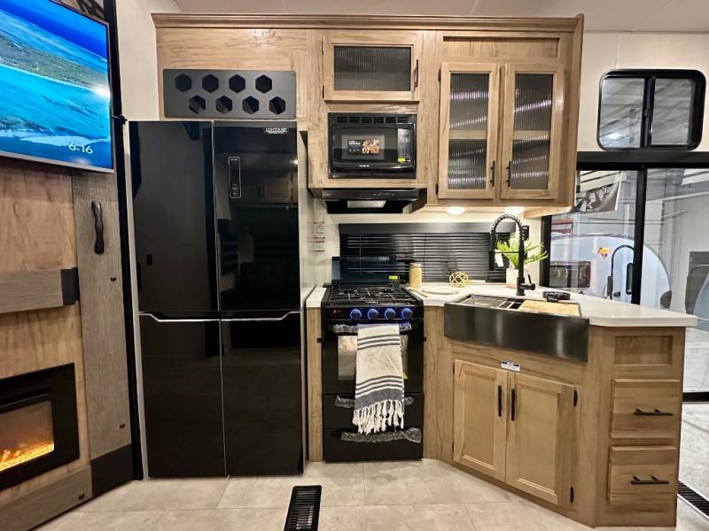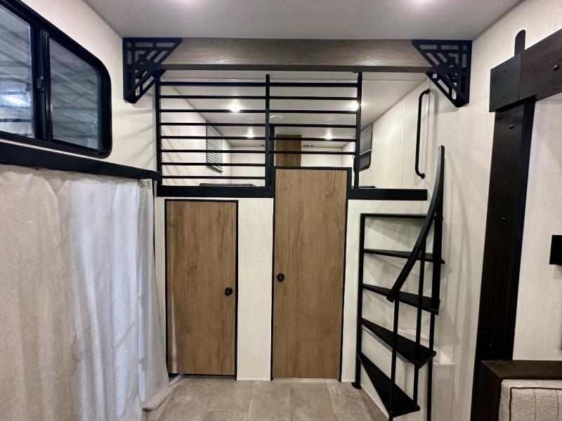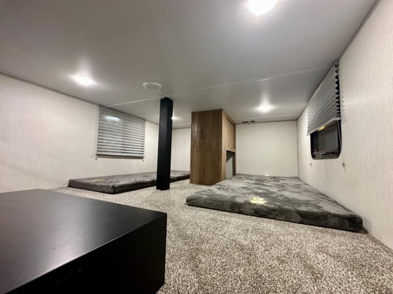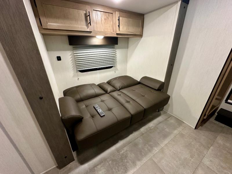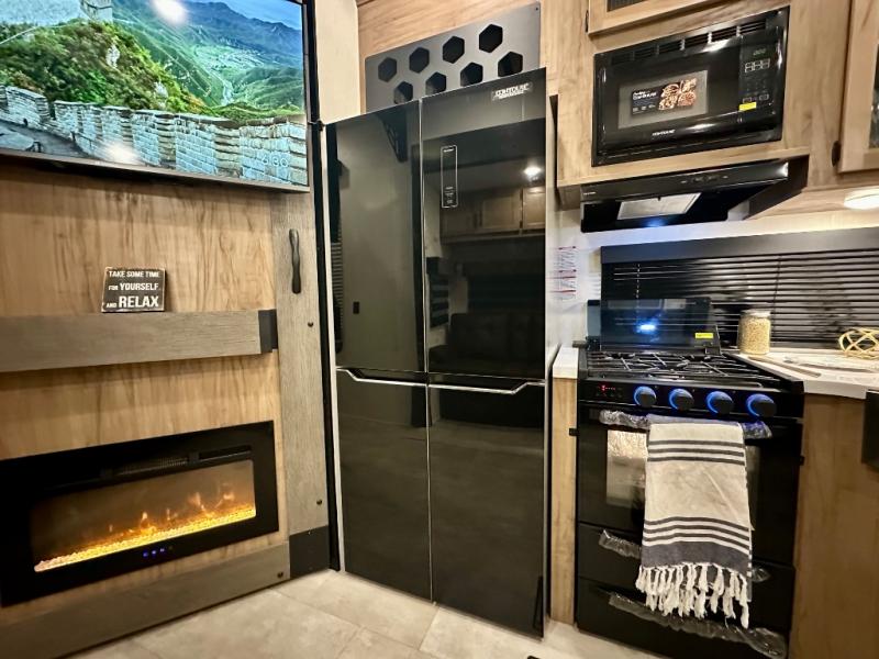 If you enjoy camping with a larger group, this destination trailer has everything you need! The front private bedroom includes an RV king bed slide, one of the dual entry doors, ample storage space, and bedroom fireplace with a TV mount if you want to add entertainment. And a full bath is right next to the bedroom for easy nighttime use. Your guests can take the rear den which includes a sofa slide out, storage space, and the second full bath for added convenience. There is also a loft above the den for even more sleeping space! In the morning, everyone can meet in the combined kitchen and living room while the chef makes breakfast, and there is a U-shaped dinette and sofa for comfy seating space. The huge side patio here will let the morning sunshine in, helping you all wake up to face the day!