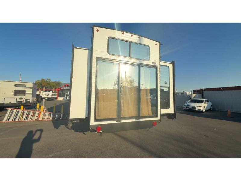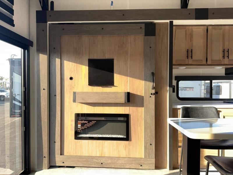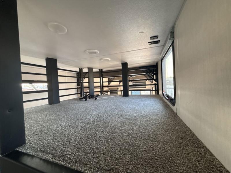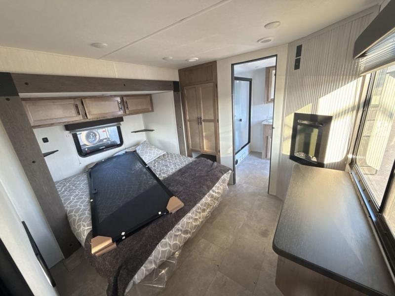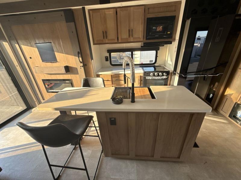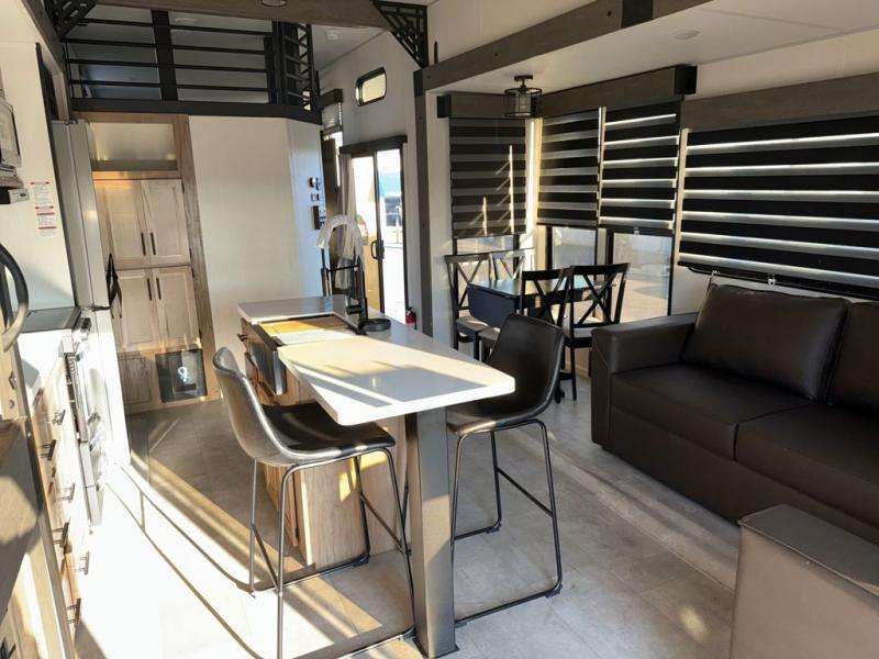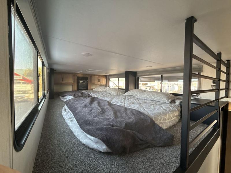 Choosing this destination trailer as your next RV won't be a hard decision! You can enter in through the front bath that includes dual bath sinks, a shower with a seat, and a medicine cabinet for your necessities. The master bedroom is connected to this bath for added convenience, and you're sure to enjoy the bedroom fireplace and king bed slide out. Just outside this room are the stairs that lead to the loft where you'll find two queen-size beds on one side and an open area where the kids can play or to use as storage. A second full bath is found next the stairs on the lower level, and there is a wardrobe with washer/dryer prep if you want to add these appliances. Everyone will love to join together and visit in the combined kitchen and living room. Here, you'll find a free-standing dinette, an L-shaped sofa, a kitchen island with two chairs, plus an entertainment center with a fireplace! The hidden pantry behind the fireplace will let you keep food stocked, and the rear patio doors will let natural light in!