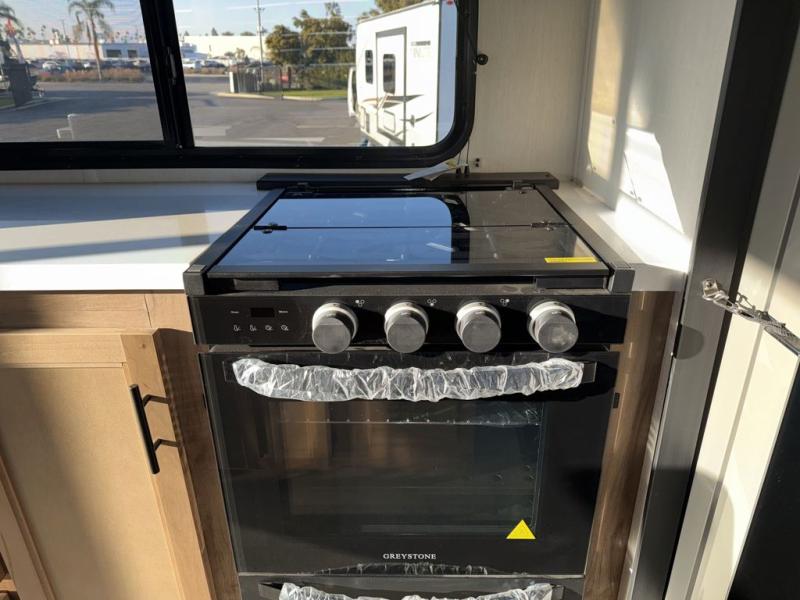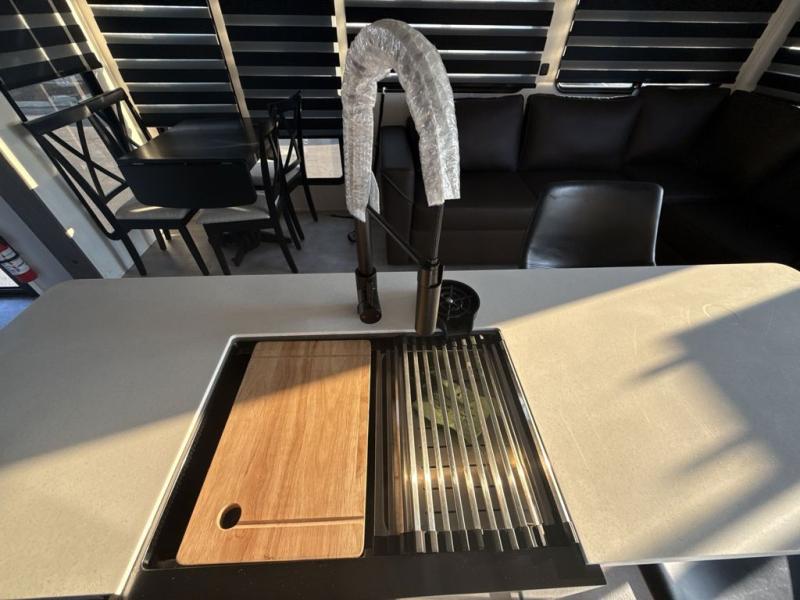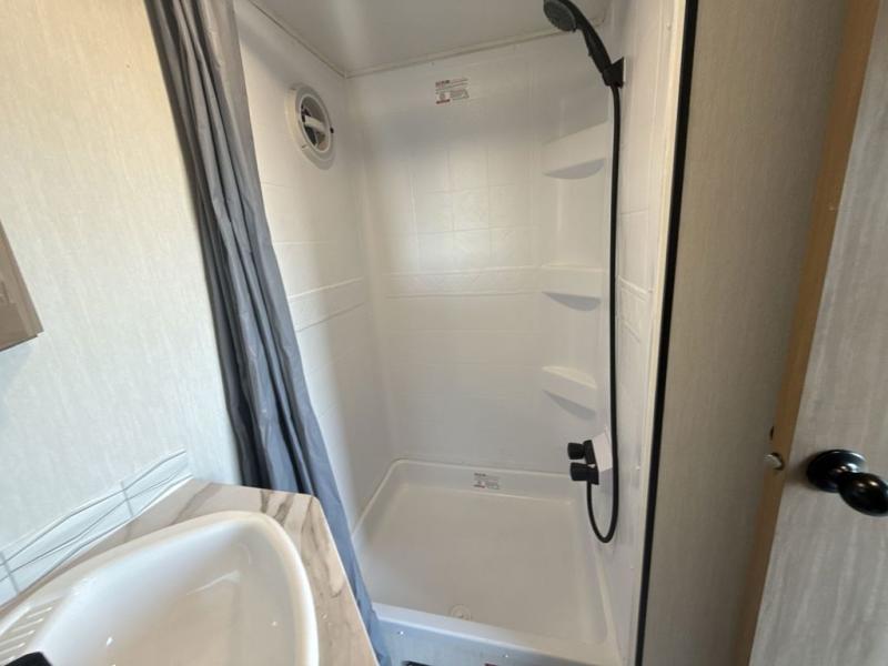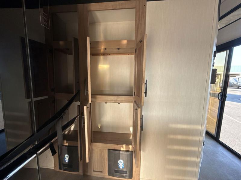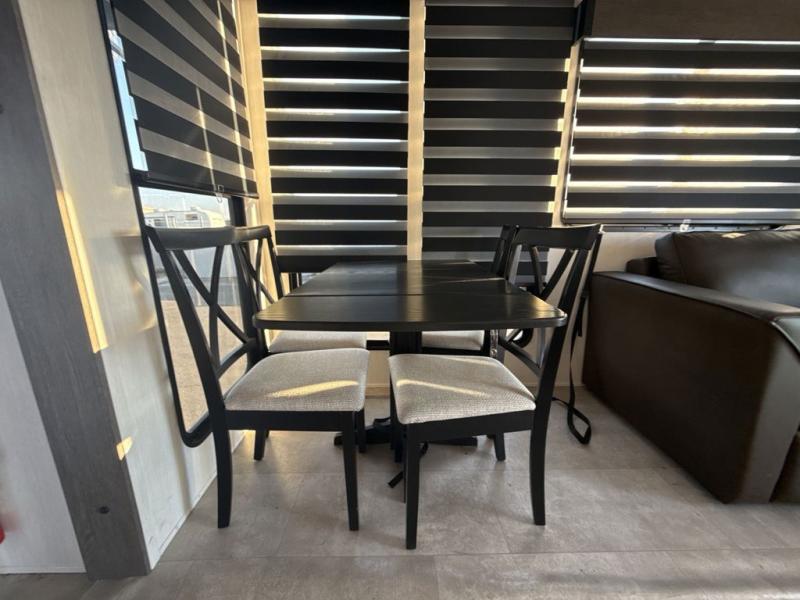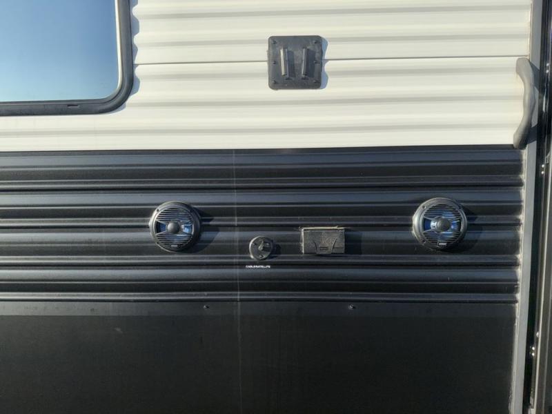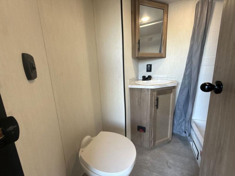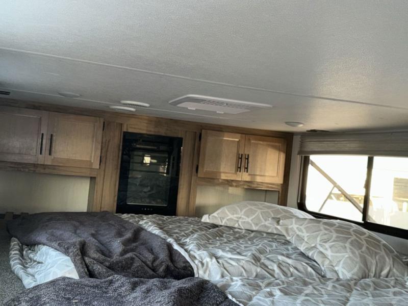 Choosing this destination trailer as your next RV won't be a hard decision! You can enter in through the front bath that includes dual bath sinks, a shower with a seat, and a medicine cabinet for your necessities. The master bedroom is connected to this bath for added convenience, and you're sure to enjoy the bedroom fireplace and king bed slide out. Just outside this room are the stairs that lead to the loft where you'll find two queen-size beds on one side and an open area where the kids can play or to use as storage. A second full bath is found next the stairs on the lower level, and there is a wardrobe with washer/dryer prep if you want to add these appliances. Everyone will love to join together and visit in the combined kitchen and living room. Here, you'll find a free-standing dinette, an L-shaped sofa, a kitchen island with two chairs, plus an entertainment center with a fireplace! The hidden pantry behind the fireplace will let you keep food stocked, and the rear patio doors will let natural light in!