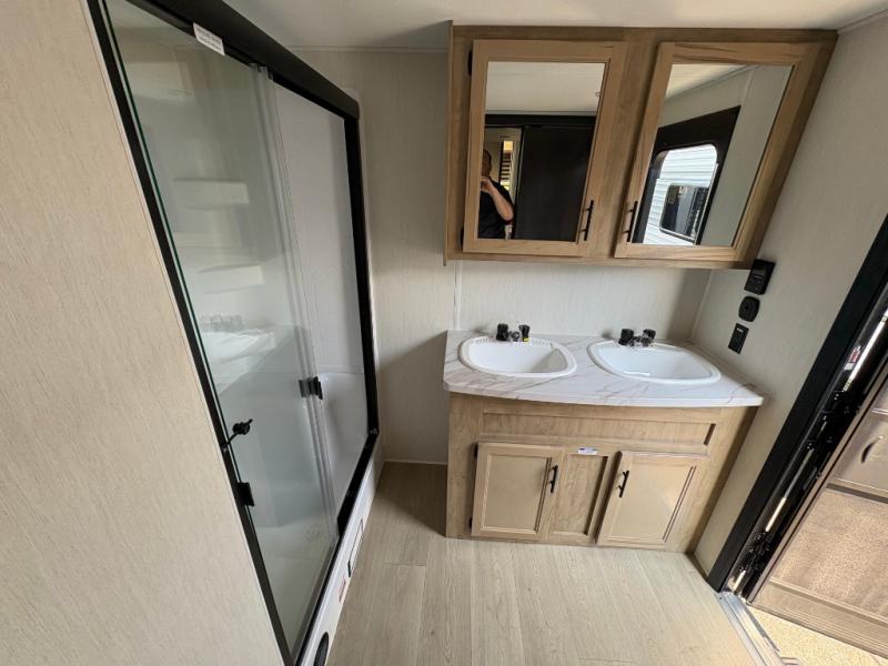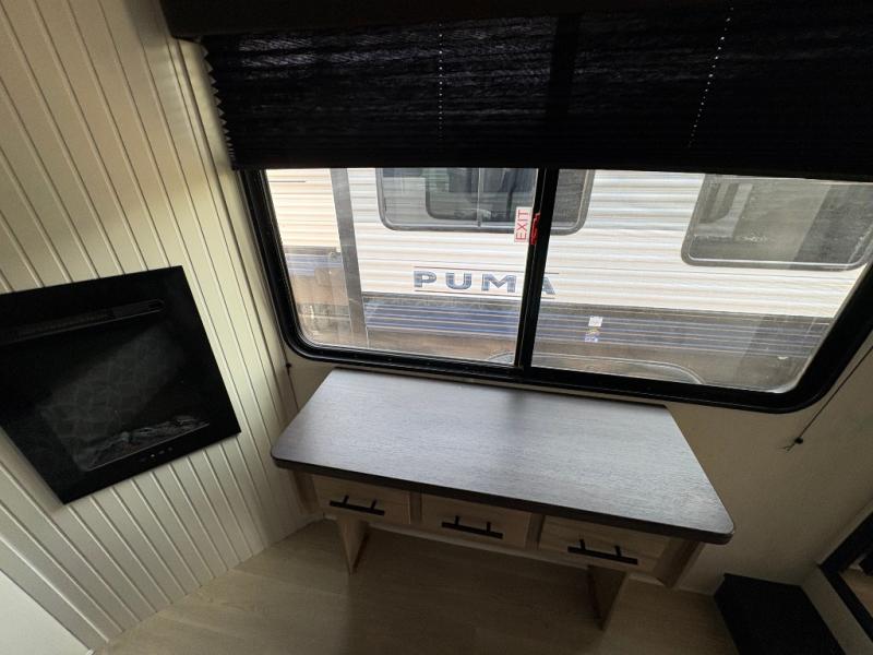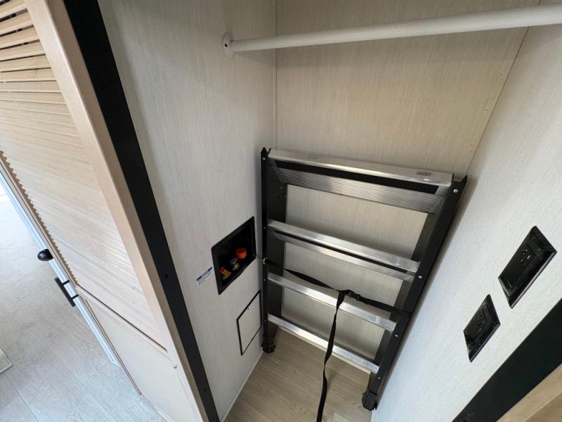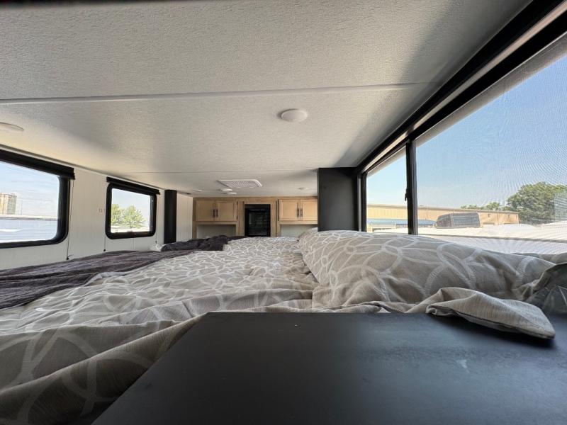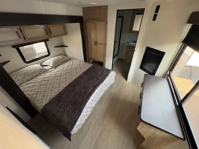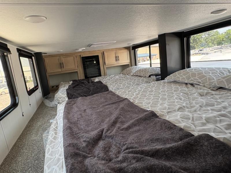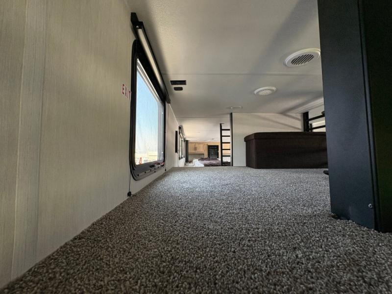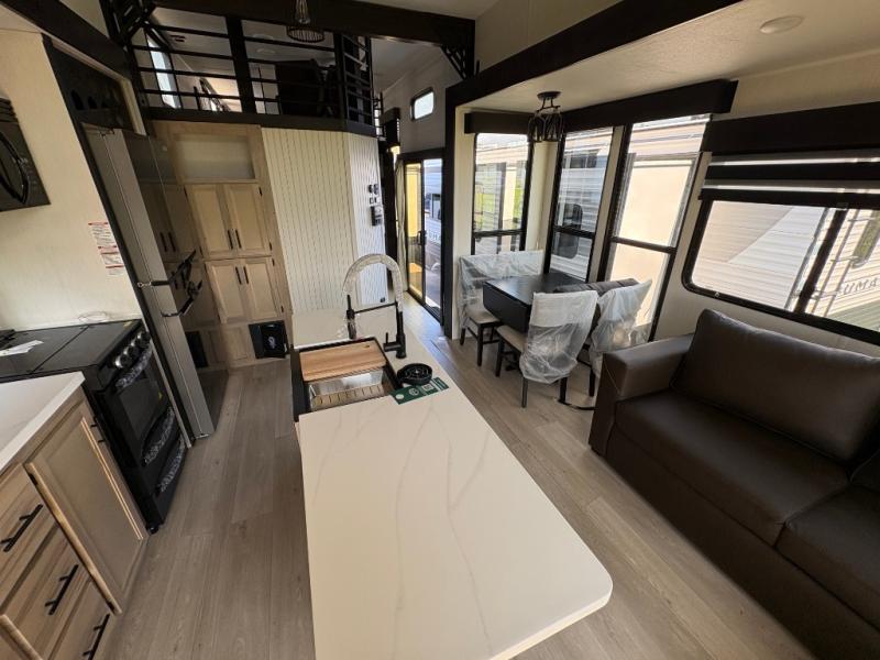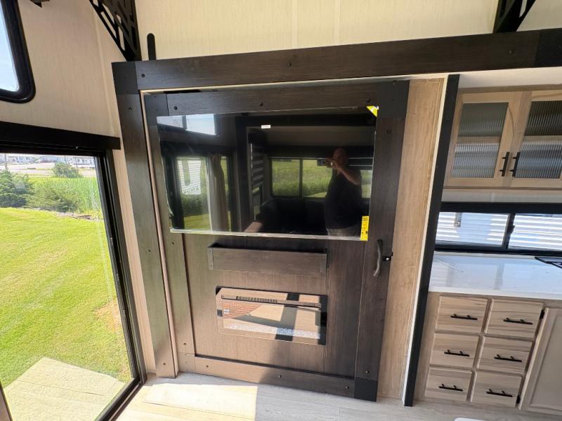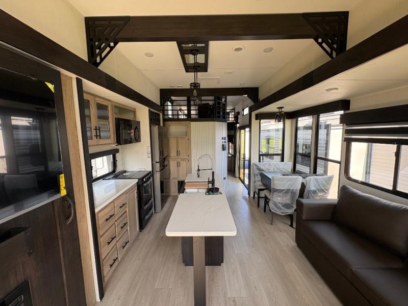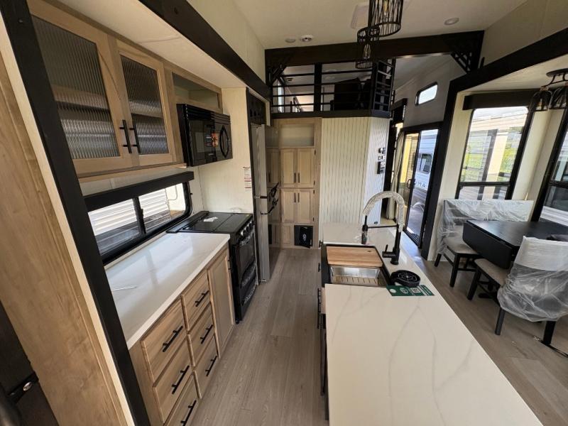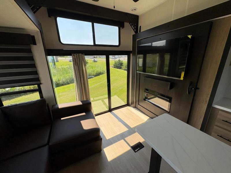 Choosing this destination trailer as your next RV won't be a hard decision! You can enter in through the front bath that includes dual bath sinks, a shower with a seat, and a medicine cabinet for your necessities. The master bedroom is connected to this bath for added convenience, and you're sure to enjoy the bedroom fireplace and king bed slide out. Just outside this room are the stairs that lead to the loft where you'll find two queen-size beds on one side and an open area where the kids can play or to use as storage. A second full bath is found next the stairs on the lower level, and there is a wardrobe with washer/dryer prep if you want to add these appliances. Everyone will love to join together and visit in the combined kitchen and living room. Here, you'll find a free-standing dinette, an L-shaped sofa, a kitchen island with two chairs, plus an entertainment center with a fireplace! The hidden pantry behind the fireplace will let you keep food stocked, and the rear patio doors will let natural light in!