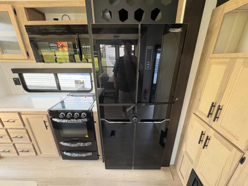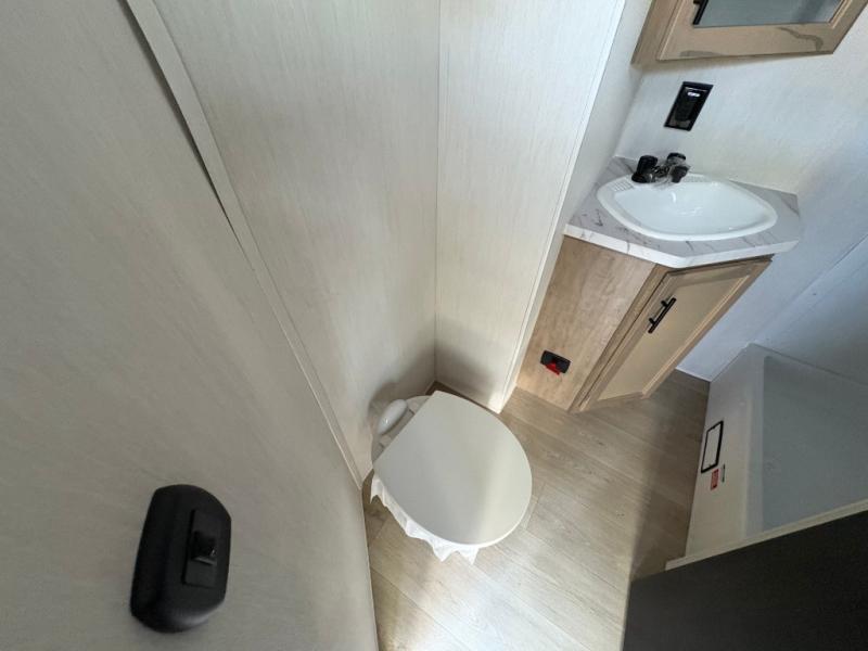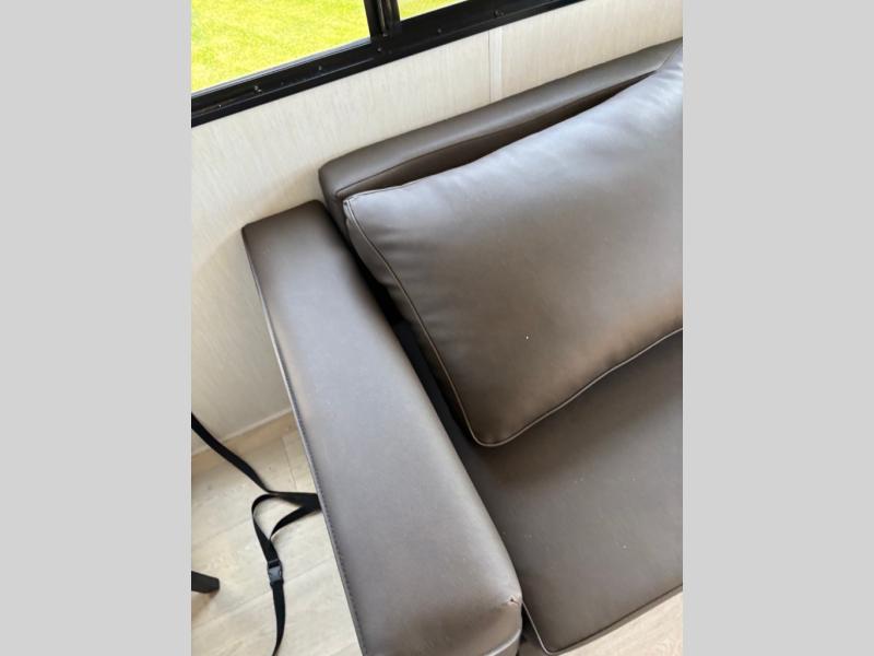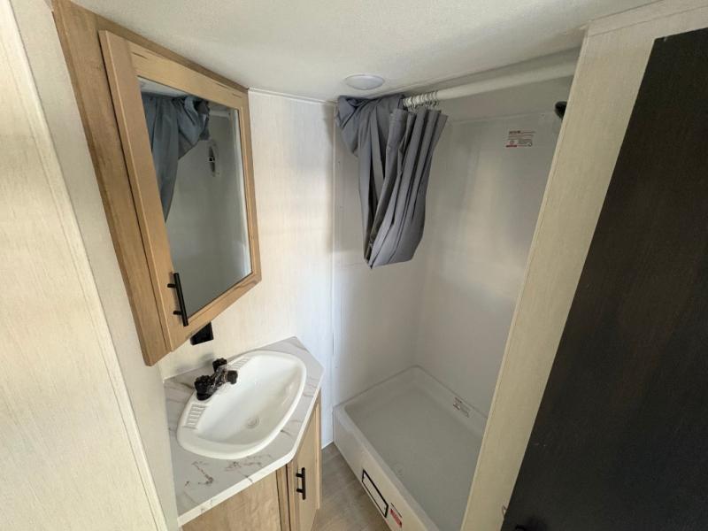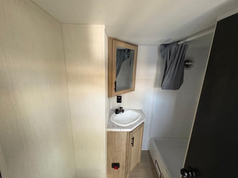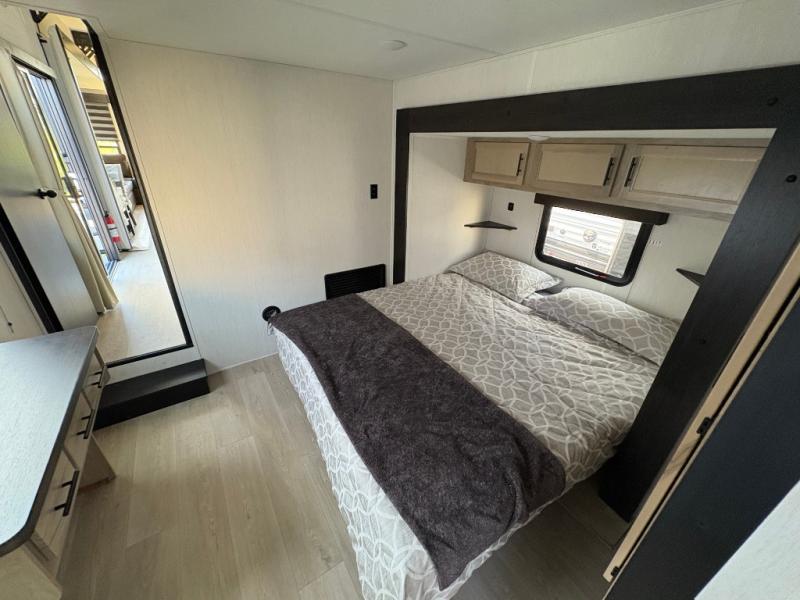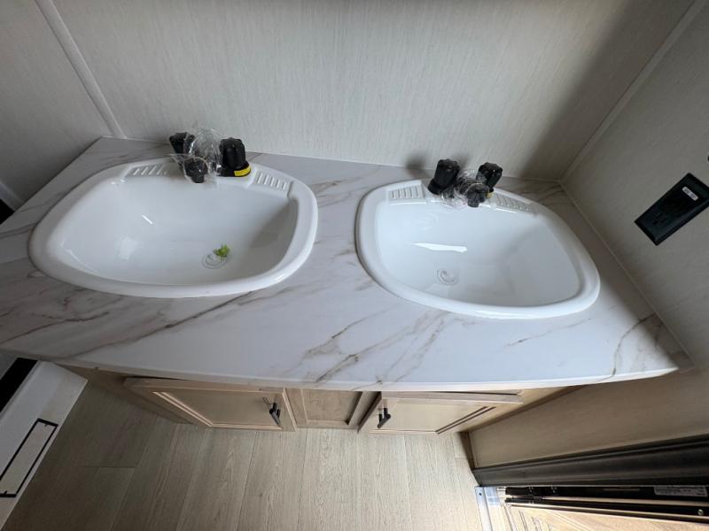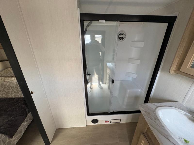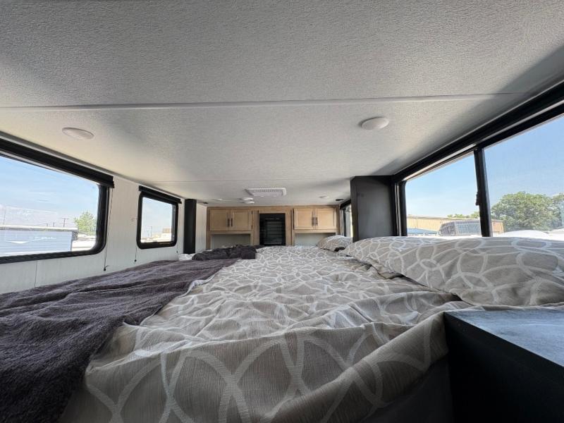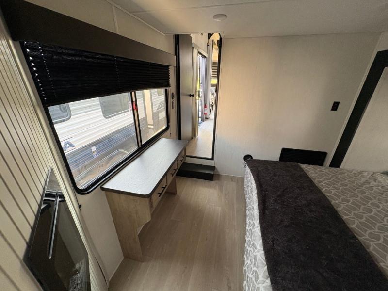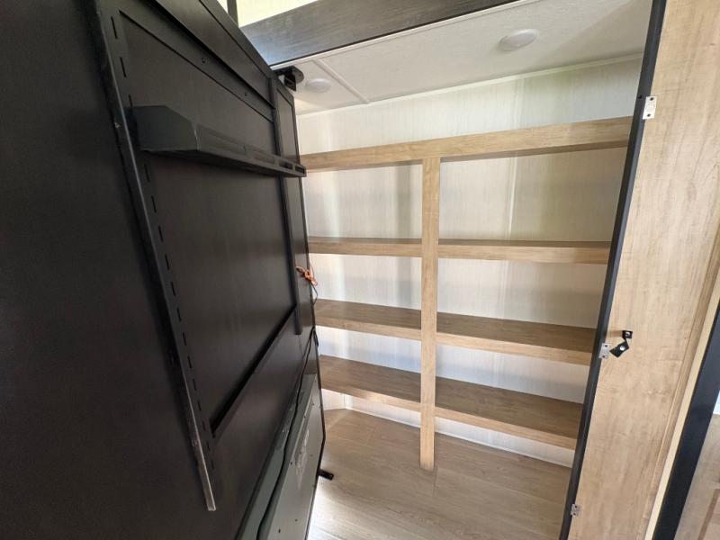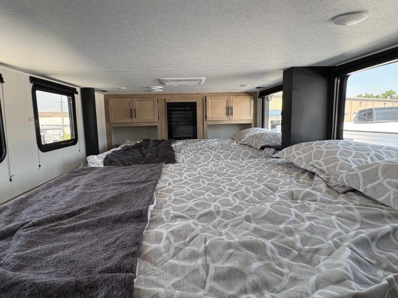 Choosing this destination trailer as your next RV won't be a hard decision! You can enter in through the front bath that includes dual bath sinks, a shower with a seat, and a medicine cabinet for your necessities. The master bedroom is connected to this bath for added convenience, and you're sure to enjoy the bedroom fireplace and king bed slide out. Just outside this room are the stairs that lead to the loft where you'll find two queen-size beds on one side and an open area where the kids can play or to use as storage. A second full bath is found next the stairs on the lower level, and there is a wardrobe with washer/dryer prep if you want to add these appliances. Everyone will love to join together and visit in the combined kitchen and living room. Here, you'll find a free-standing dinette, an L-shaped sofa, a kitchen island with two chairs, plus an entertainment center with a fireplace! The hidden pantry behind the fireplace will let you keep food stocked, and the rear patio doors will let natural light in!
