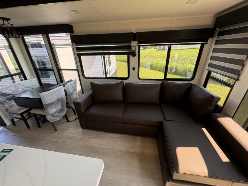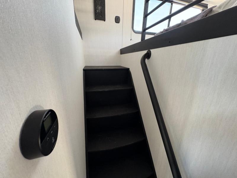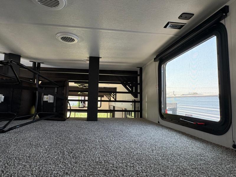 Choosing this destination trailer as your next RV won't be a hard decision! You can enter in through the front bath that includes dual bath sinks, a shower with a seat, and a medicine cabinet for your necessities. The master bedroom is connected to this bath for added convenience, and you're sure to enjoy the bedroom fireplace and king bed slide out. Just outside this room are the stairs that lead to the loft where you'll find two queen-size beds on one side and an open area where the kids can play or to use as storage. A second full bath is found next the stairs on the lower level, and there is a wardrobe with washer/dryer prep if you want to add these appliances. Everyone will love to join together and visit in the combined kitchen and living room. Here, you'll find a free-standing dinette, an L-shaped sofa, a kitchen island with two chairs, plus an entertainment center with a fireplace! The hidden pantry behind the fireplace will let you keep food stocked, and the rear patio doors will let natural light in!
