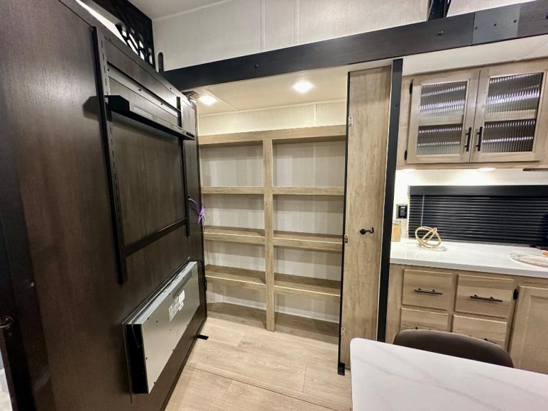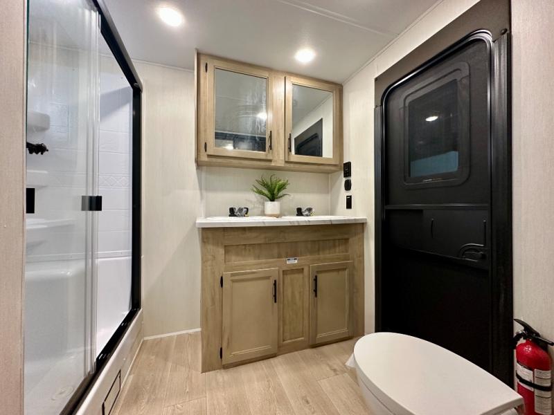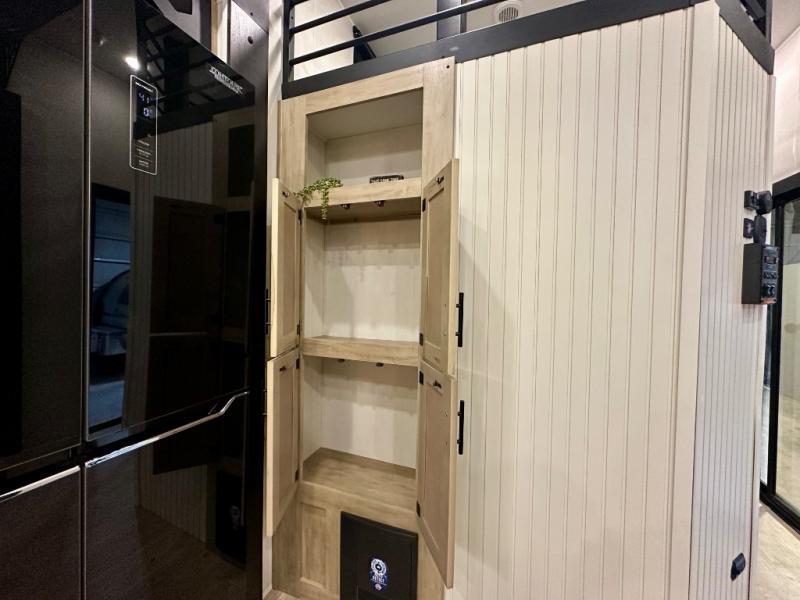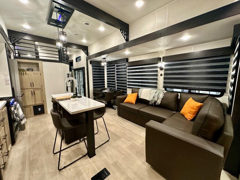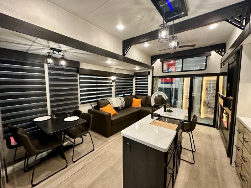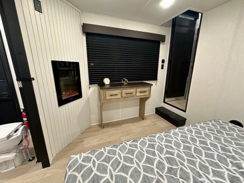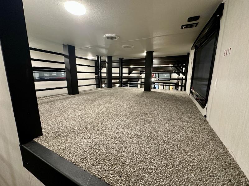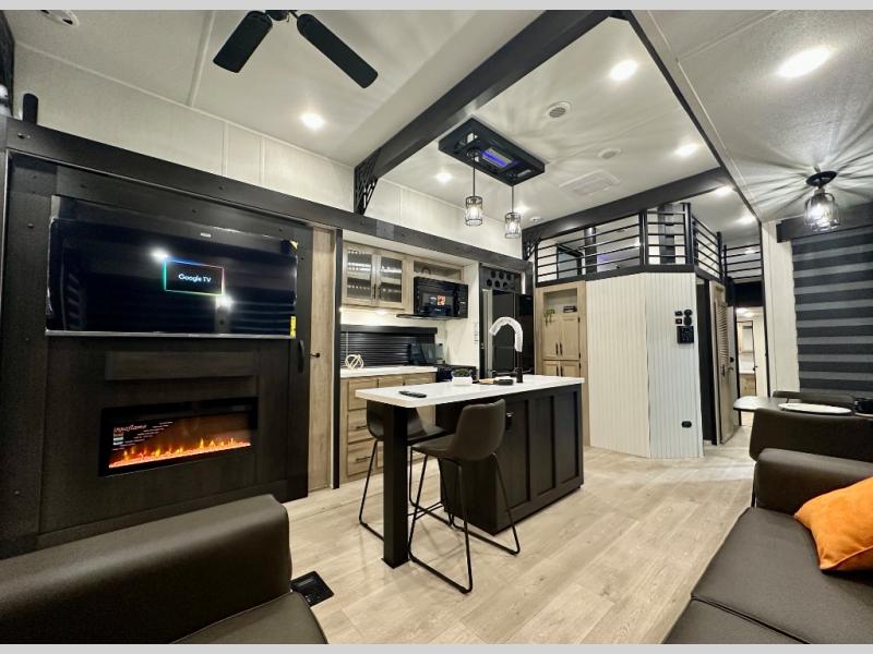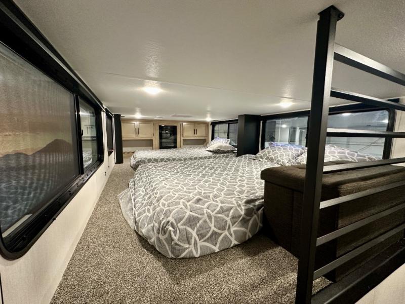 Choosing this destination trailer as your next RV won't be a hard decision! You can enter in through the front bath that includes dual bath sinks, a shower with a seat, and a medicine cabinet for your necessities. The master bedroom is connected to this bath for added convenience, and you're sure to enjoy the bedroom fireplace and king bed slide out. Just outside this room are the stairs that lead to the loft where you'll find two queen-size beds on one side and an open area where the kids can play or to use as storage. A second full bath is found next the stairs on the lower level, and there is a wardrobe with washer/dryer prep if you want to add these appliances. Everyone will love to join together and visit in the combined kitchen and living room. Here, you'll find a free-standing dinette, an L-shaped sofa, a kitchen island with two chairs, plus an entertainment center with a fireplace! The hidden pantry behind the fireplace will let you keep food stocked, and the rear patio doors will let natural light in!