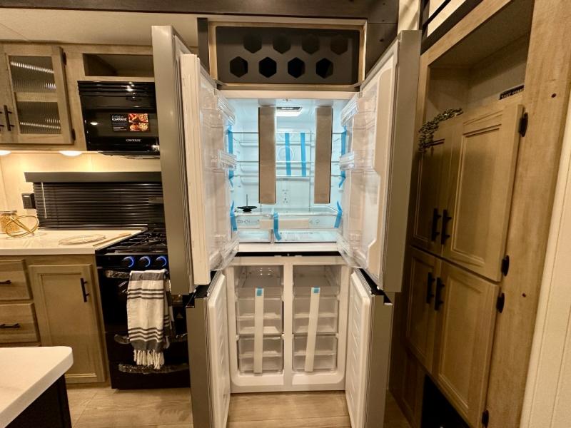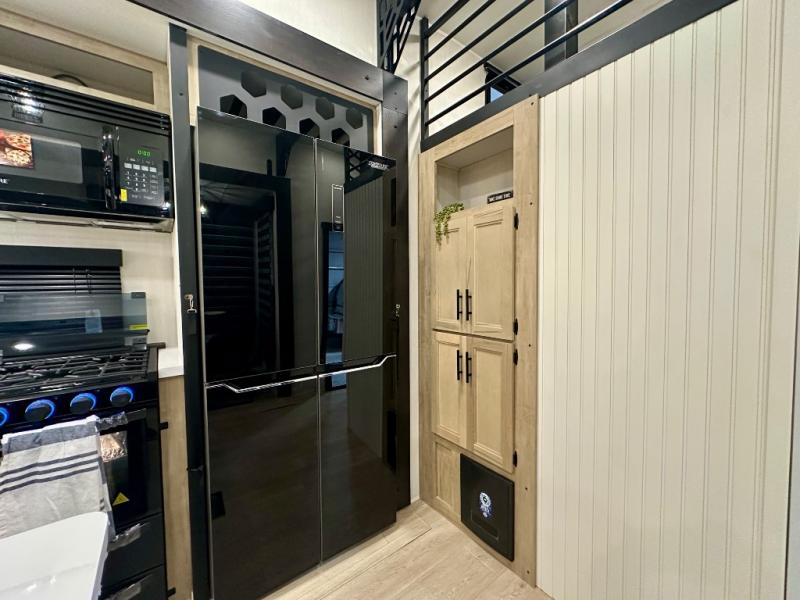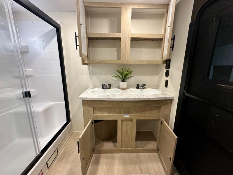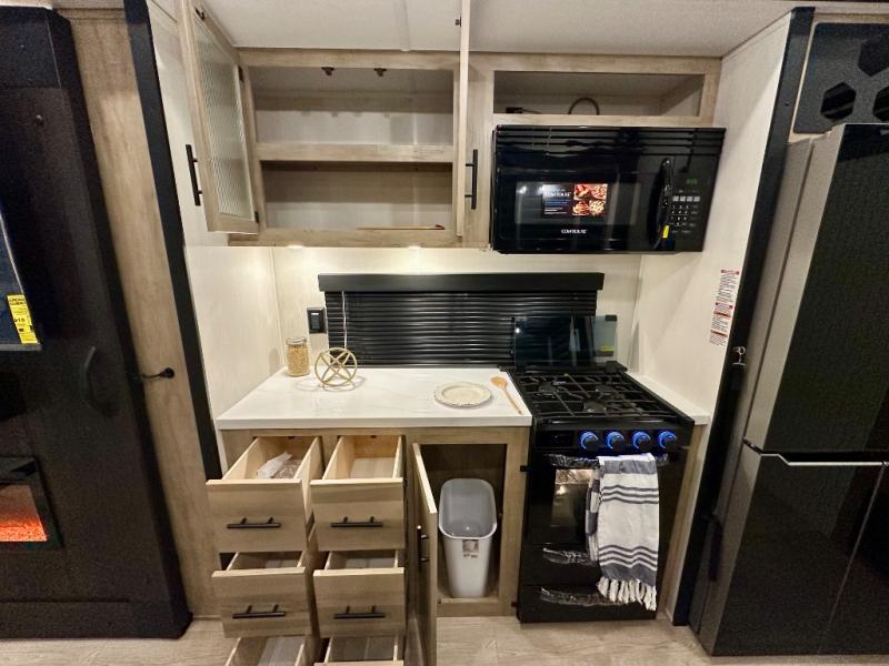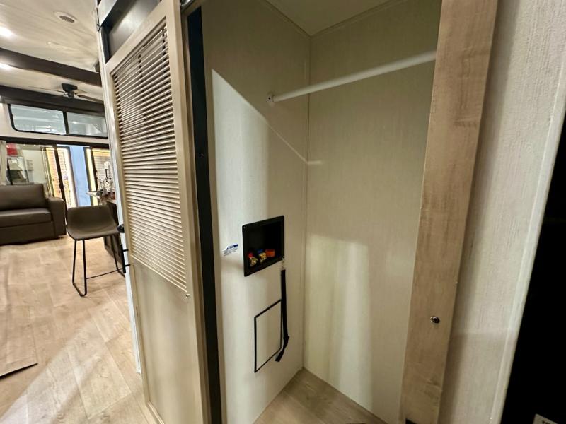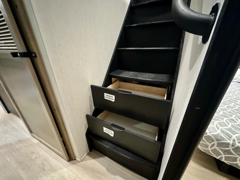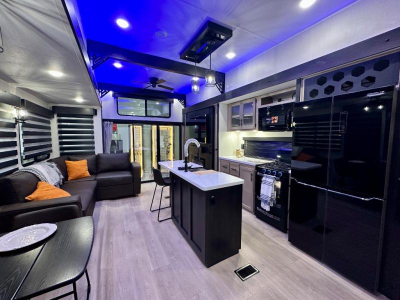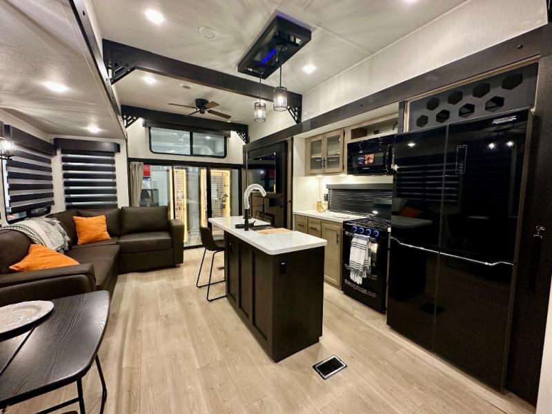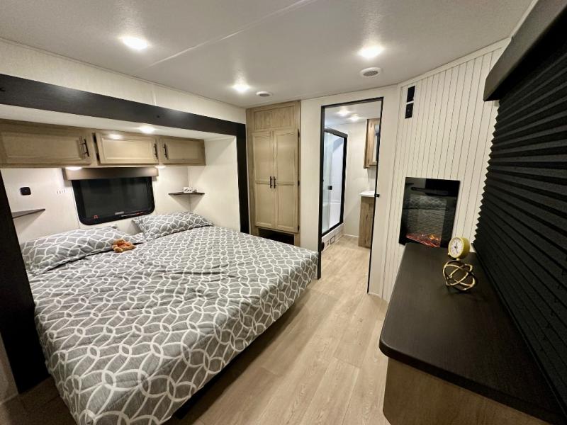 Choosing this destination trailer as your next RV won't be a hard decision! You can enter in through the front bath that includes dual bath sinks, a shower with a seat, and a medicine cabinet for your necessities. The master bedroom is connected to this bath for added convenience, and you're sure to enjoy the bedroom fireplace and king bed slide out. Just outside this room are the stairs that lead to the loft where you'll find two queen-size beds on one side and an open area where the kids can play or to use as storage. A second full bath is found next the stairs on the lower level, and there is a wardrobe with washer/dryer prep if you want to add these appliances. Everyone will love to join together and visit in the combined kitchen and living room. Here, you'll find a free-standing dinette, an L-shaped sofa, a kitchen island with two chairs, plus an entertainment center with a fireplace! The hidden pantry behind the fireplace will let you keep food stocked, and the rear patio doors will let natural light in!