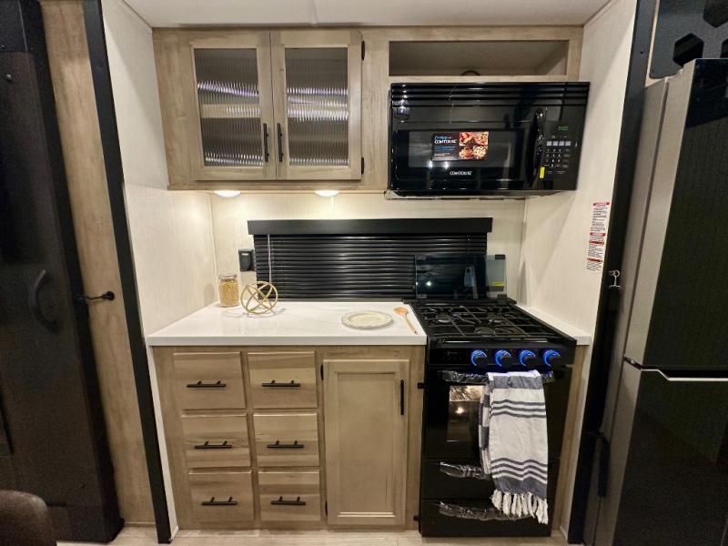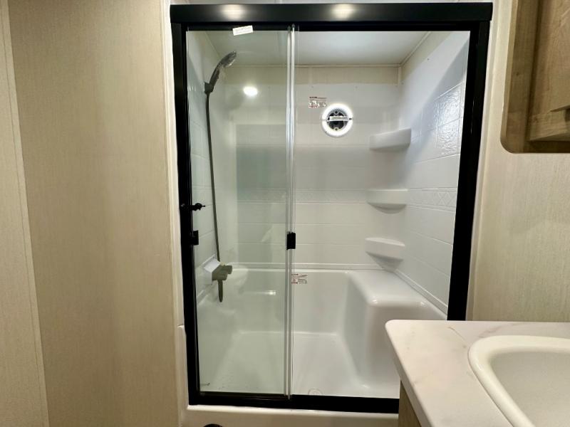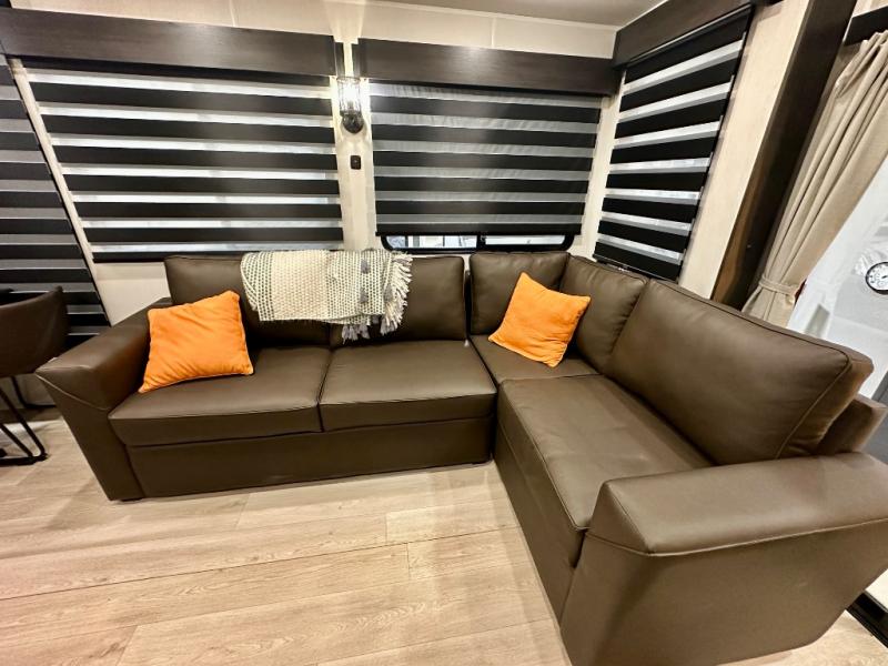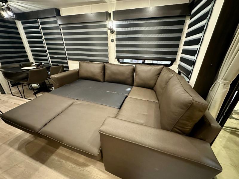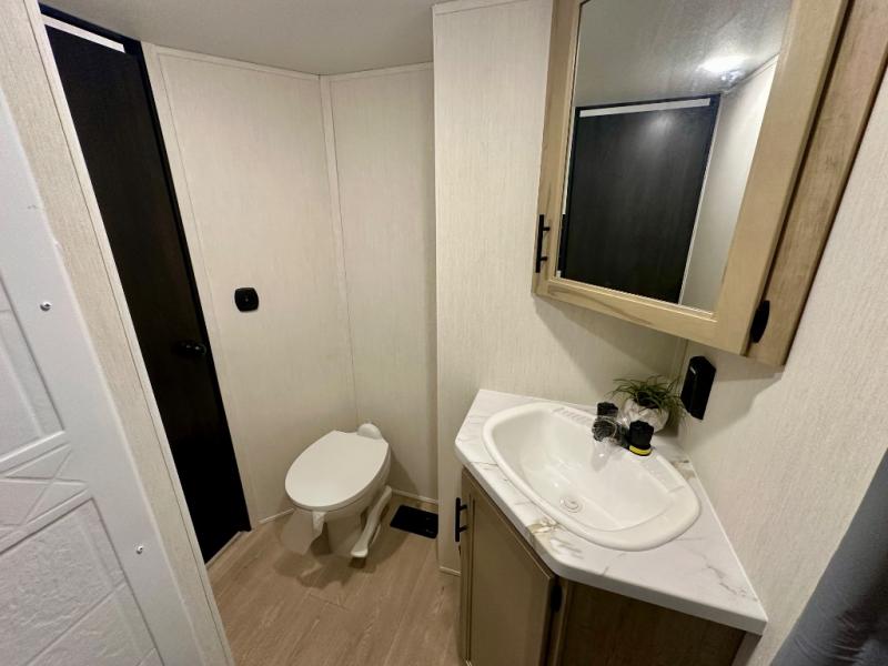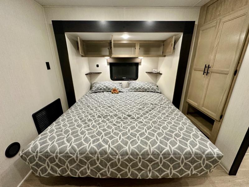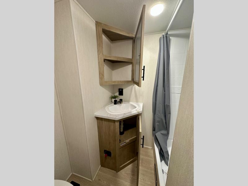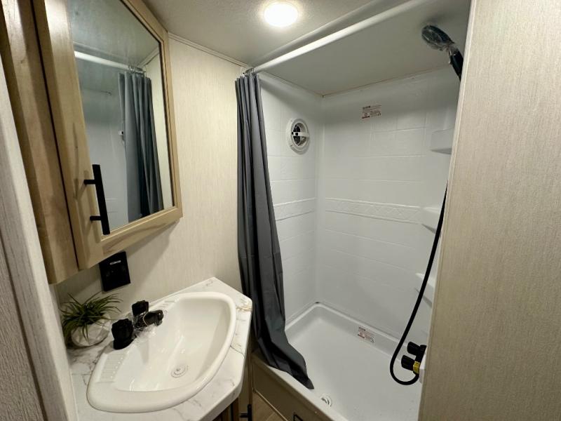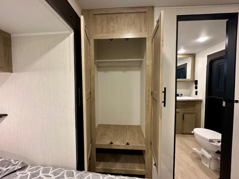Choosing this destination trailer as your next RV won't be a hard decision! You can enter in through the front bath that includes dual bath sinks, a shower with a seat, and a medicine cabinet for your necessities. The master bedroom is connected to this bath for added convenience, and you're sure to enjoy the bedroom fireplace and king bed slide out. Just outside this room are the stairs that lead to the loft where you'll find two queen-size beds on one side and an open area where the kids can play or to use as storage. A second full bath is found next the stairs on the lower level, and there is a wardrobe with washer/dryer prep if you want to add these appliances. Everyone will love to join together and visit in the combined kitchen and living room. Here, you'll find a free-standing dinette, an L-shaped sofa, a kitchen island with two chairs, plus an entertainment center with a fireplace! The hidden pantry behind the fireplace will let you keep food stocked, and the rear patio doors will let natural light in!