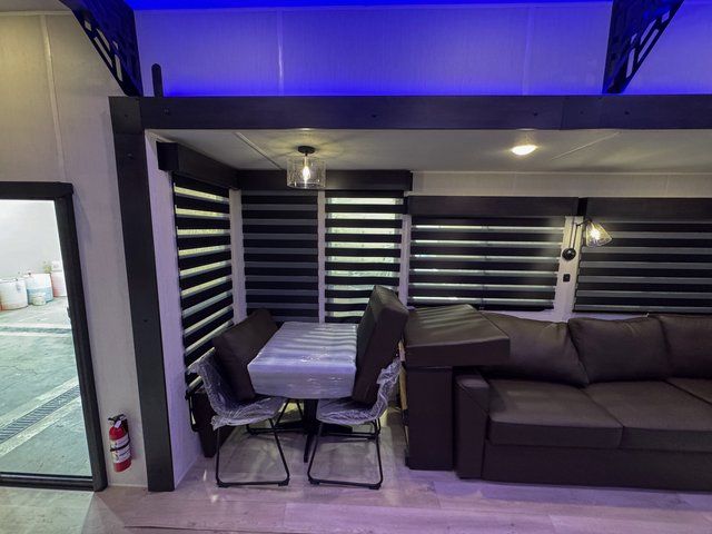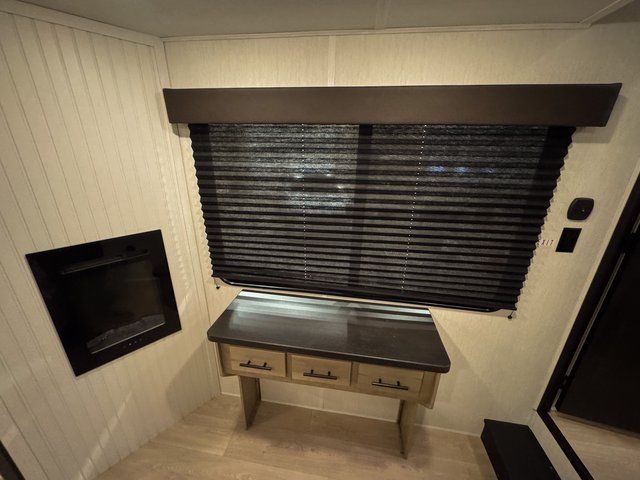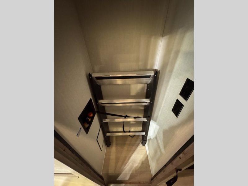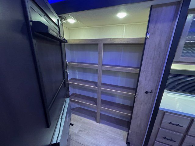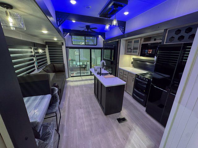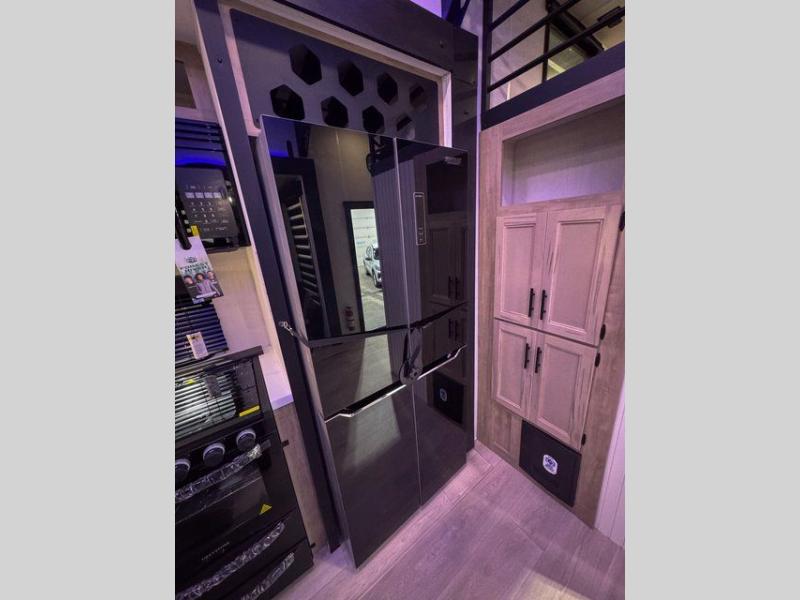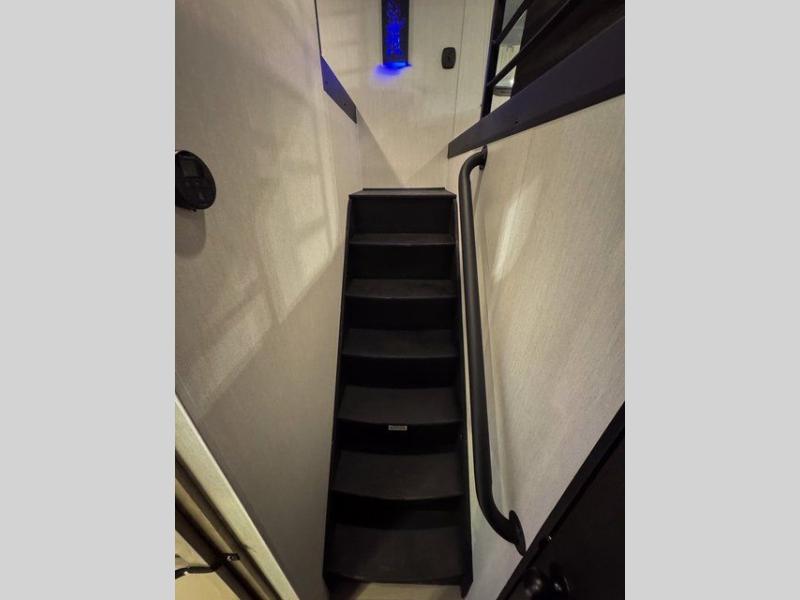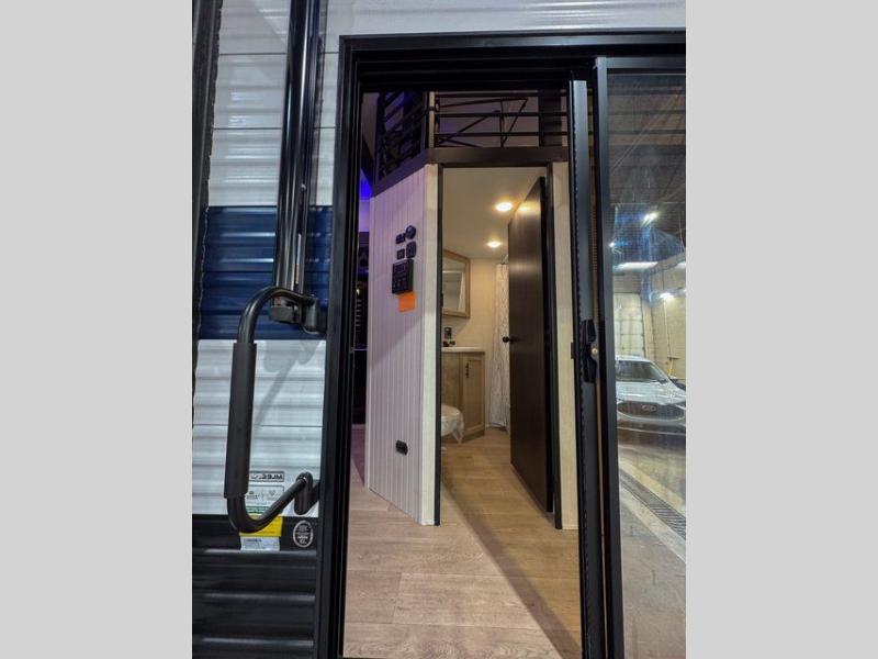 Choosing this destination trailer as your next RV won't be a hard decision! You can enter in through the front bath that includes dual bath sinks, a shower with a seat, and a medicine cabinet for your necessities. The master bedroom is connected to this bath for added convenience, and you're sure to enjoy the bedroom fireplace and king bed slide out. Just outside this room are the stairs that lead to the loft where you'll find two queen-size beds on one side and an open area where the kids can play or to use as storage. A second full bath is found next the stairs on the lower level, and there is a wardrobe with washer/dryer prep if you want to add these appliances. Everyone will love to join together and visit in the combined kitchen and living room. Here, you'll find a free-standing dinette, an L-shaped sofa, a kitchen island with two chairs, plus an entertainment center with a fireplace! The hidden pantry behind the fireplace will let you keep food stocked, and the rear patio doors will let natural light in!