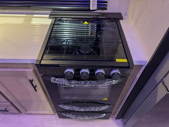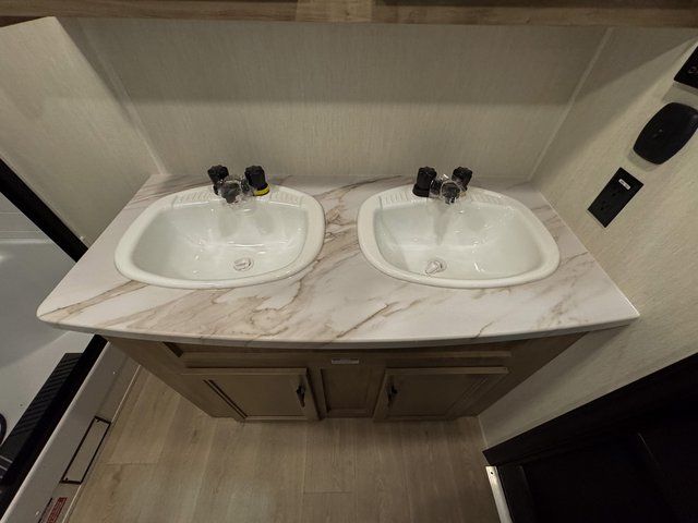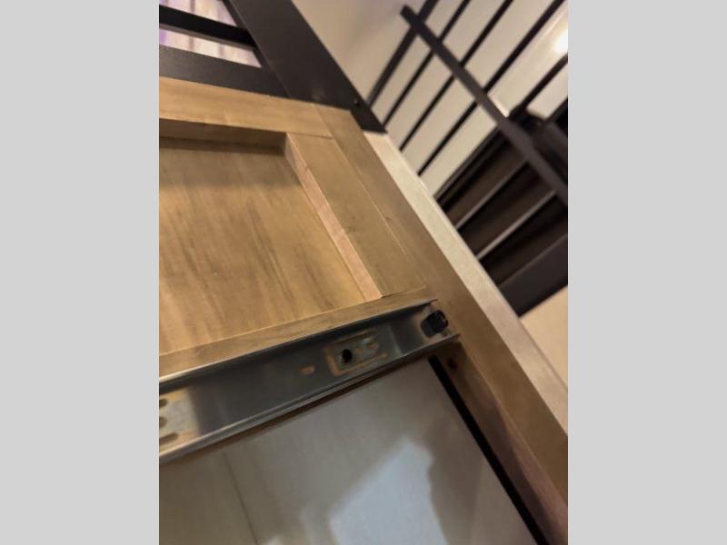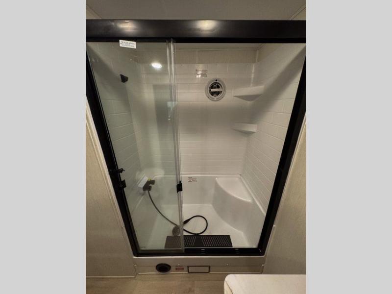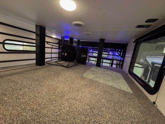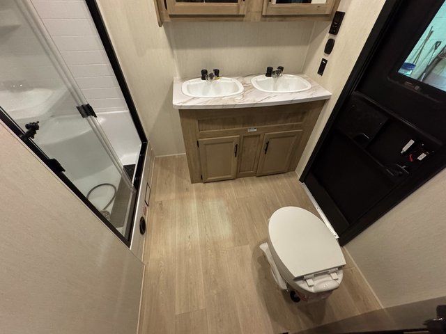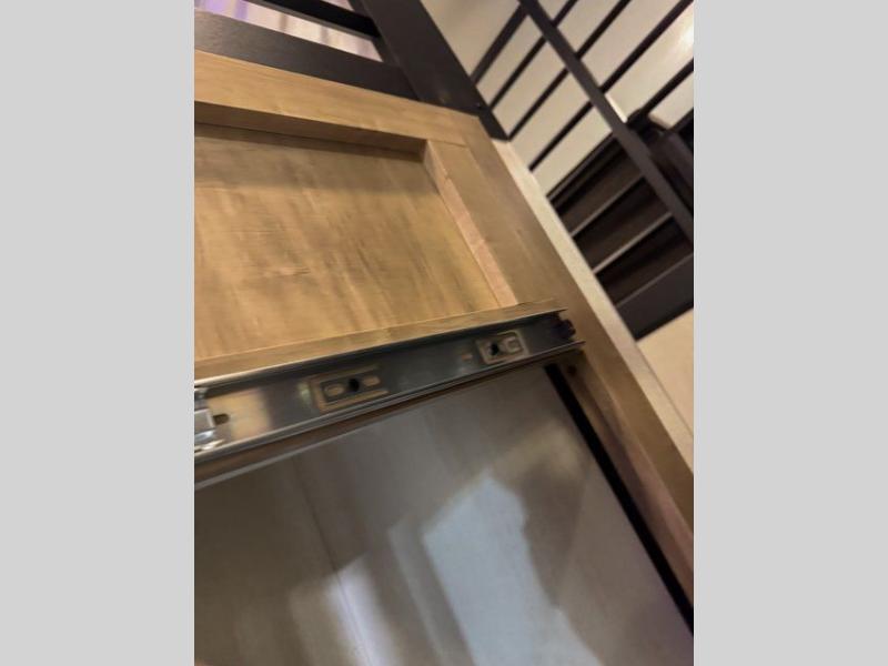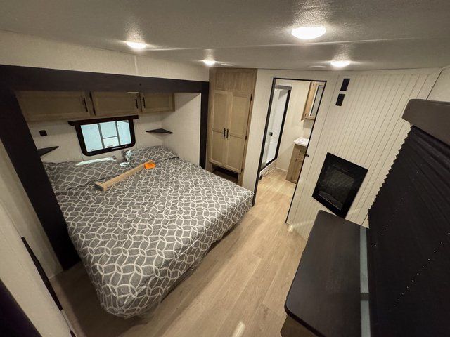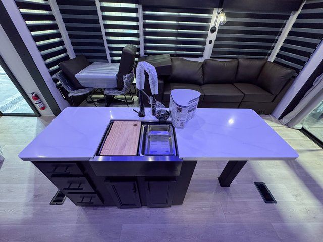 Choosing this destination trailer as your next RV won't be a hard decision! You can enter in through the front bath that includes dual bath sinks, a shower with a seat, and a medicine cabinet for your necessities. The master bedroom is connected to this bath for added convenience, and you're sure to enjoy the bedroom fireplace and king bed slide out. Just outside this room are the stairs that lead to the loft where you'll find two queen-size beds on one side and an open area where the kids can play or to use as storage. A second full bath is found next the stairs on the lower level, and there is a wardrobe with washer/dryer prep if you want to add these appliances. Everyone will love to join together and visit in the combined kitchen and living room. Here, you'll find a free-standing dinette, an L-shaped sofa, a kitchen island with two chairs, plus an entertainment center with a fireplace! The hidden pantry behind the fireplace will let you keep food stocked, and the rear patio doors will let natural light in!