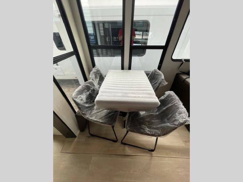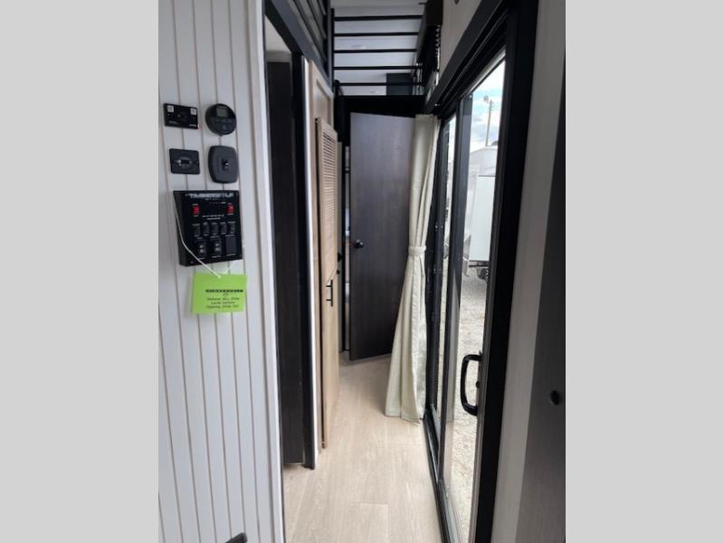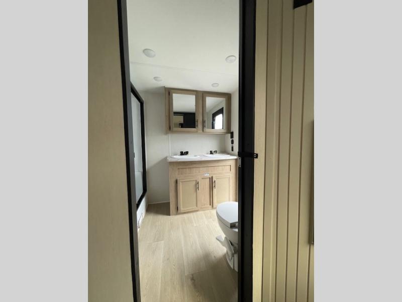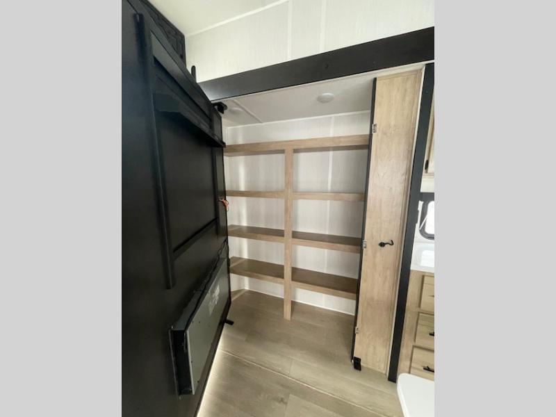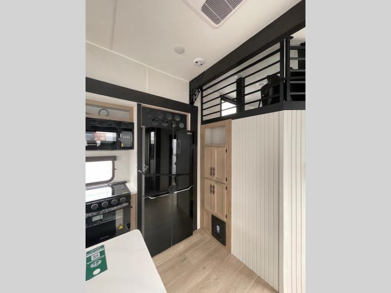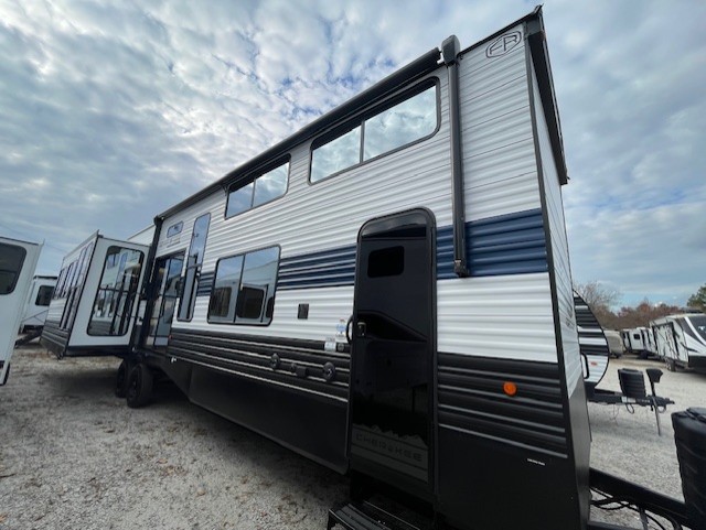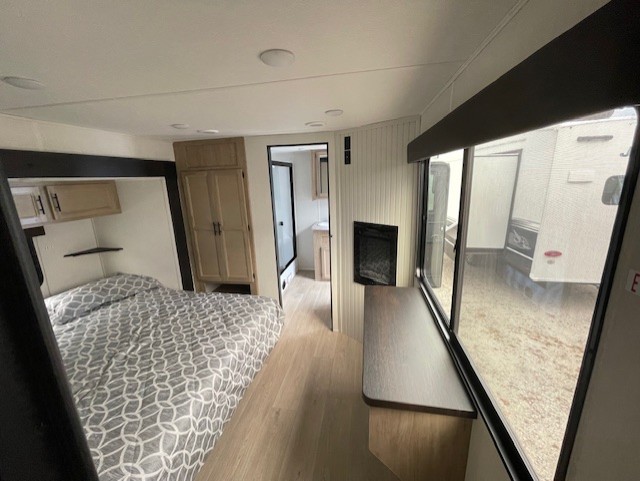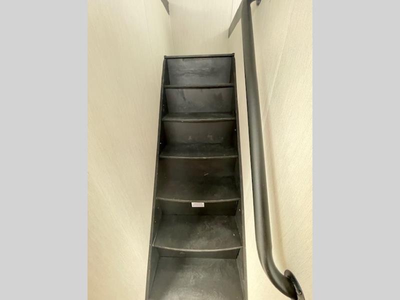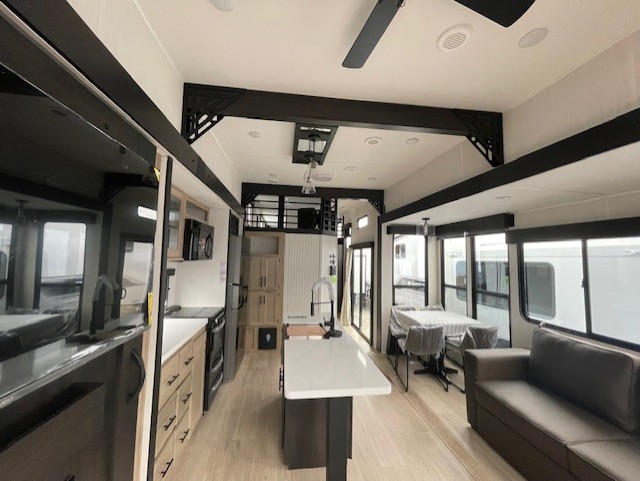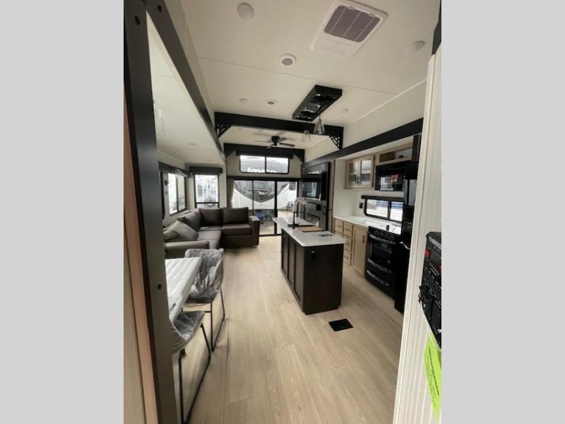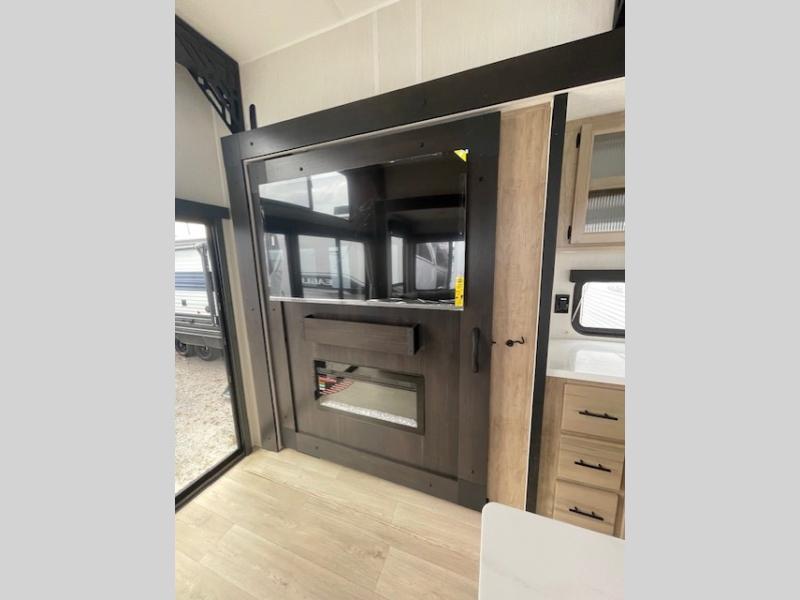 Choosing this destination trailer as your next RV won't be a hard decision! You can enter in through the front bath that includes dual bath sinks, a shower with a seat, and a medicine cabinet for your necessities. The master bedroom is connected to this bath for added convenience, and you're sure to enjoy the bedroom fireplace and king bed slide out. Just outside this room are the stairs that lead to the loft where you'll find two queen-size beds on one side and an open area where the kids can play or to use as storage. A second full bath is found next the stairs on the lower level, and there is a wardrobe with washer/dryer prep if you want to add these appliances. Everyone will love to join together and visit in the combined kitchen and living room. Here, you'll find a free-standing dinette, an L-shaped sofa, a kitchen island with two chairs, plus an entertainment center with a fireplace! The hidden pantry behind the fireplace will let you keep food stocked, and the rear patio doors will let natural light in!