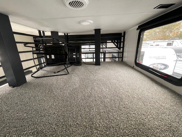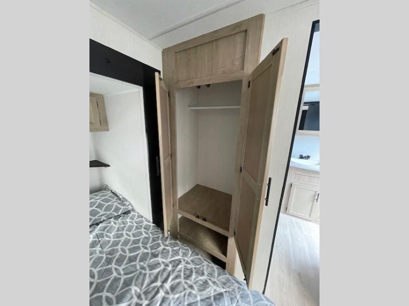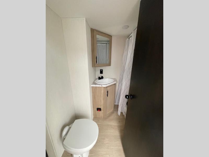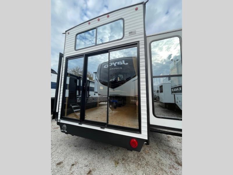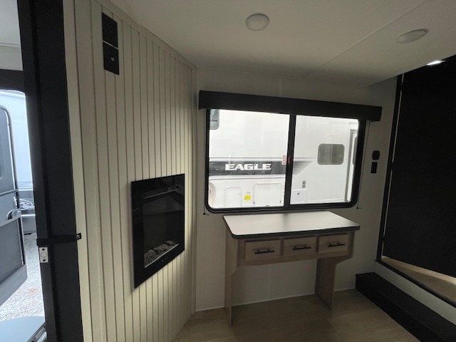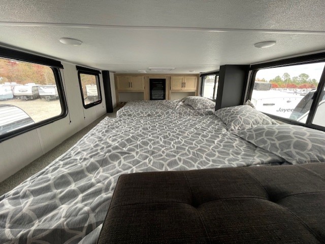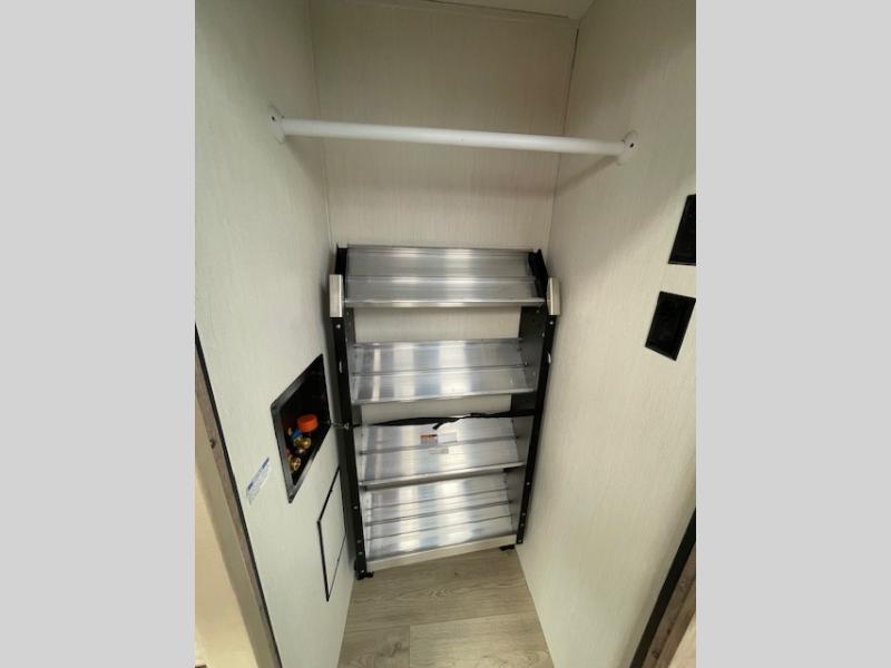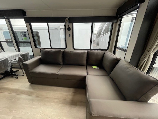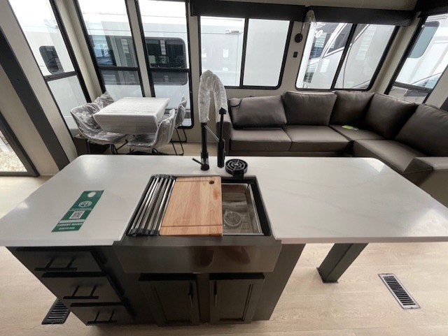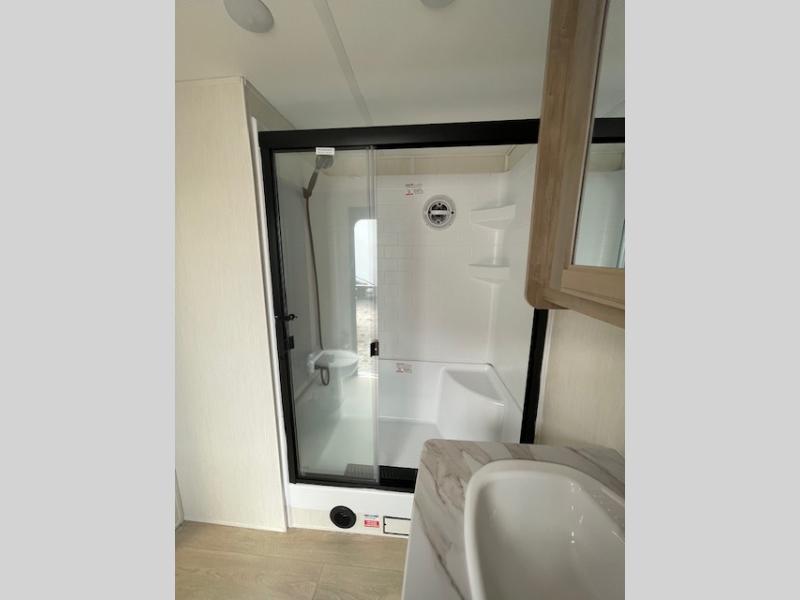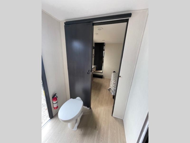 Choosing this destination trailer as your next RV won't be a hard decision! You can enter in through the front bath that includes dual bath sinks, a shower with a seat, and a medicine cabinet for your necessities. The master bedroom is connected to this bath for added convenience, and you're sure to enjoy the bedroom fireplace and king bed slide out. Just outside this room are the stairs that lead to the loft where you'll find two queen-size beds on one side and an open area where the kids can play or to use as storage. A second full bath is found next the stairs on the lower level, and there is a wardrobe with washer/dryer prep if you want to add these appliances. Everyone will love to join together and visit in the combined kitchen and living room. Here, you'll find a free-standing dinette, an L-shaped sofa, a kitchen island with two chairs, plus an entertainment center with a fireplace! The hidden pantry behind the fireplace will let you keep food stocked, and the rear patio doors will let natural light in!