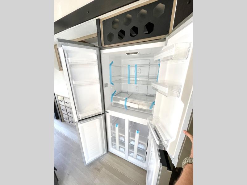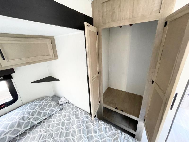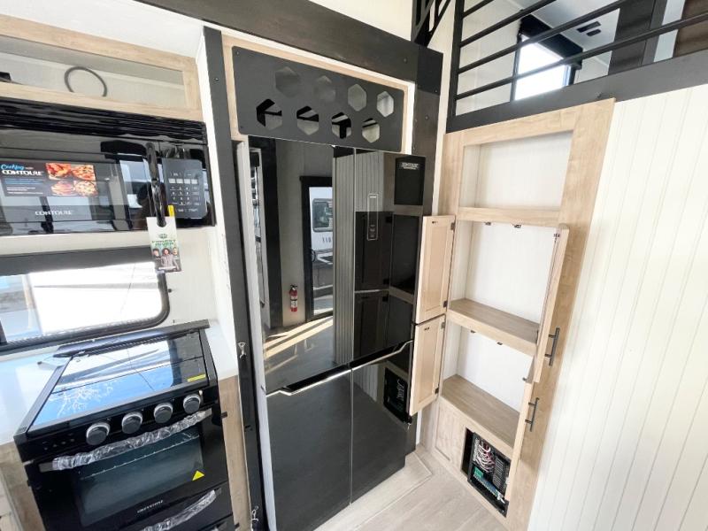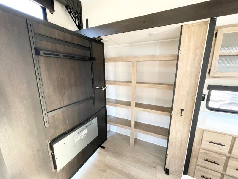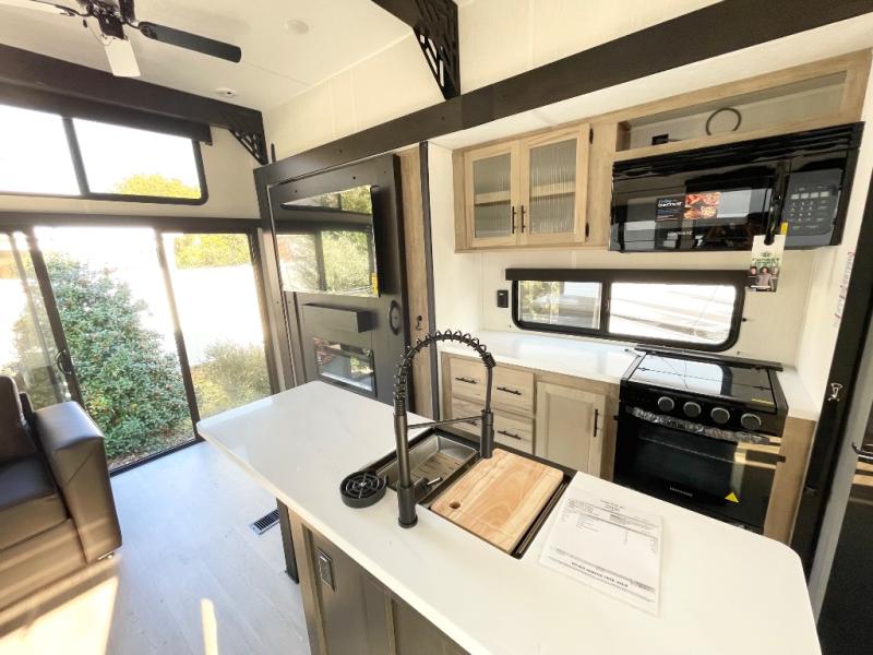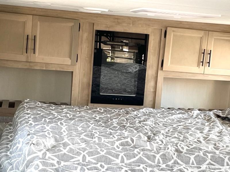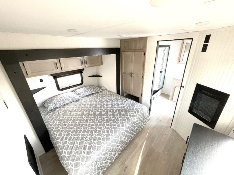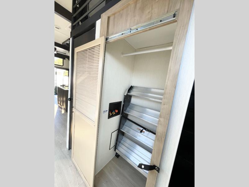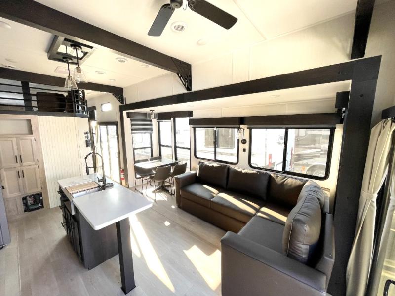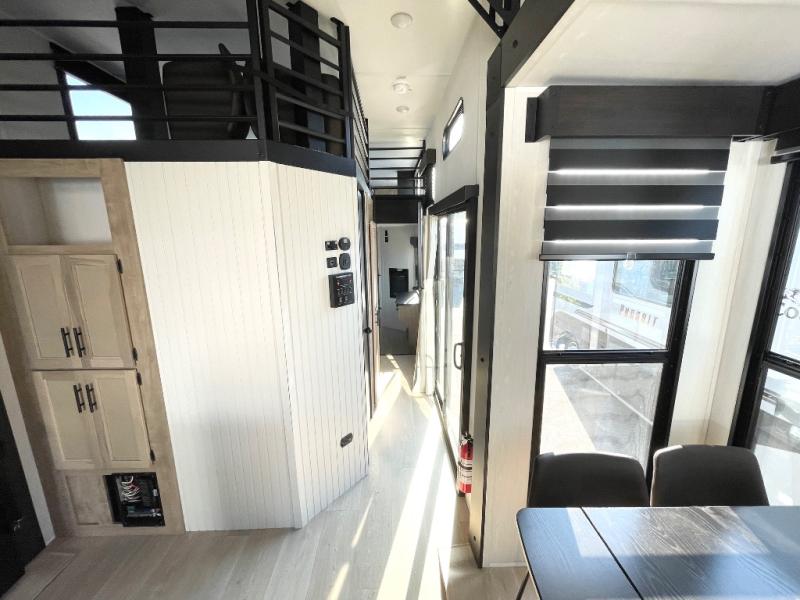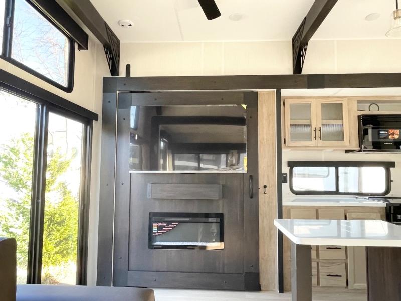 Choosing this destination trailer as your next RV won't be a hard decision! You can enter in through the front bath that includes dual bath sinks, a shower with a seat, and a medicine cabinet for your necessities. The master bedroom is connected to this bath for added convenience, and you're sure to enjoy the bedroom fireplace and king bed slide out. Just outside this room are the stairs that lead to the loft where you'll find two queen-size beds on one side and an open area where the kids can play or to use as storage. A second full bath is found next the stairs on the lower level, and there is a wardrobe with washer/dryer prep if you want to add these appliances. Everyone will love to join together and visit in the combined kitchen and living room. Here, you'll find a free-standing dinette, an L-shaped sofa, a kitchen island with two chairs, plus an entertainment center with a fireplace! The hidden pantry behind the fireplace will let you keep food stocked, and the rear patio doors will let natural light in!