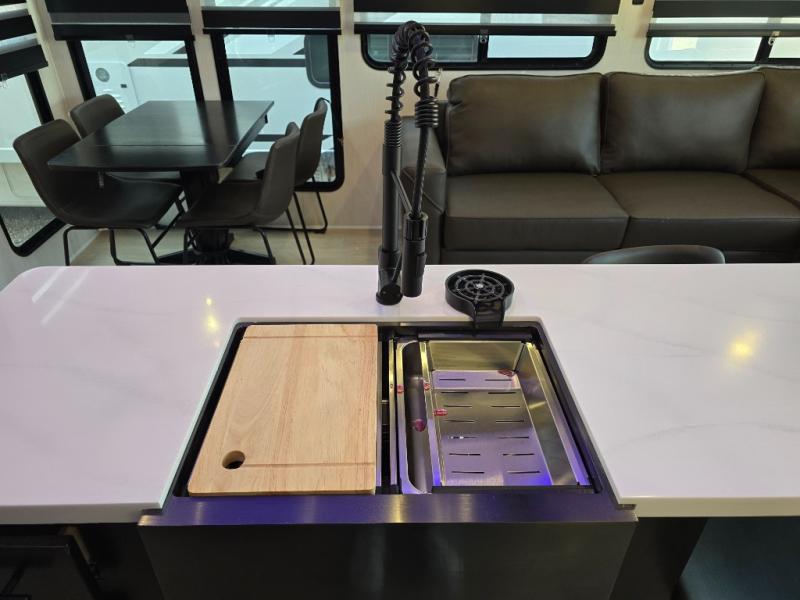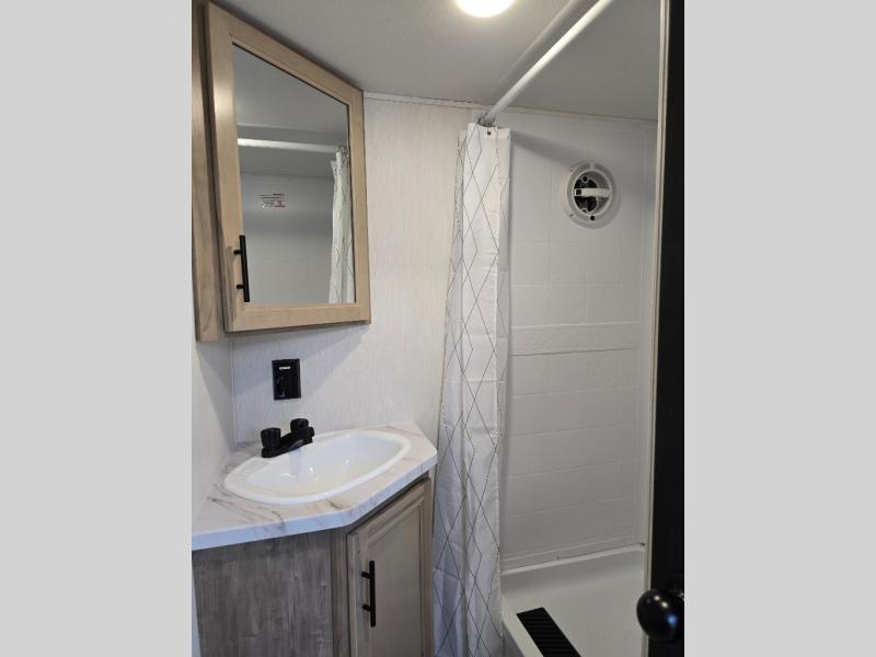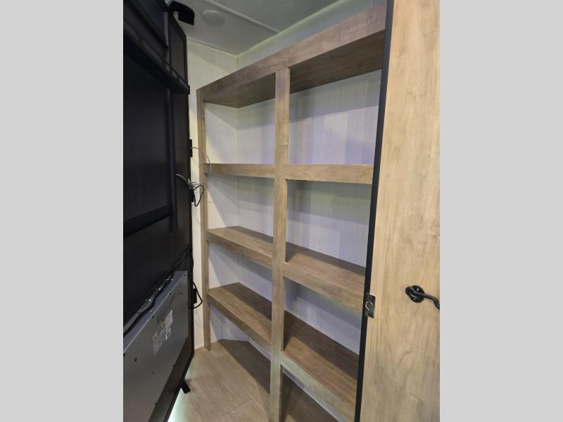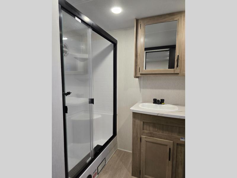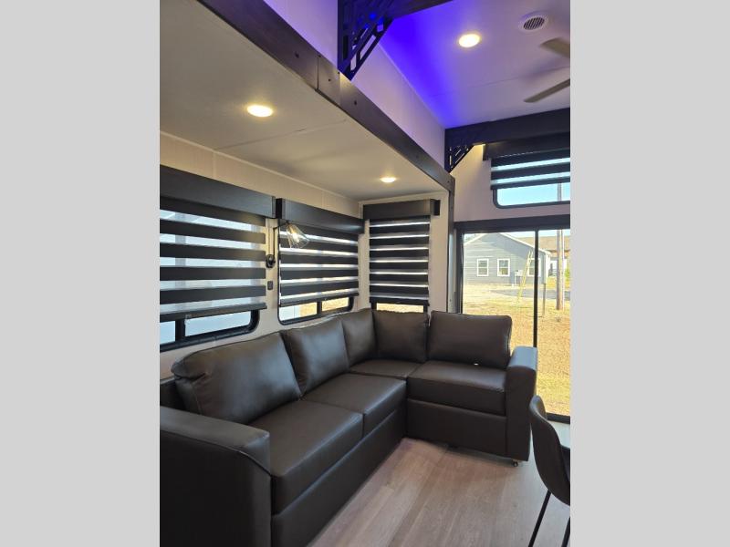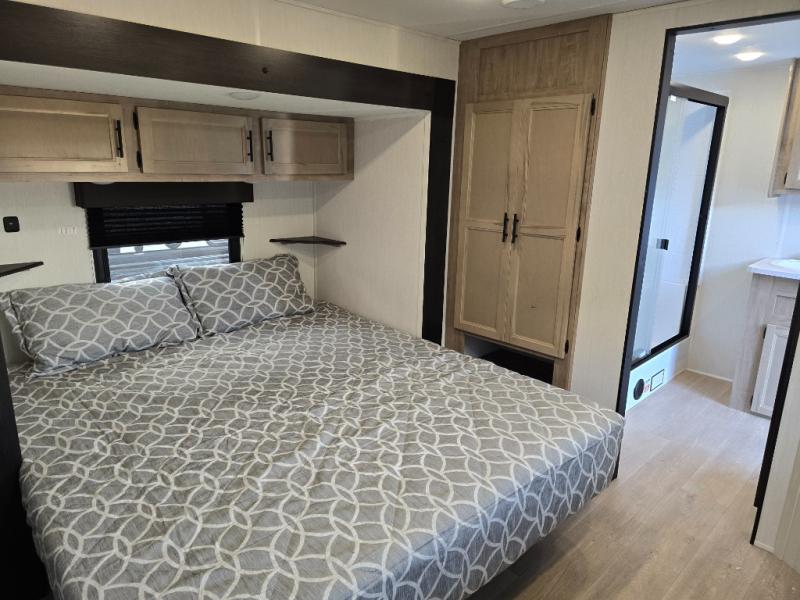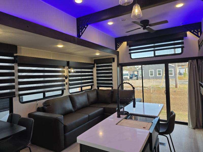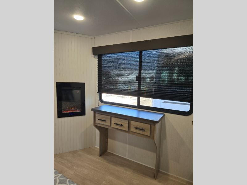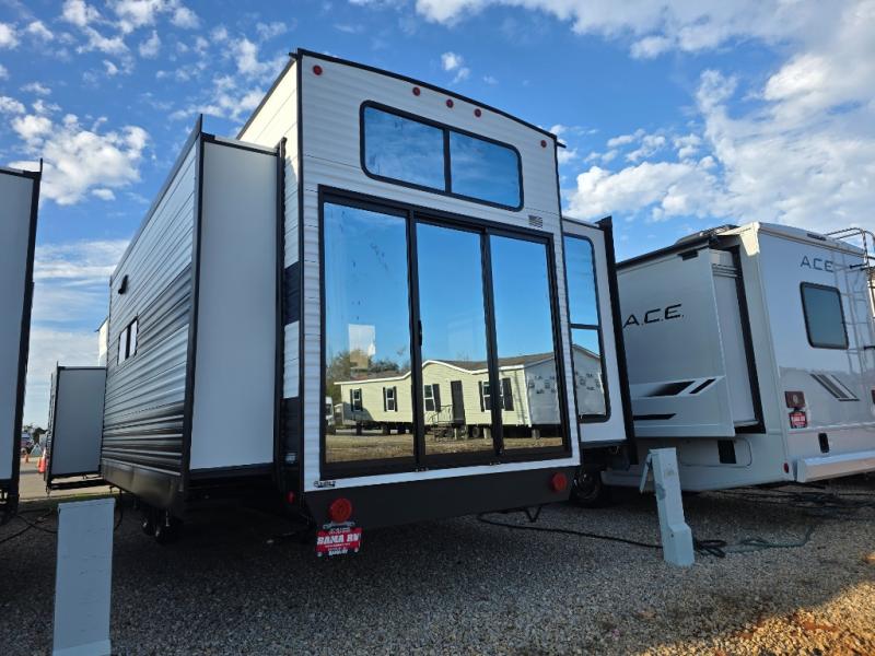 Choosing this destination trailer as your next RV won't be a hard decision! You can enter in through the front bath that includes dual bath sinks, a shower with a seat, and a medicine cabinet for your necessities. The master bedroom is connected to this bath for added convenience, and you're sure to enjoy the bedroom fireplace and king bed slide out. Just outside this room are the stairs that lead to the loft where you'll find two queen-size beds on one side and an open area where the kids can play or to use as storage. A second full bath is found next the stairs on the lower level, and there is a wardrobe with washer/dryer prep if you want to add these appliances. Everyone will love to join together and visit in the combined kitchen and living room. Here, you'll find a free-standing dinette, an L-shaped sofa, a kitchen island with two chairs, plus an entertainment center with a fireplace! The hidden pantry behind the fireplace will let you keep food stocked, and the rear patio doors will let natural light in!