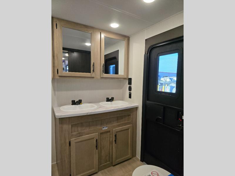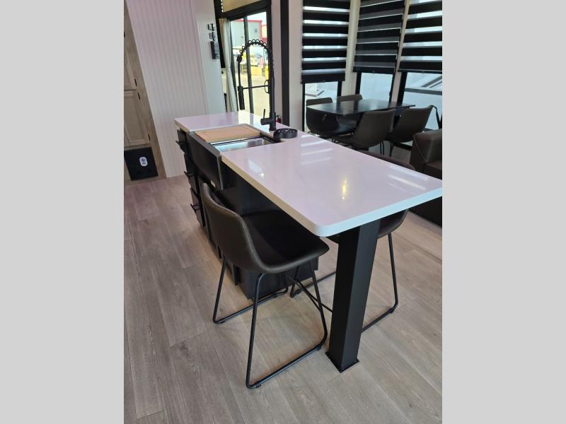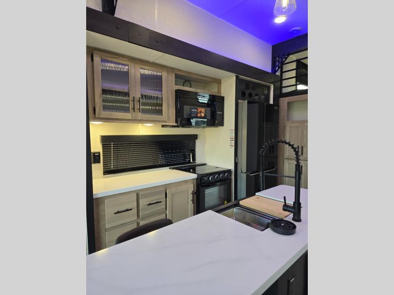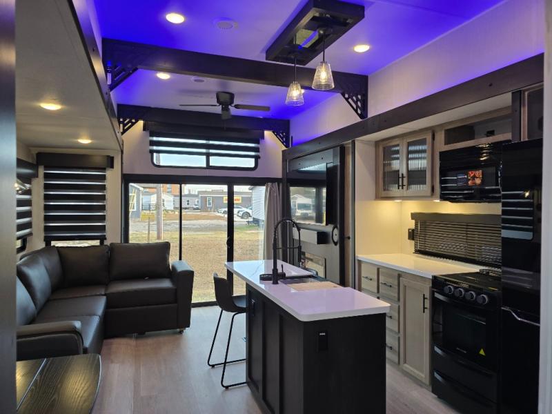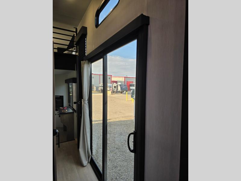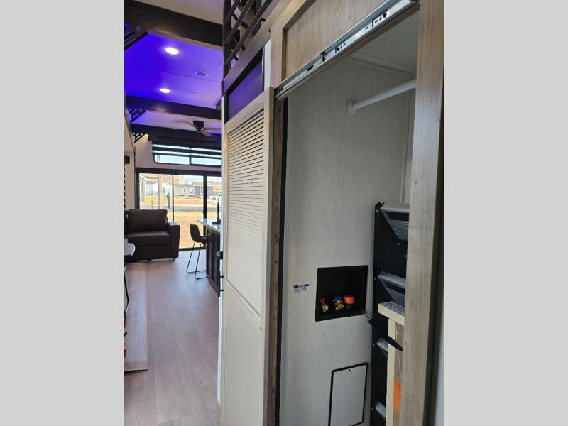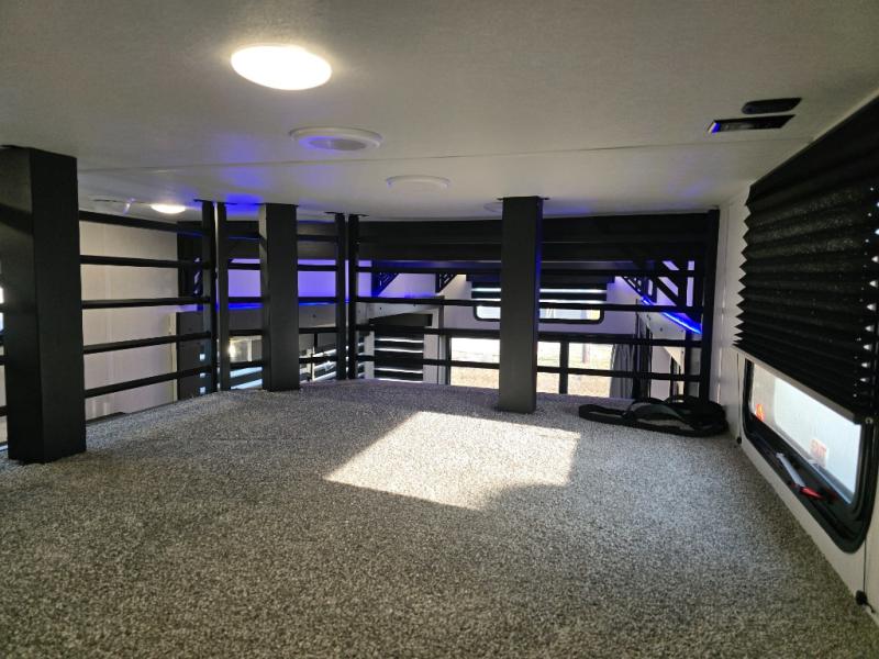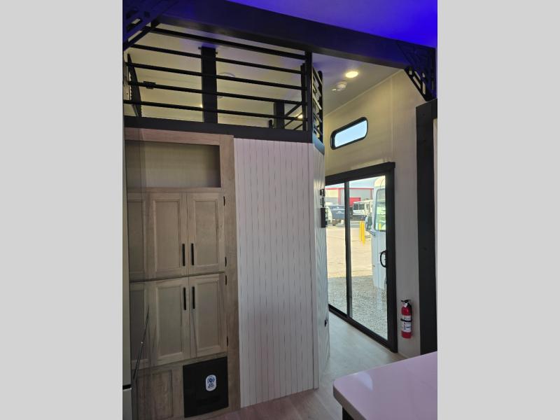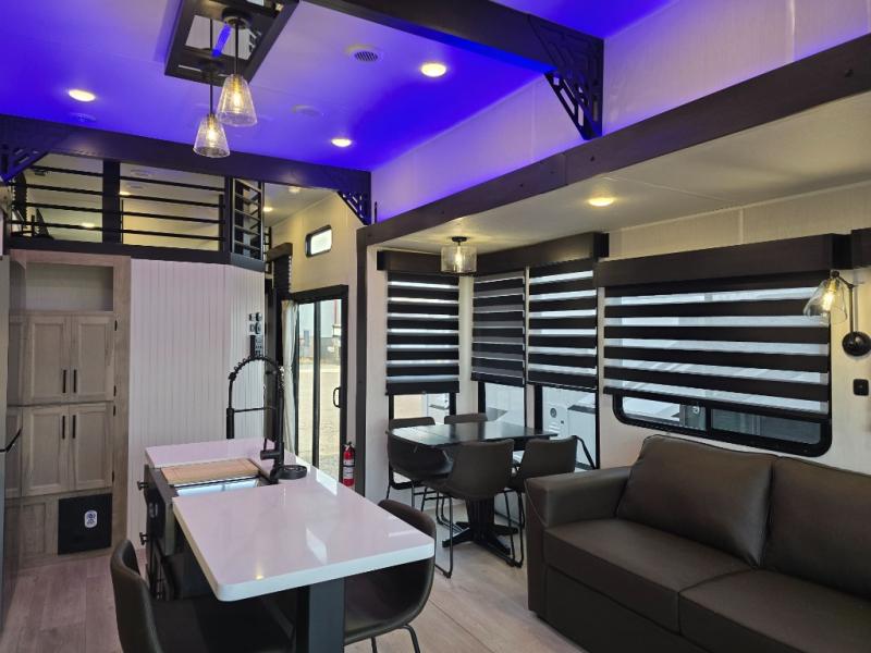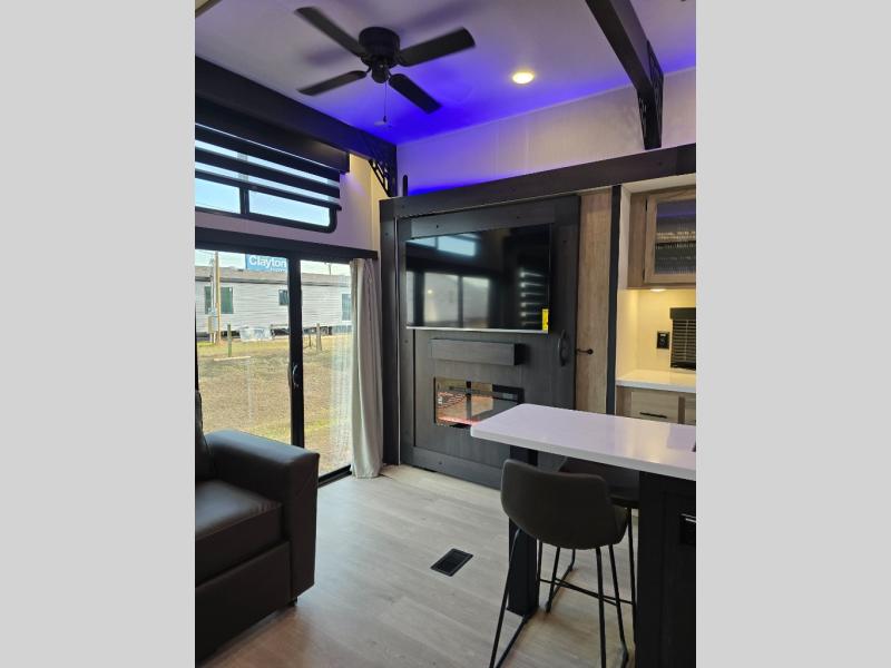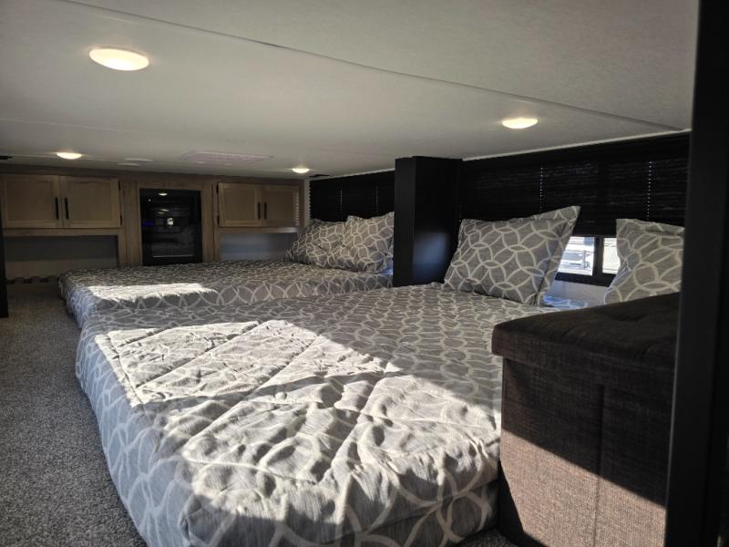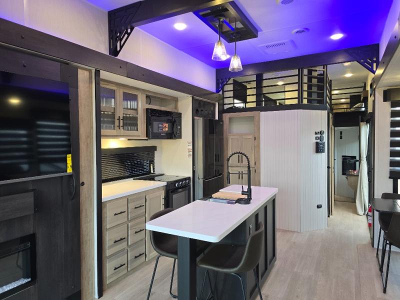 Choosing this destination trailer as your next RV won't be a hard decision! You can enter in through the front bath that includes dual bath sinks, a shower with a seat, and a medicine cabinet for your necessities. The master bedroom is connected to this bath for added convenience, and you're sure to enjoy the bedroom fireplace and king bed slide out. Just outside this room are the stairs that lead to the loft where you'll find two queen-size beds on one side and an open area where the kids can play or to use as storage. A second full bath is found next the stairs on the lower level, and there is a wardrobe with washer/dryer prep if you want to add these appliances. Everyone will love to join together and visit in the combined kitchen and living room. Here, you'll find a free-standing dinette, an L-shaped sofa, a kitchen island with two chairs, plus an entertainment center with a fireplace! The hidden pantry behind the fireplace will let you keep food stocked, and the rear patio doors will let natural light in!