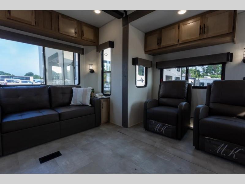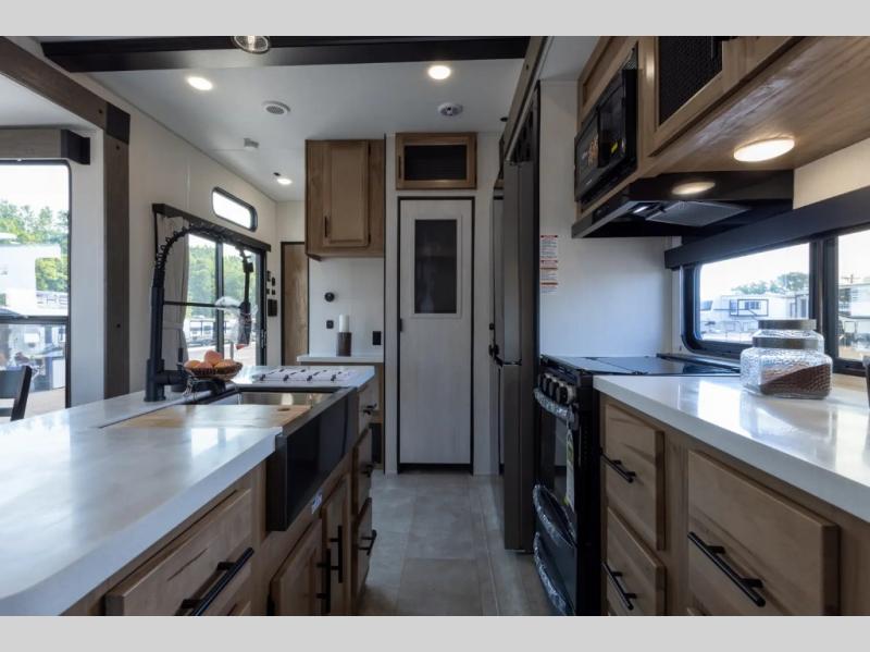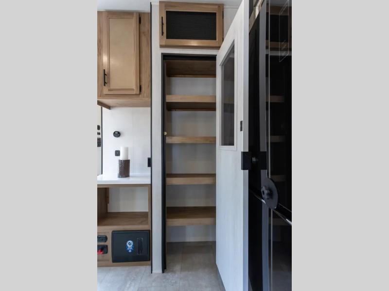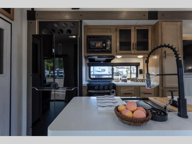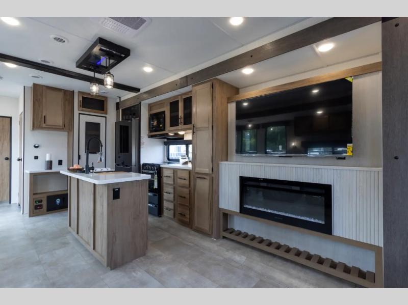 Spacious and comfortable describe this destination travel trailer featuring triple slides with dual opposing slides in the living area which creates a wide open space for a dining table and four chairs, two lounge chairs, an entertainment center with a fireplace, and a hide-a-bed sofa along the very front wall. The roadside slide also houses the kitchen appliances which include a refrigerator, stove and microwave oven. There is a pantry and a hutch adjacent to the slide, and a kitchen island for more food prep space, and this is where your sink is located so you can be facing all of the seating areas in the room while prepping meals and doing the dishes. A centrally located half bath is convenient just inside the main patio door entry. Towards the rear of the coach, a private bedroom featuring a king bed slide along with storage space for your clothing. In the very back, a master suite bath featuring a vanity with dual sinks, a shower with a seat, linen storage, and a wardrobe that has been prepped for a washer and dryer if you choose to add. You will love the outside TV mount and 21' covered awning space to create a nice size outdoor living area to enjoy on sunny days or pleasant evenings.