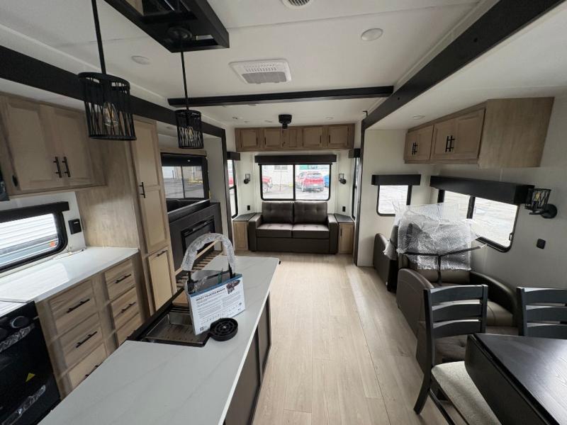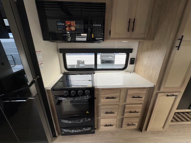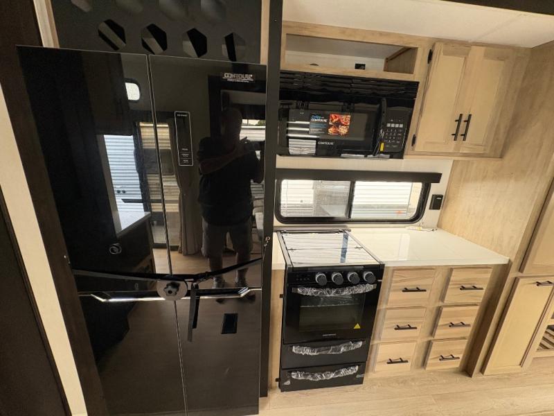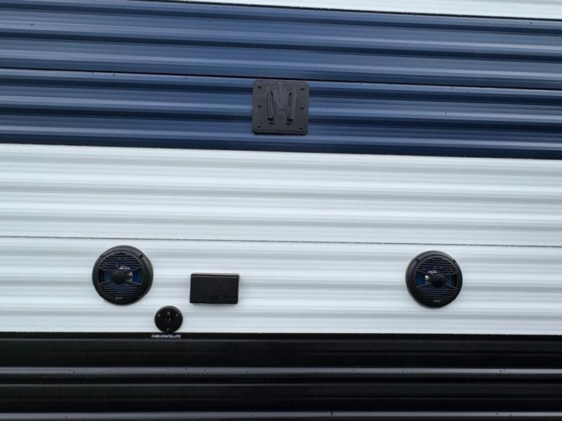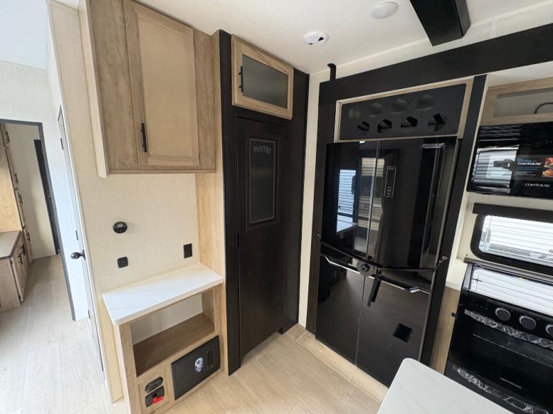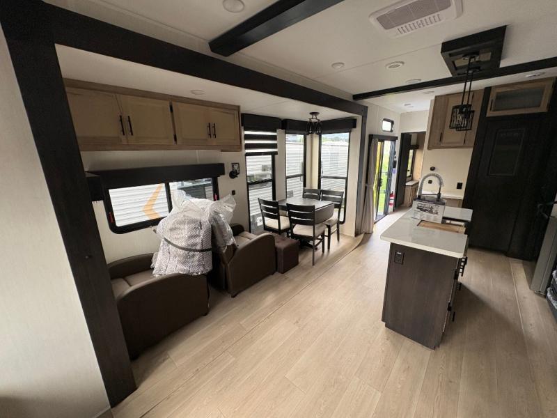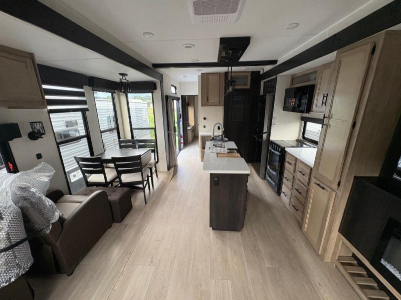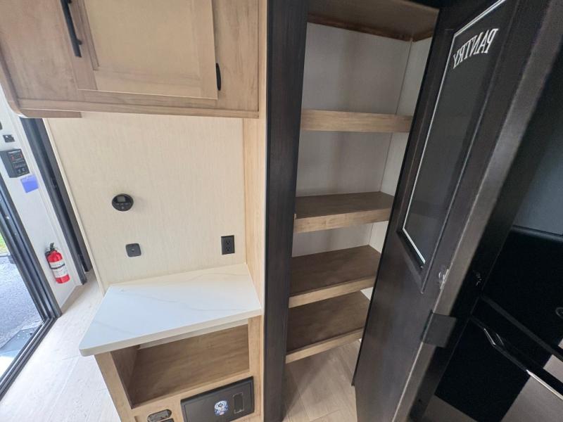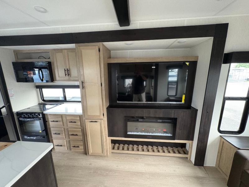 Spacious and comfortable describe this destination travel trailer featuring triple slides with dual opposing slides in the living area which creates a wide open space for a dining table and four chairs, two lounge chairs, an entertainment center with a fireplace, and a hide-a-bed sofa along the very front wall. The roadside slide also houses the kitchen appliances which include a refrigerator, stove and microwave oven. There is a pantry and a hutch adjacent to the slide, and a kitchen island for more food prep space, and this is where your sink is located so you can be facing all of the seating areas in the room while prepping meals and doing the dishes. A centrally located half bath is convenient just inside the main patio door entry. Towards the rear of the coach, a private bedroom featuring a king bed slide along with storage space for your clothing. In the very back, a master suite bath featuring a vanity with dual sinks, a shower with a seat, linen storage, and a wardrobe that has been prepped for a washer and dryer if you choose to add. You will love the outside TV mount and 21' covered awning space to create a nice size outdoor living area to enjoy on sunny days or pleasant evenings.