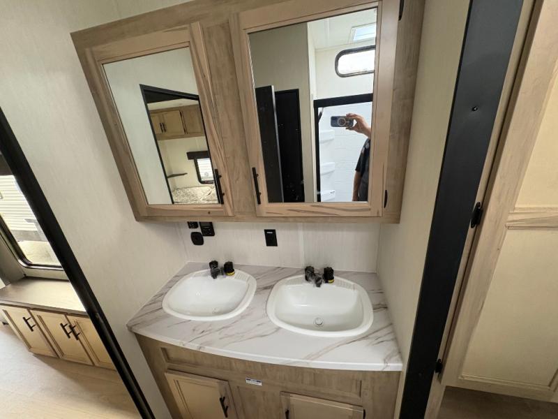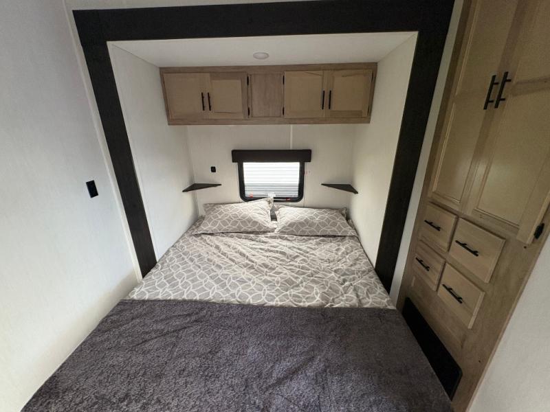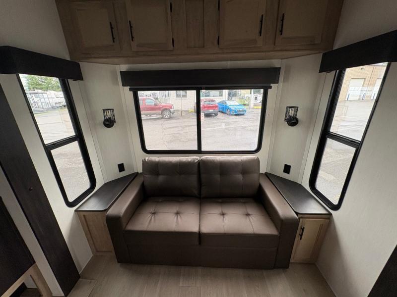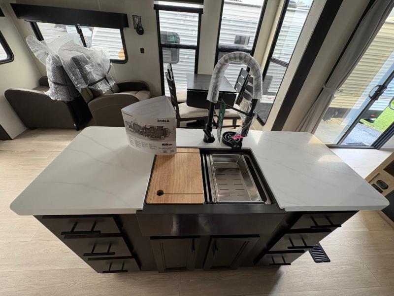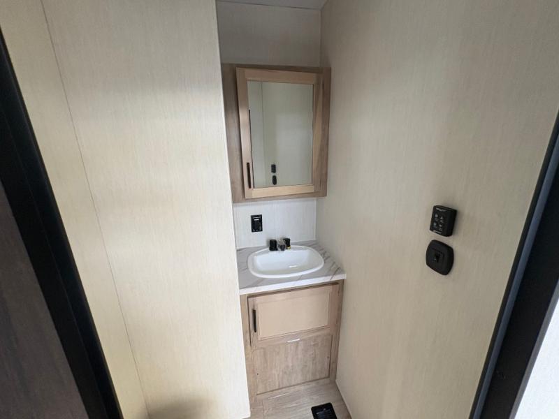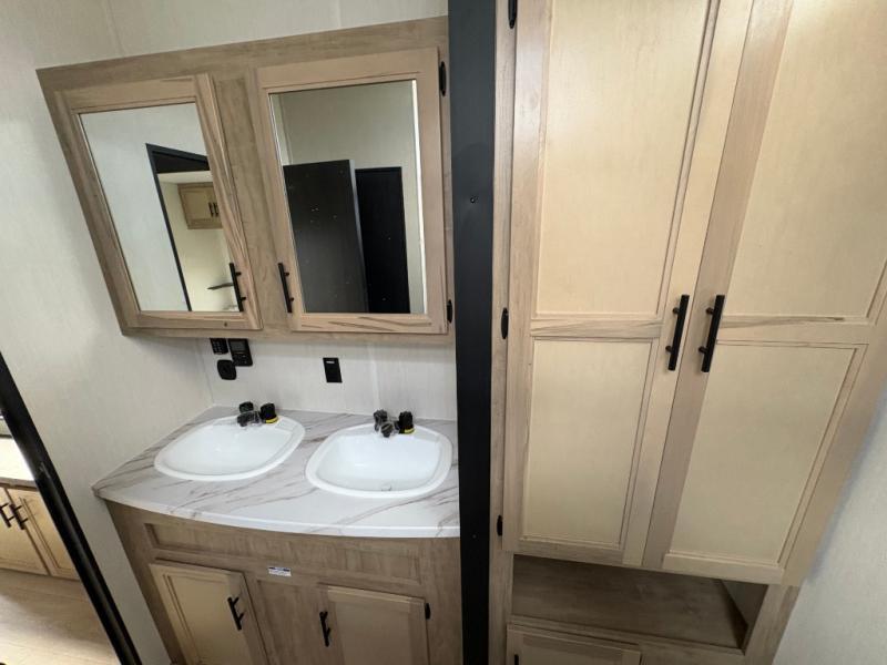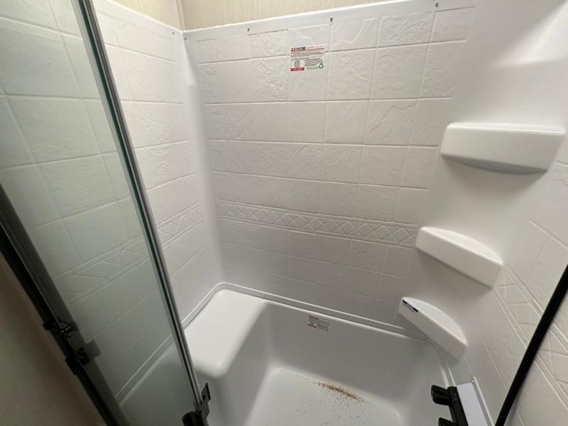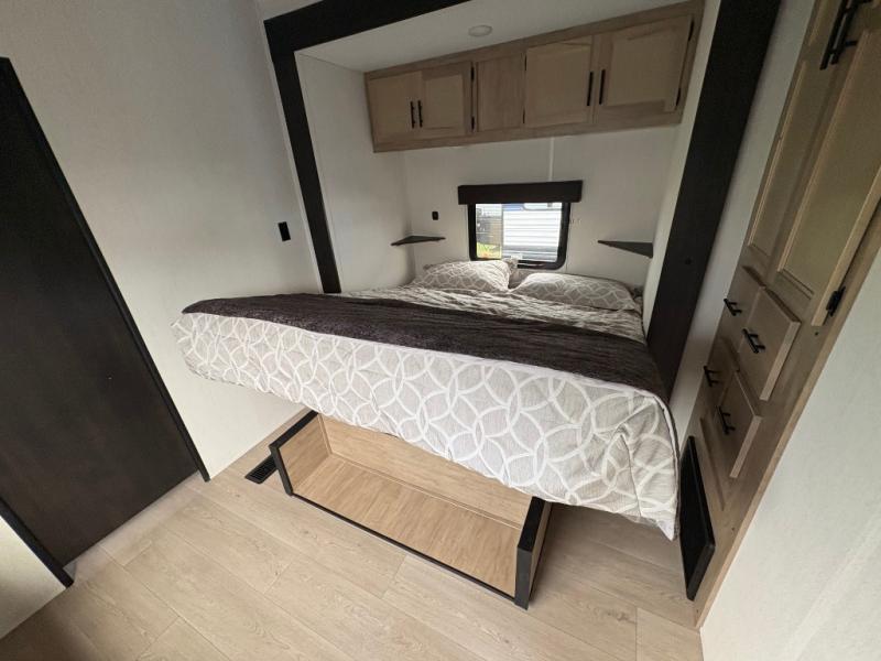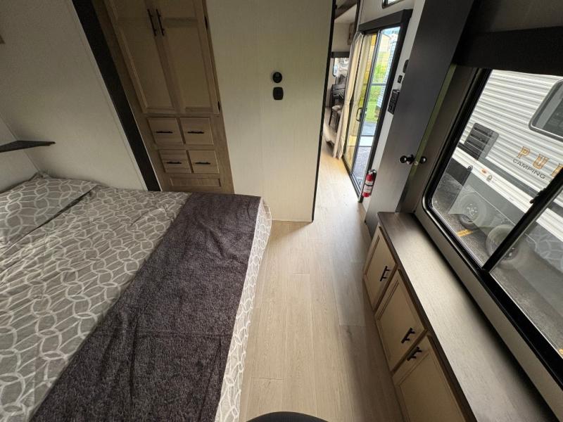 Spacious and comfortable describe this destination travel trailer featuring triple slides with dual opposing slides in the living area which creates a wide open space for a dining table and four chairs, two lounge chairs, an entertainment center with a fireplace, and a hide-a-bed sofa along the very front wall. The roadside slide also houses the kitchen appliances which include a refrigerator, stove and microwave oven. There is a pantry and a hutch adjacent to the slide, and a kitchen island for more food prep space, and this is where your sink is located so you can be facing all of the seating areas in the room while prepping meals and doing the dishes. A centrally located half bath is convenient just inside the main patio door entry. Towards the rear of the coach, a private bedroom featuring a king bed slide along with storage space for your clothing. In the very back, a master suite bath featuring a vanity with dual sinks, a shower with a seat, linen storage, and a wardrobe that has been prepped for a washer and dryer if you choose to add. You will love the outside TV mount and 21' covered awning space to create a nice size outdoor living area to enjoy on sunny days or pleasant evenings.