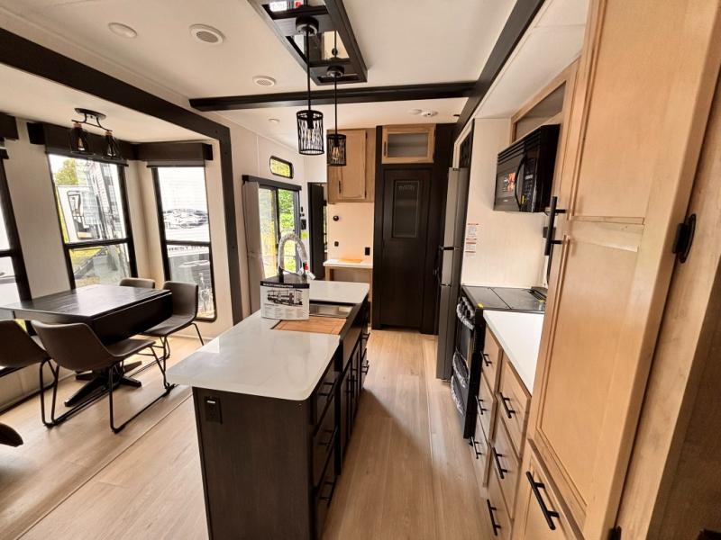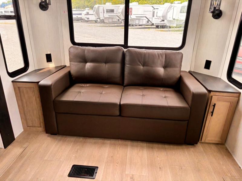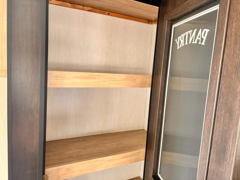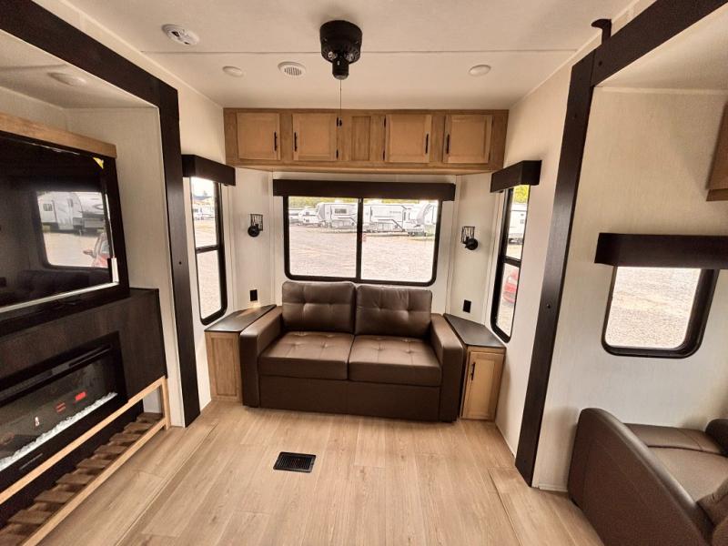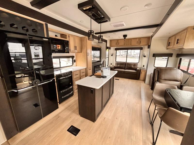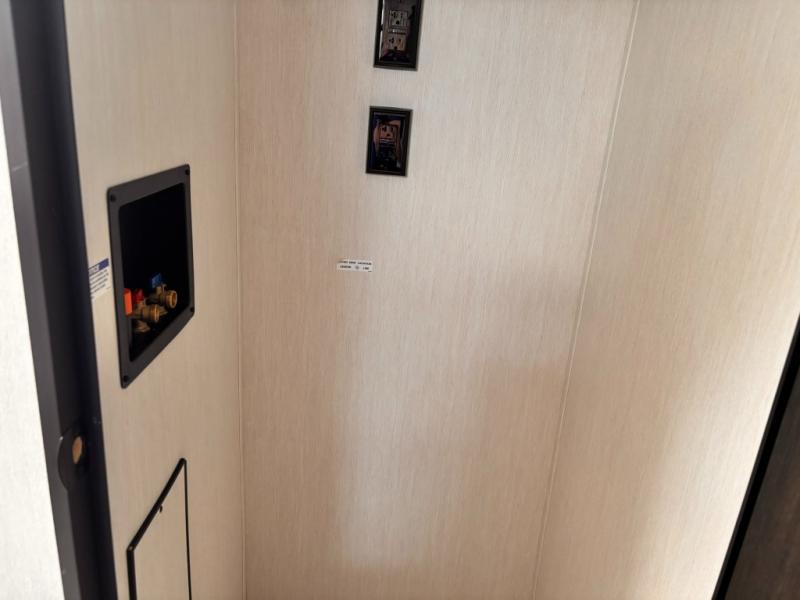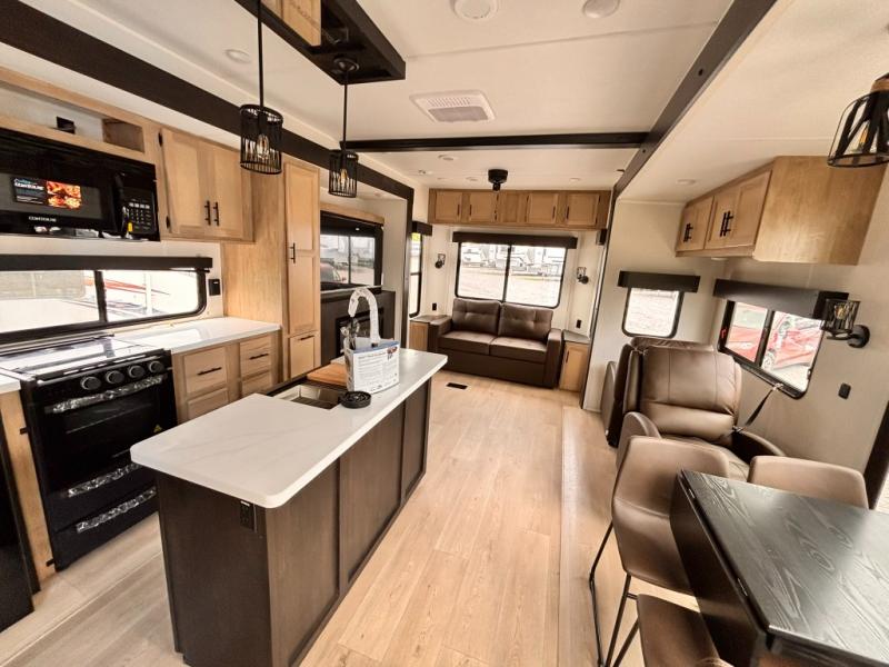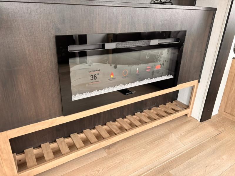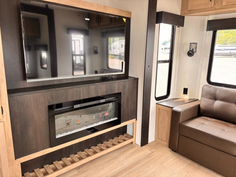 Spacious and comfortable describe this destination travel trailer featuring triple slides with dual opposing slides in the living area which creates a wide open space for a dining table and four chairs, two lounge chairs, an entertainment center with a fireplace, and a hide-a-bed sofa along the very front wall. The roadside slide also houses the kitchen appliances which include a refrigerator, stove and microwave oven. There is a pantry and a hutch adjacent to the slide, and a kitchen island for more food prep space, and this is where your sink is located so you can be facing all of the seating areas in the room while prepping meals and doing the dishes. A centrally located half bath is convenient just inside the main patio door entry. Towards the rear of the coach, a private bedroom featuring a king bed slide along with storage space for your clothing. In the very back, a master suite bath featuring a vanity with dual sinks, a shower with a seat, linen storage, and a wardrobe that has been prepped for a washer and dryer if you choose to add. You will love the outside TV mount and 21' covered awning space to create a nice size outdoor living area to enjoy on sunny days or pleasant evenings.