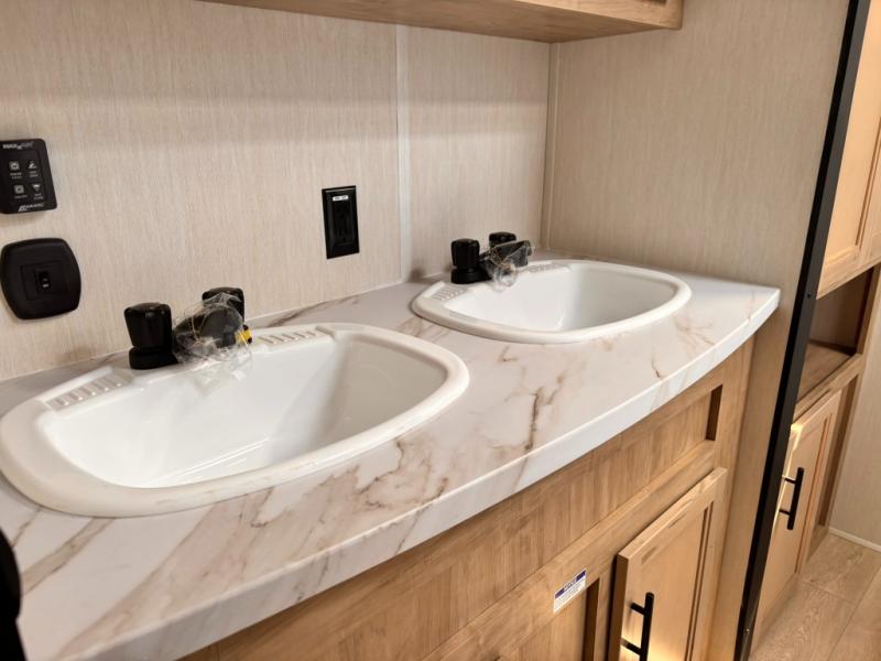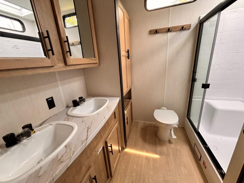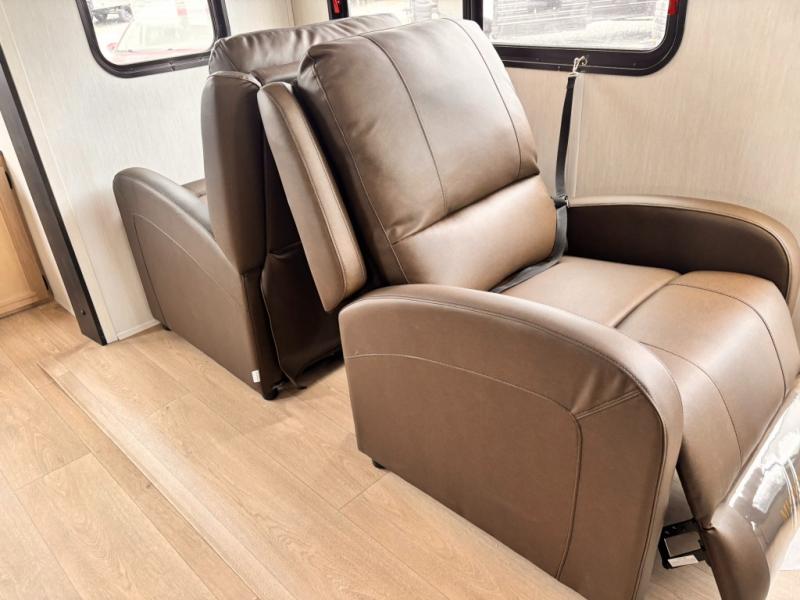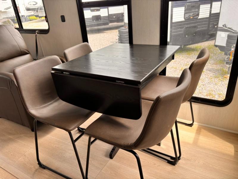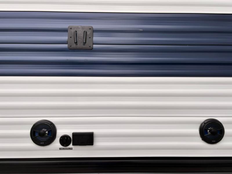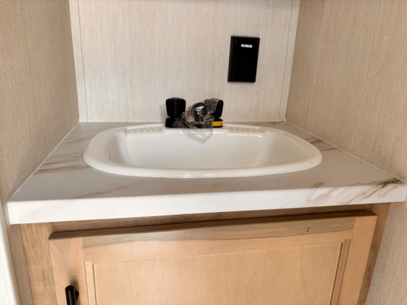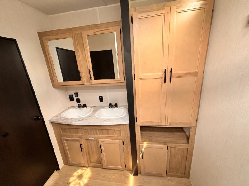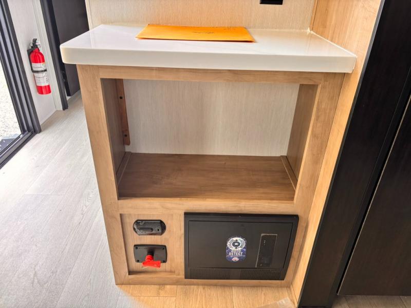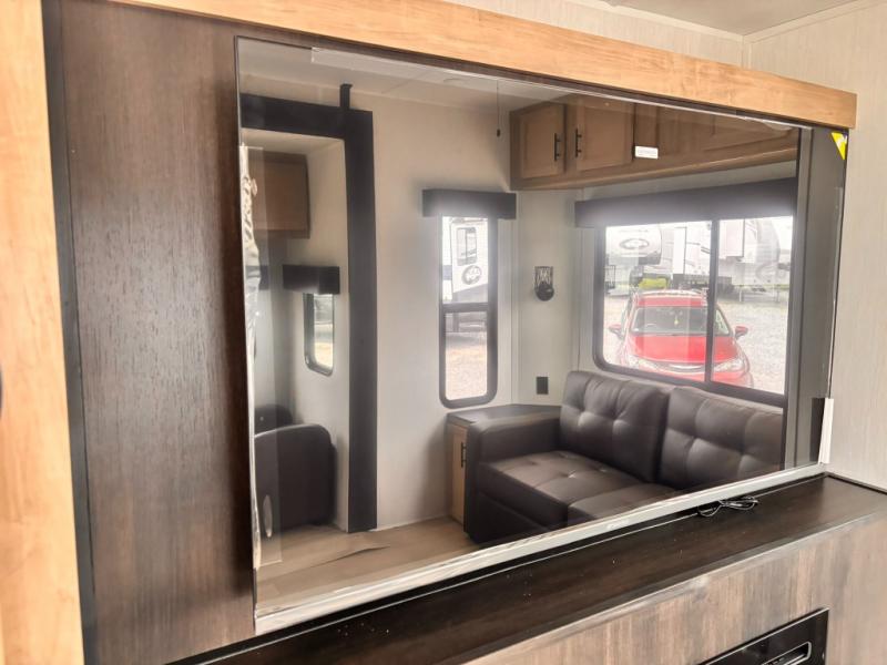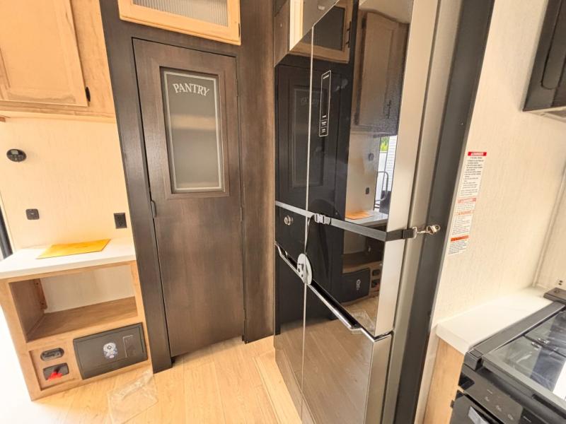 Spacious and comfortable describe this destination travel trailer featuring triple slides with dual opposing slides in the living area which creates a wide open space for a dining table and four chairs, two lounge chairs, an entertainment center with a fireplace, and a hide-a-bed sofa along the very front wall. The roadside slide also houses the kitchen appliances which include a refrigerator, stove and microwave oven. There is a pantry and a hutch adjacent to the slide, and a kitchen island for more food prep space, and this is where your sink is located so you can be facing all of the seating areas in the room while prepping meals and doing the dishes. A centrally located half bath is convenient just inside the main patio door entry. Towards the rear of the coach, a private bedroom featuring a king bed slide along with storage space for your clothing. In the very back, a master suite bath featuring a vanity with dual sinks, a shower with a seat, linen storage, and a wardrobe that has been prepped for a washer and dryer if you choose to add. You will love the outside TV mount and 21' covered awning space to create a nice size outdoor living area to enjoy on sunny days or pleasant evenings.