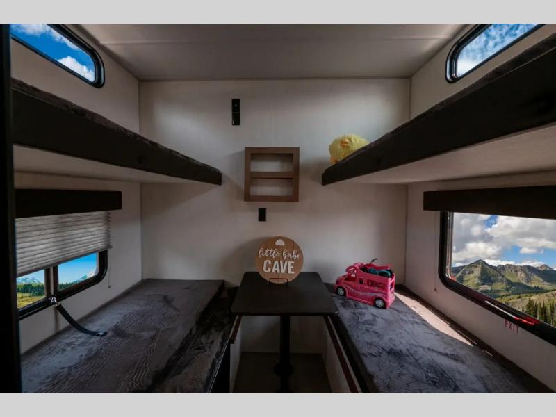 Ten can easily sleep in this destination travel trailer featuring a bunkhouse, large slide in the living area which creates a wide open space for a U-shaped dinette and sofa where you can enjoy the entertainment center with a fireplace. The kitchen is fully equipped with everything needed to create meals and snacks for your whole crew, and the walk-in pantry is great for storing all of your non-perishables. This space also features optional washer/dryer prep. In the very back, the bunkhouse features comfortable sleeping with double bunks on one side and double bunks with a hinged platform along the opposite side that the kids are sure to love. Up front, a side aisle bath featuring a shower with a seat, a vanity with medicine cabinet, and a toilet. You will also love the outside TV mount and 18' power awning space to create a nice size outdoor living area to enjoy on sunny days or pleasant evenings.