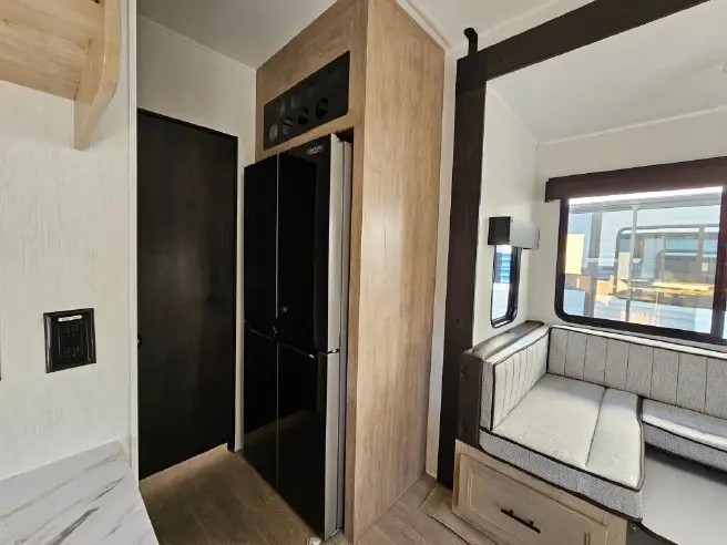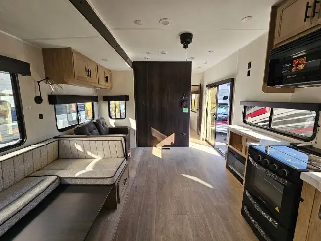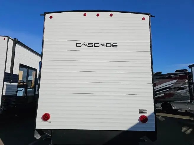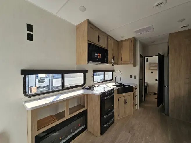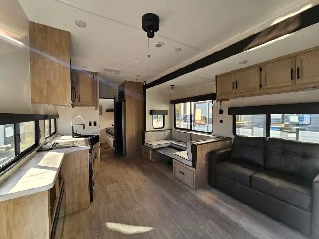 Ten can easily sleep in this destination travel trailer featuring a bunkhouse, large slide in the living area which creates a wide open space for a U-shaped dinette and sofa where you can enjoy the entertainment center with a fireplace. The kitchen is fully equipped with everything needed to create meals and snacks for your whole crew, and the walk-in pantry is great for storing all of your non-perishables. This space also features optional washer/dryer prep. In the very back, the bunkhouse features comfortable sleeping with double bunks on one side and double bunks with a hinged platform along the opposite side that the kids are sure to love. Up front, a side aisle bath featuring a shower with a seat, a vanity with medicine cabinet, and a toilet. You will also love the outside TV mount and 18' awning space to create a nice size outdoor living area to enjoy on sunny days or pleasant evenings.