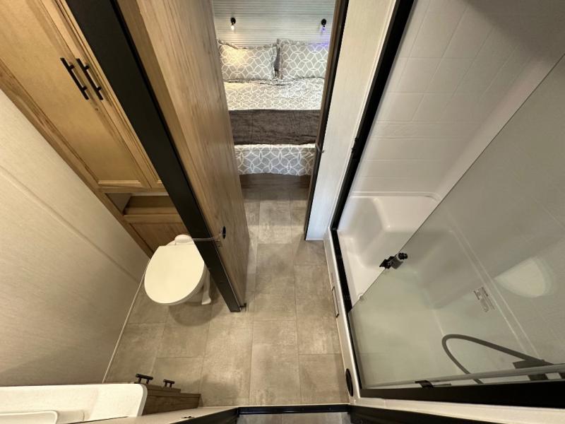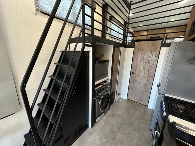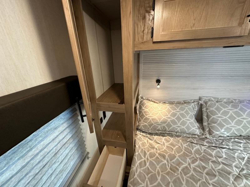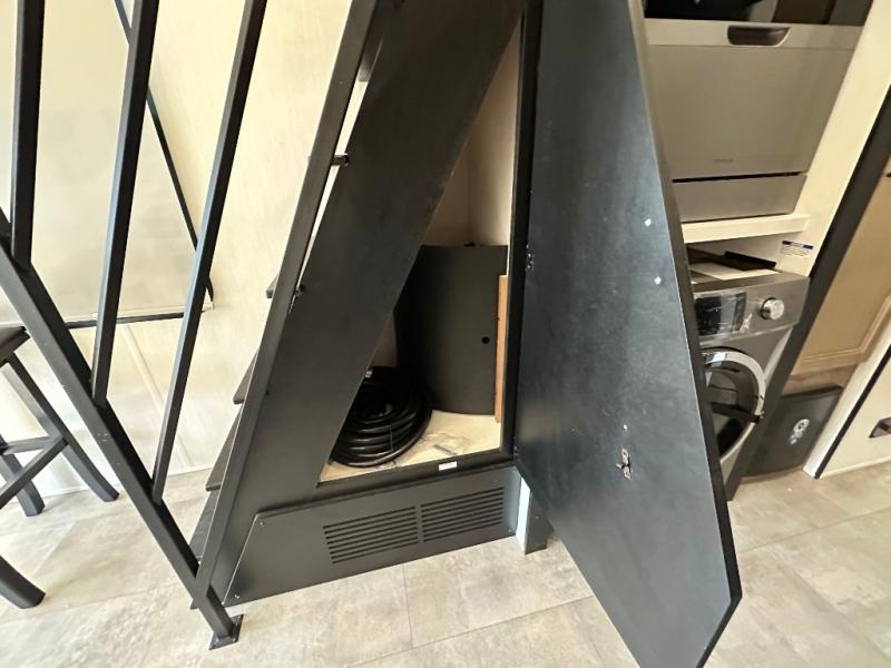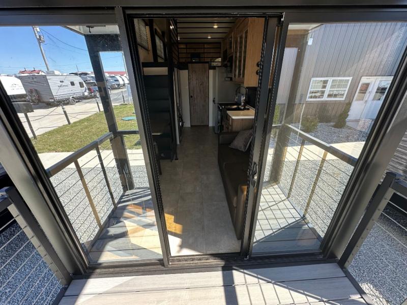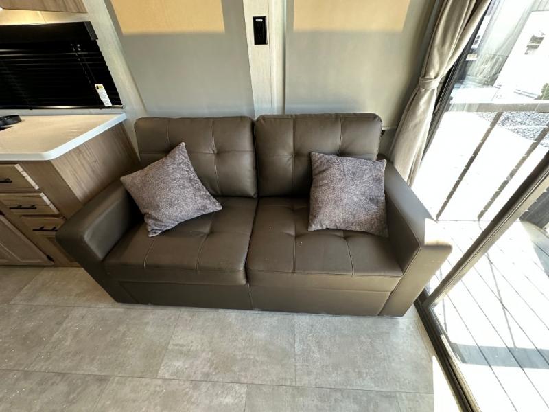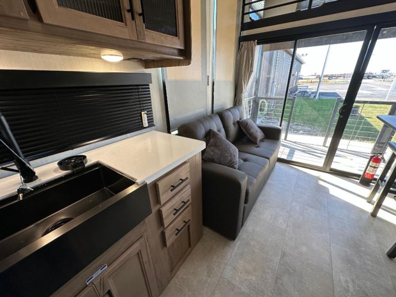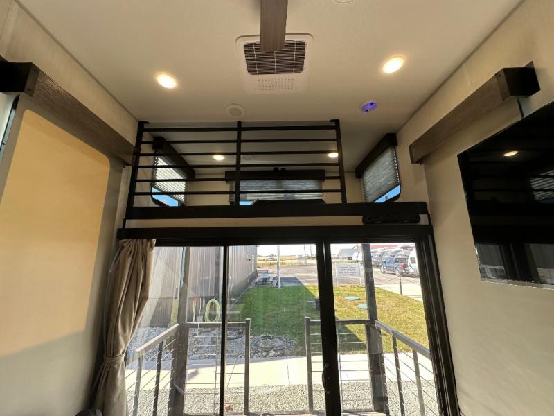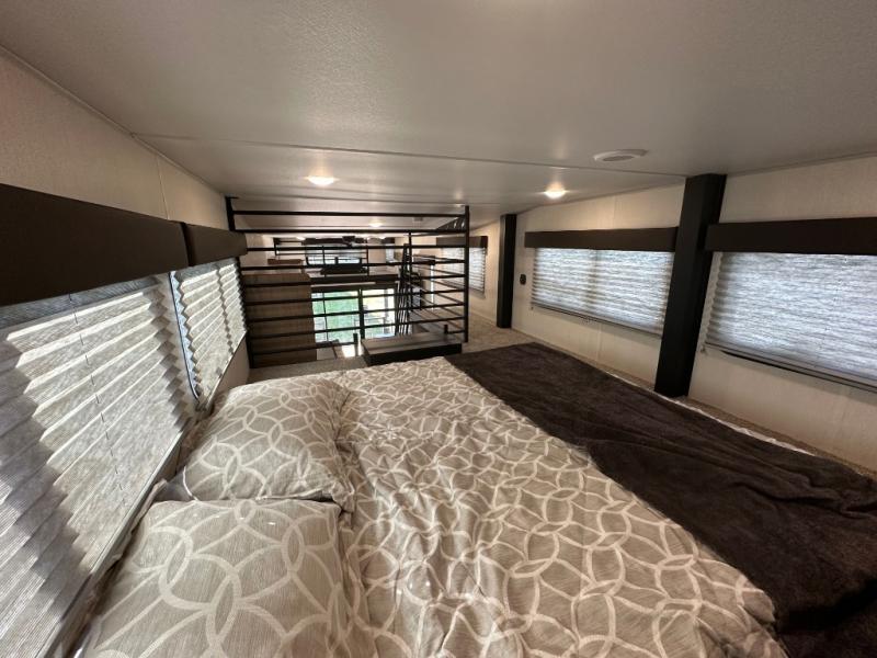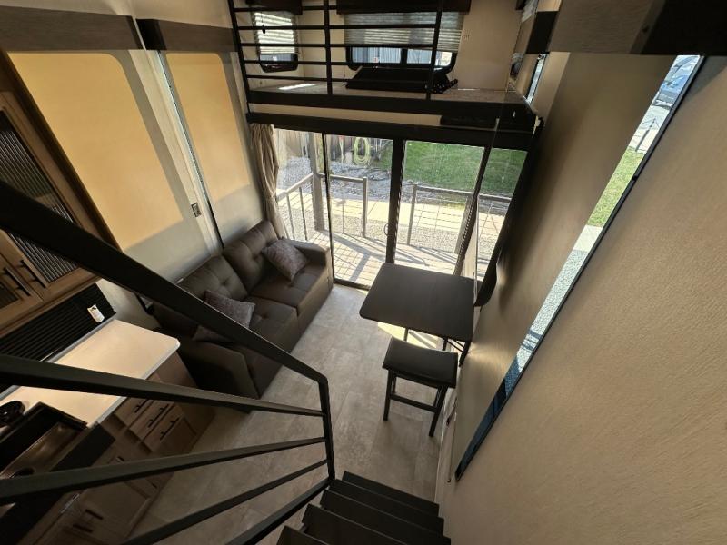 This model is similar to 16MLBL but larger! A bigger bathroom, king bed in the lower master, and a queen bed plus a twin bunk mat in the front loft. There is an 18 cu. ft. refrigerator so you can stock up for a week long vacation, a hide-a-bed sofa that can transform into added sleeping for guests, and a high top table with two stools to dine at. A ladder allows access into the upper front loft that is over the covered patio. The bathroom below is split with a shower on one side, and a private toilet area and sink opposite. And the view is amazing from just about anywhere inside.