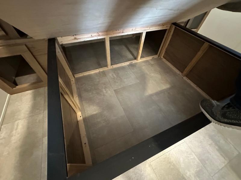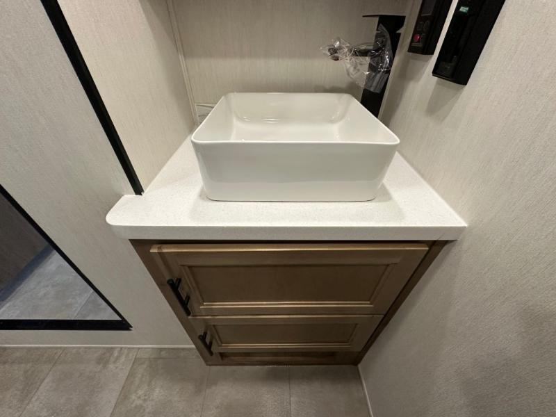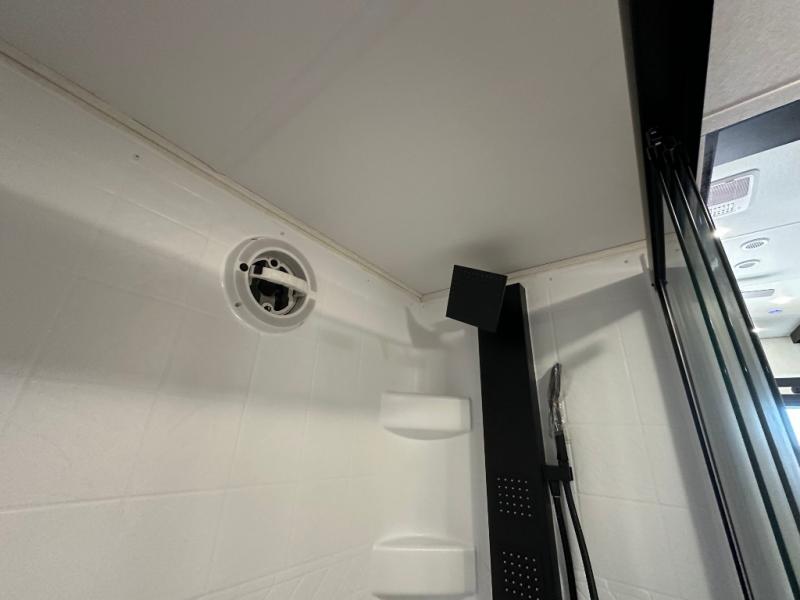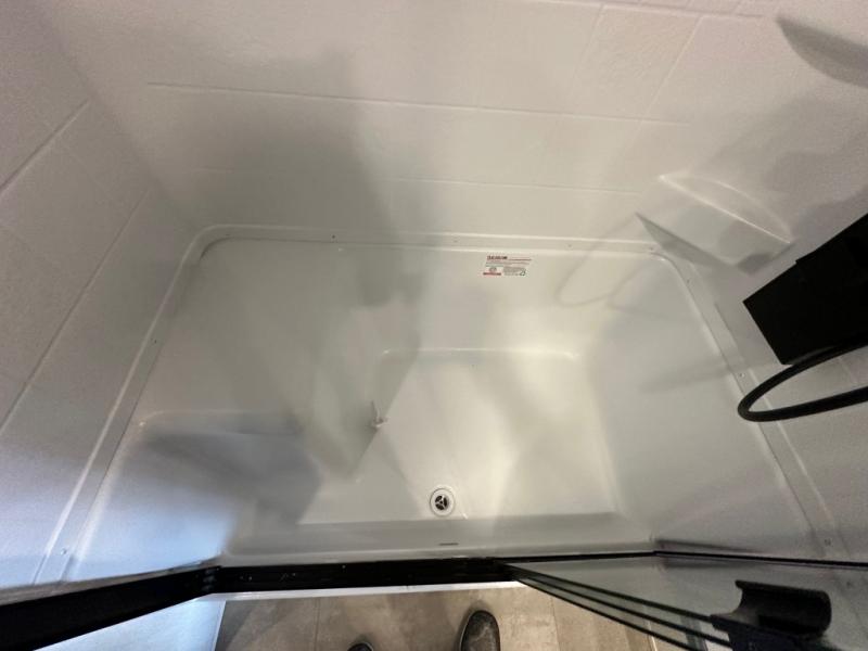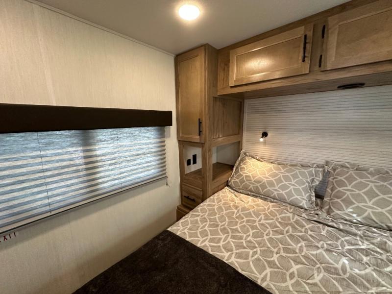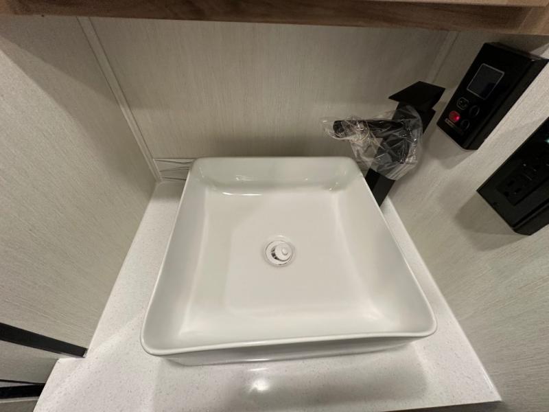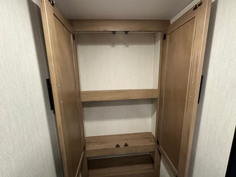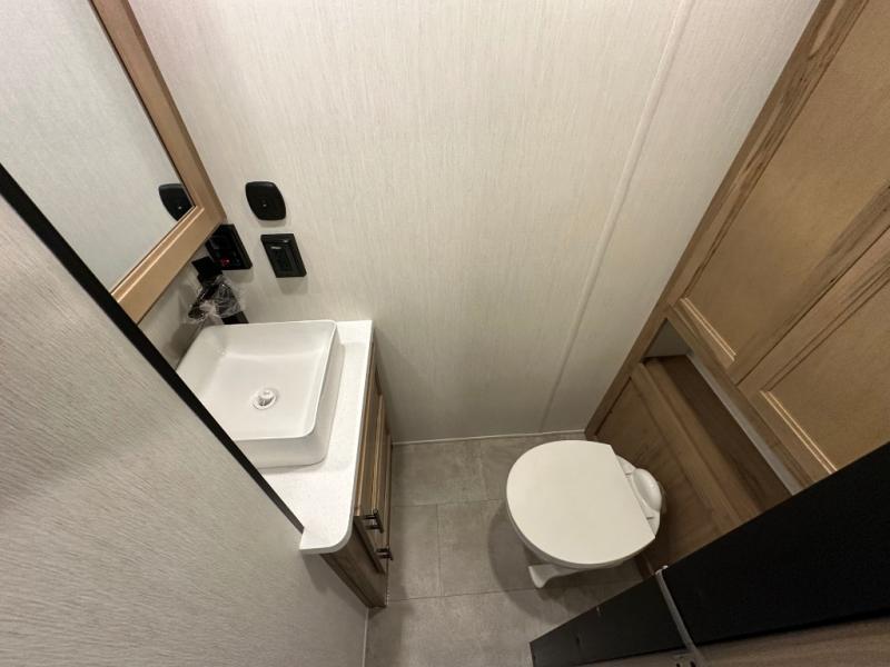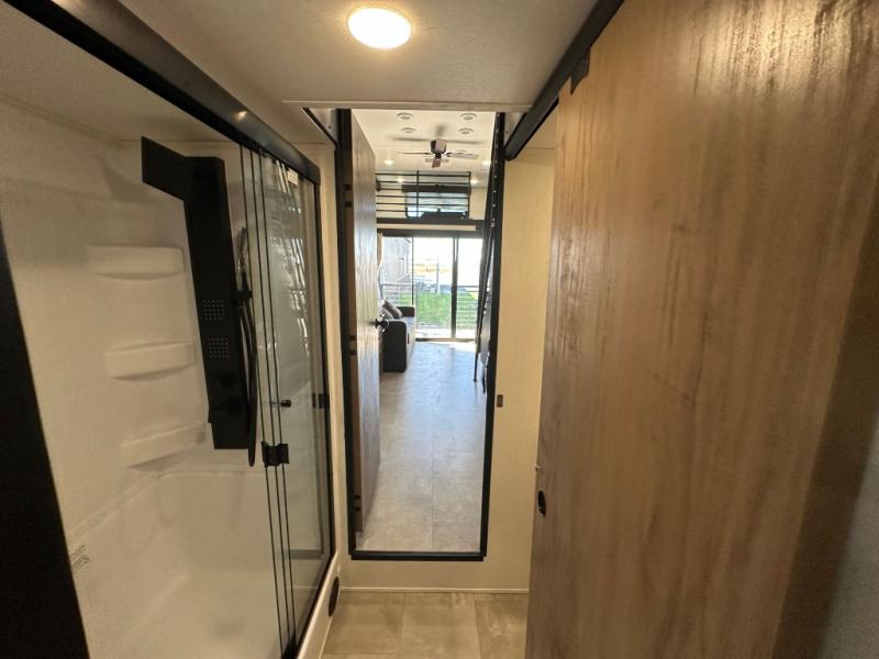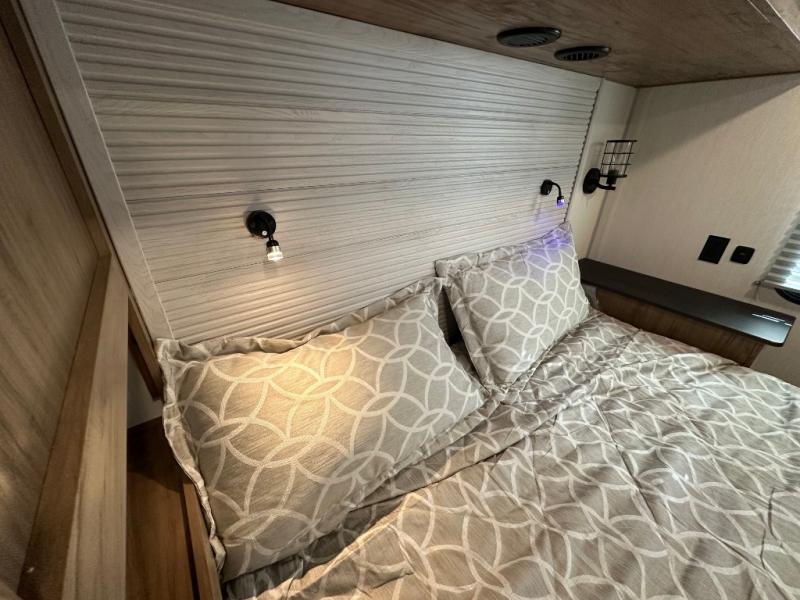 This model is similar to 16MLBL but larger! A bigger bathroom, king bed in the lower master, and a queen bed plus a twin bunk mat in the front loft. There is an 18 cu. ft. refrigerator so you can stock up for a week long vacation, a hide-a-bed sofa that can transform into added sleeping for guests, and a high top table with two stools to dine at. A ladder allows access into the upper front loft that is over the covered patio. The bathroom below is split with a shower on one side, and a private toilet area and sink opposite. And the view is amazing from just about anywhere inside.
