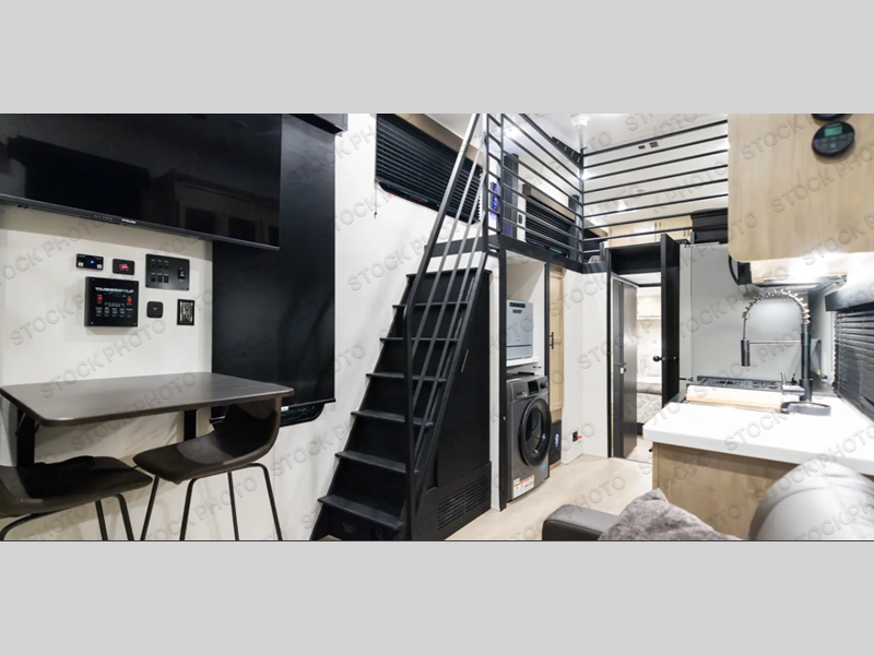 This model is similar to 16MLBL but larger! There is a bigger bathroom, king bed in the lower master, and a queen bed plus a twin bunk mat in the front loft. There is an 18 cu. ft. refrigerator so you can stock up for a week long vacation, a hide-a-bed sofa that can transform into added sleeping for guests, and a high top table with two stools to dine at. A ladder allows access into the upper front loft that is over the covered patio. The bathroom below is split with a shower on one side, and a private toilet area and sink opposite. And the view is amazing from just about anywhere inside.