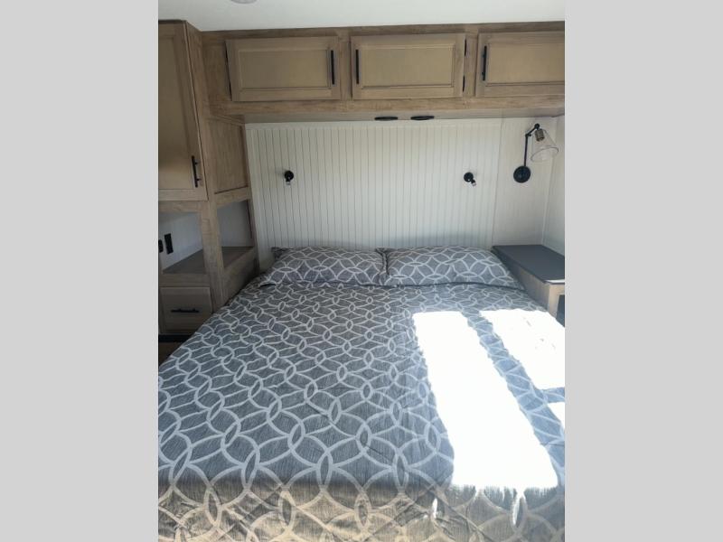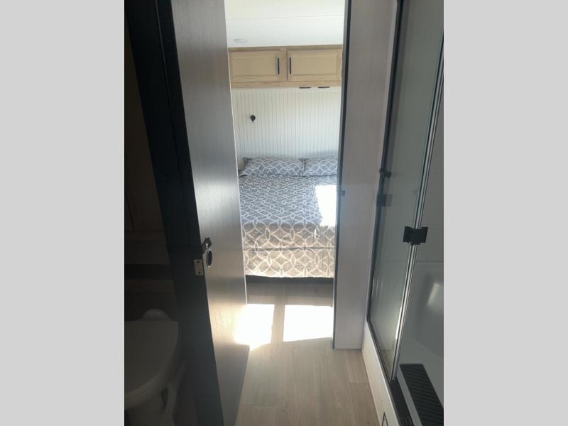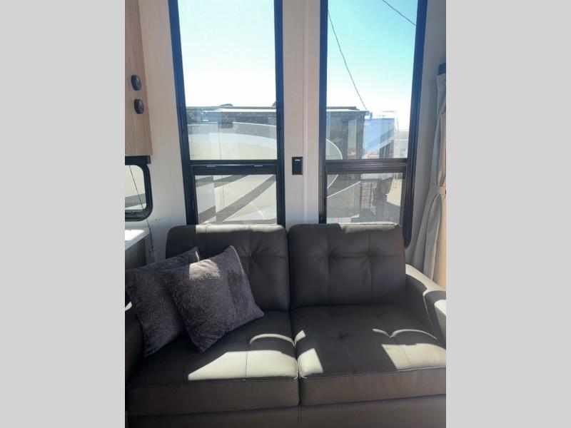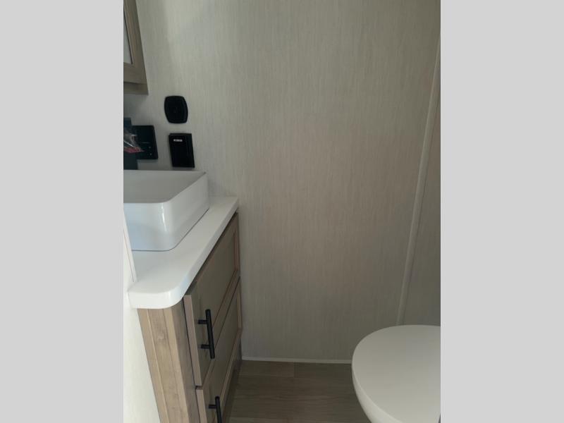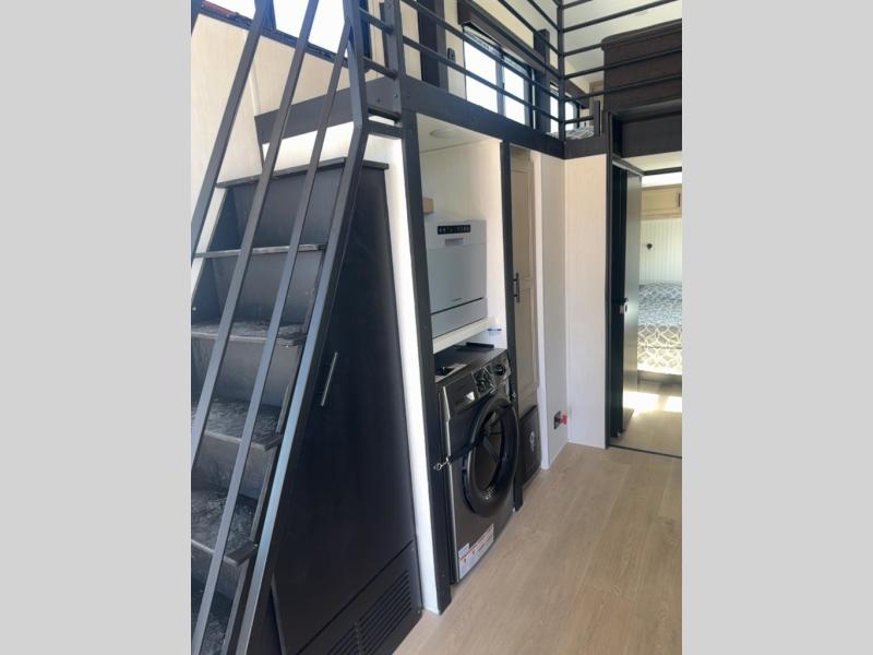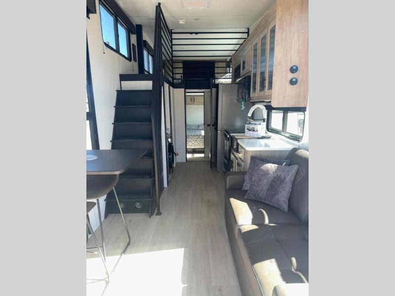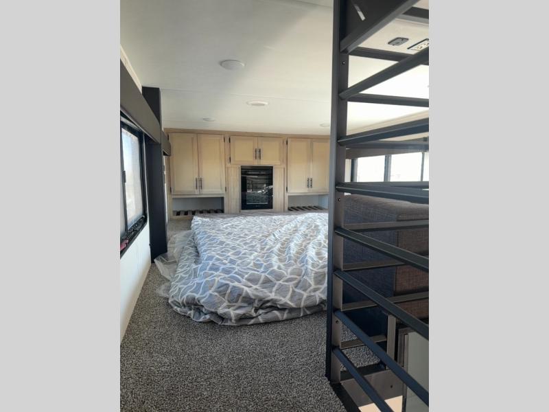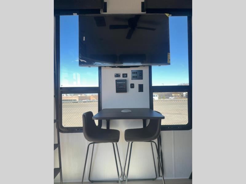 This model is similar to 16MLBL but larger! There is a bigger bathroom, king bed in the lower master, and a queen bed plus a twin bunk mat in the front loft. There is an 18 cu. ft. refrigerator so you can stock up for a week long vacation, a hide-a-bed sofa that can transform into added sleeping for guests, and a high top table with two stools to dine at. A ladder allows access into the upper front loft that is over the covered patio. The bathroom below is split with a shower on one side, and a private toilet area and sink opposite. And the view is amazing from just about anywhere inside.
