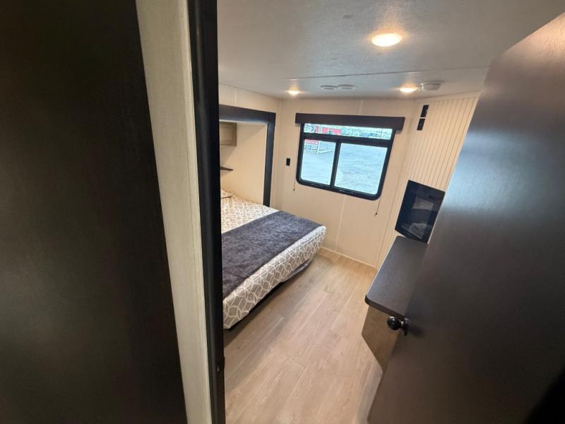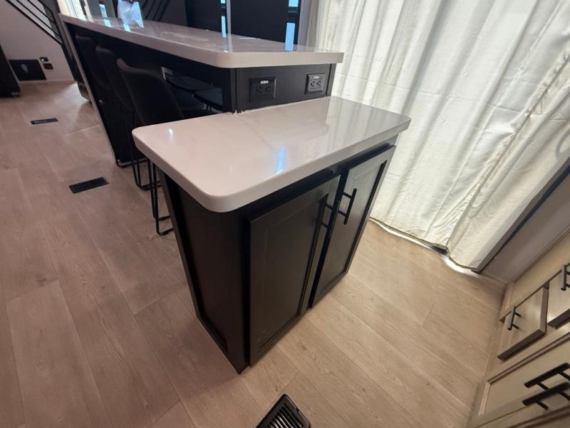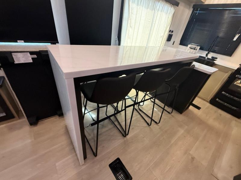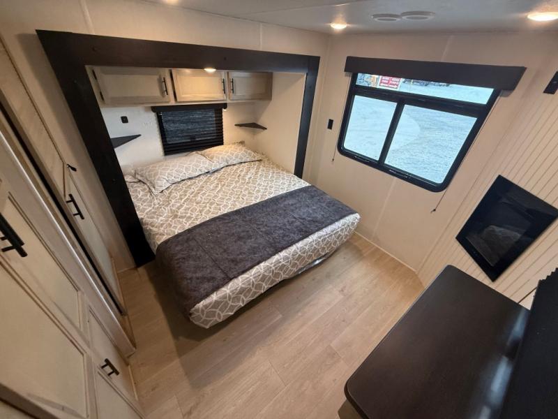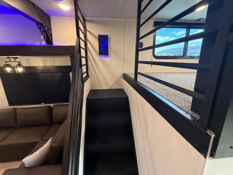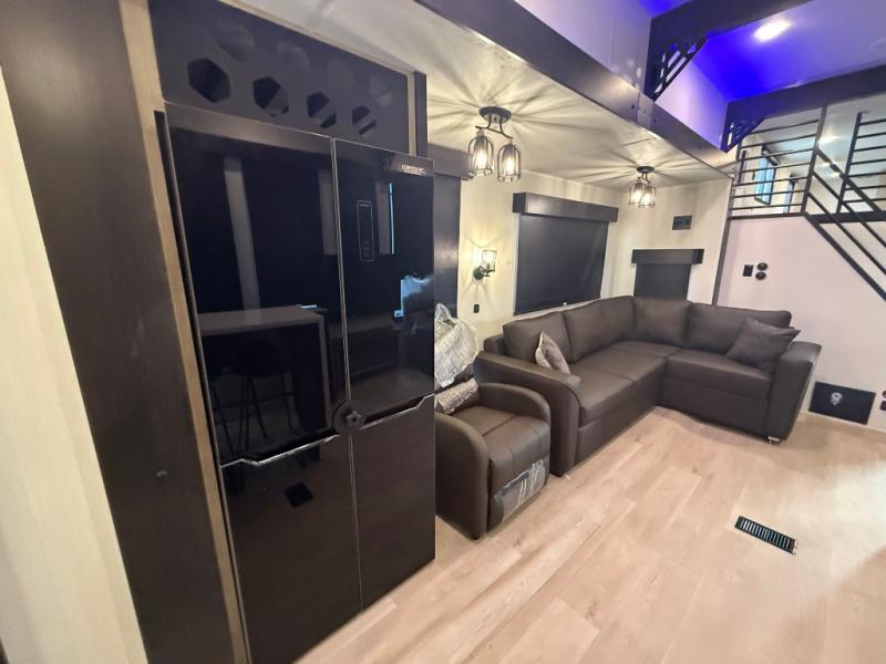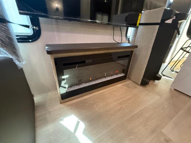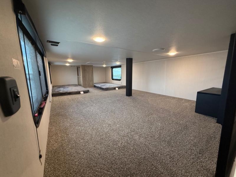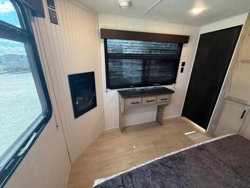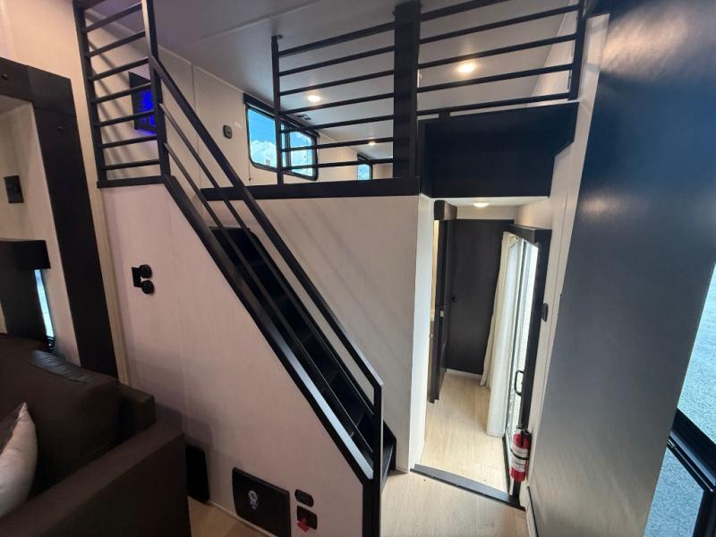 Time spent in this destination trailer will be time well spent! You will appreciate dual entry doors for maximum convenience, plus a spacious full bath that is close by the front private bedroom! Your crew can relax in the middle living area on the L-shaped hide-a-bed sofa or on the two lounge chairs. The rear kitchen will be any chef's dream with its island with six stools and all the appliances to create meals each day. This model also features triple slides so you can enjoy more space to relax. The front bedroom includes a king bed slide out, a desk with drawers, and a bedroom fireplace. And above this room is where you'll find the spacious loft with two bunk mats, storage, and space for the little ones to play!