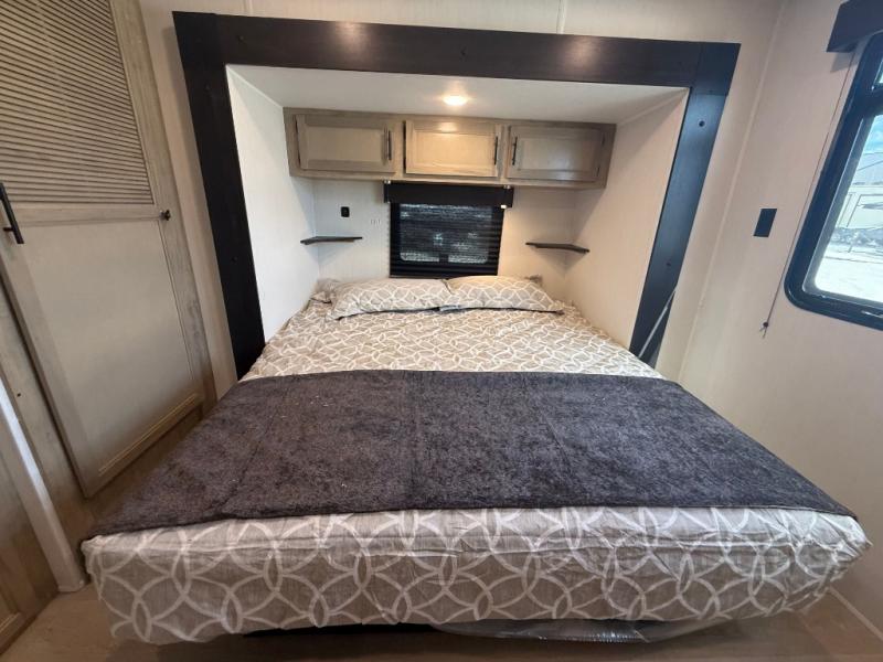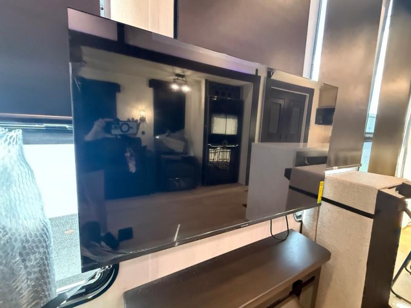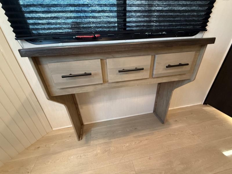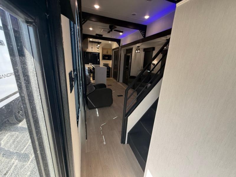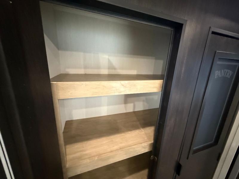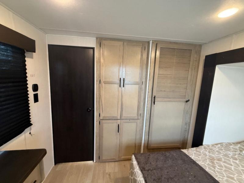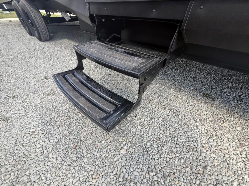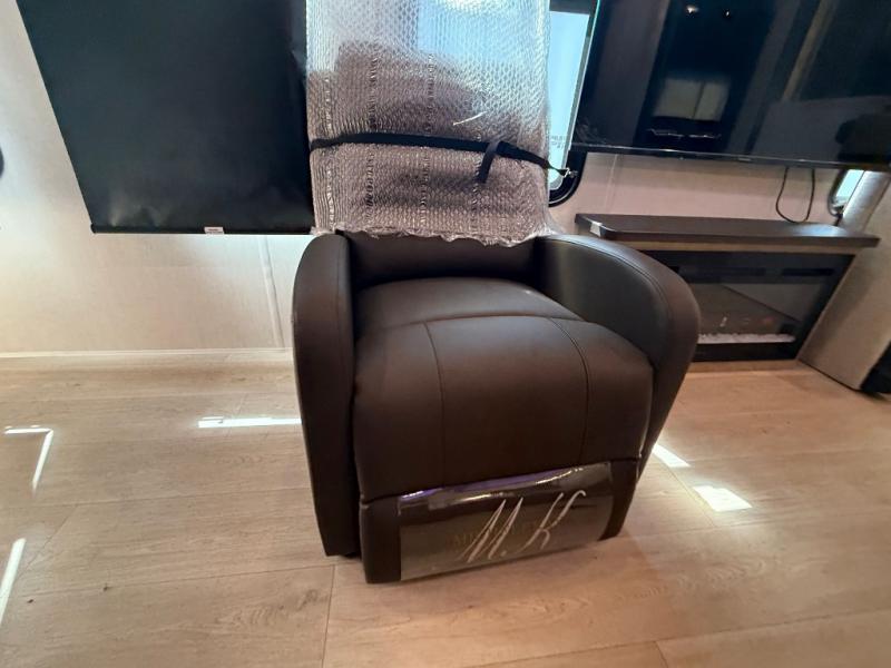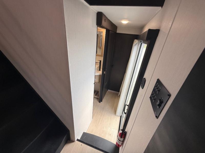Time spent in this destination trailer will be time well spent! You will appreciate dual entry doors for maximum convenience, plus a spacious full bath that is close by the front private bedroom! Your crew can relax in the middle living area on the L-shaped hide-a-bed sofa or on the two lounge chairs. The rear kitchen will be any chef's dream with its island with six stools and all the appliances to create meals each day. This model also features triple slides so you can enjoy more space to relax. The front bedroom includes a king bed slide out, a desk with drawers, and a bedroom fireplace. And above this room is where you'll find the spacious loft with two bunk mats, storage, and space for the little ones to play!