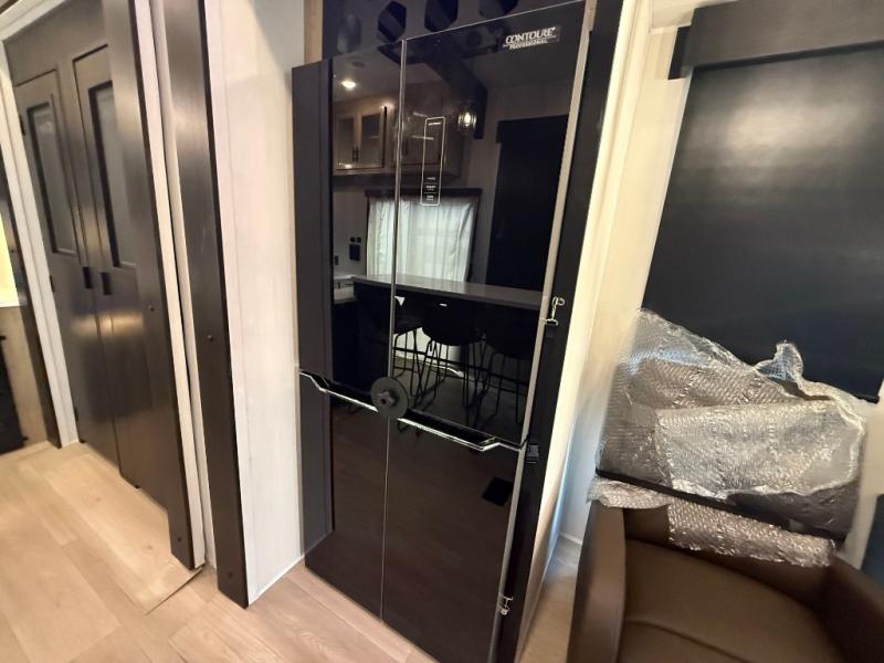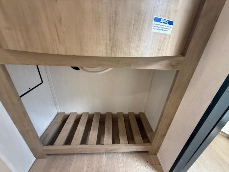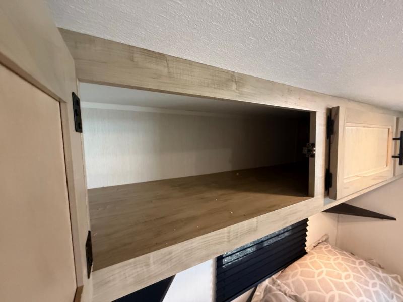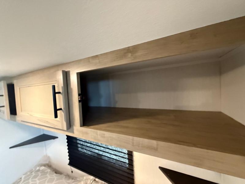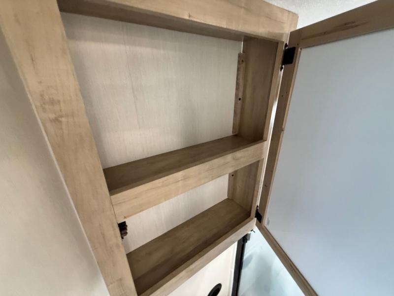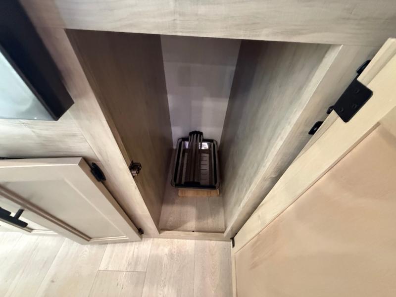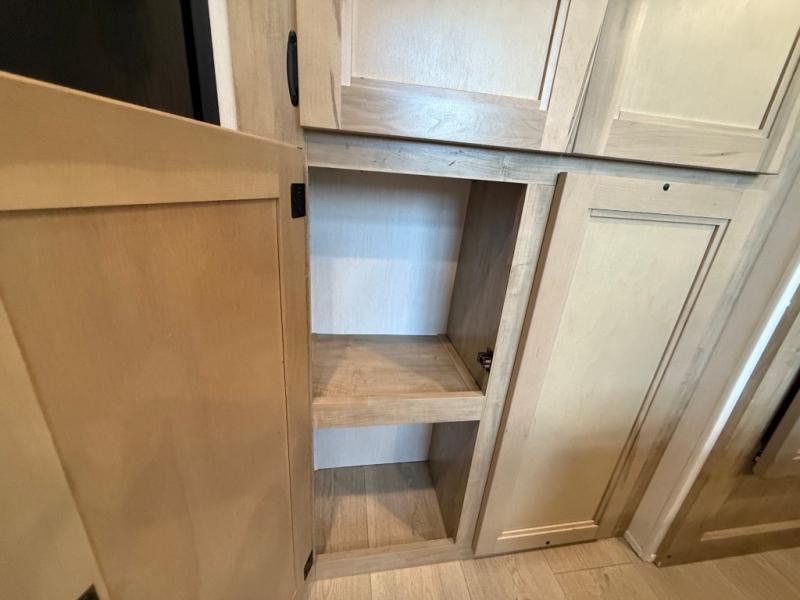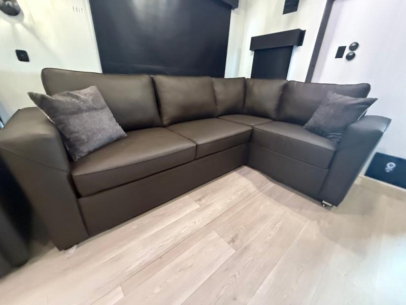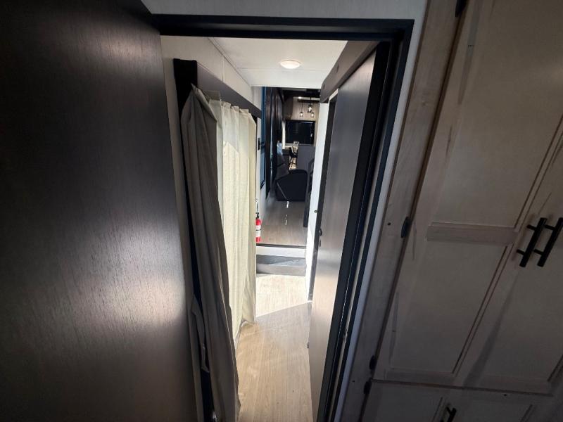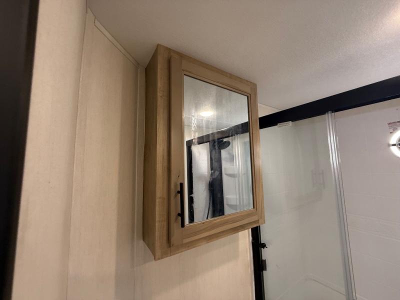Time spent in this destination trailer will be time well spent! You will appreciate dual entry doors for maximum convenience, plus a spacious full bath that is close by the front private bedroom! Your crew can relax in the middle living area on the L-shaped hide-a-bed sofa or on the two lounge chairs. The rear kitchen will be any chef's dream with its island with six stools and all the appliances to create meals each day. This model also features triple slides so you can enjoy more space to relax. The front bedroom includes a king bed slide out, a desk with drawers, and a bedroom fireplace. And above this room is where you'll find the spacious loft with two bunk mats, storage, and space for the little ones to play!