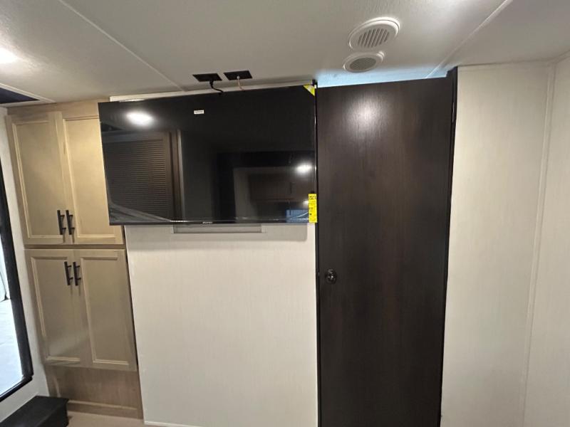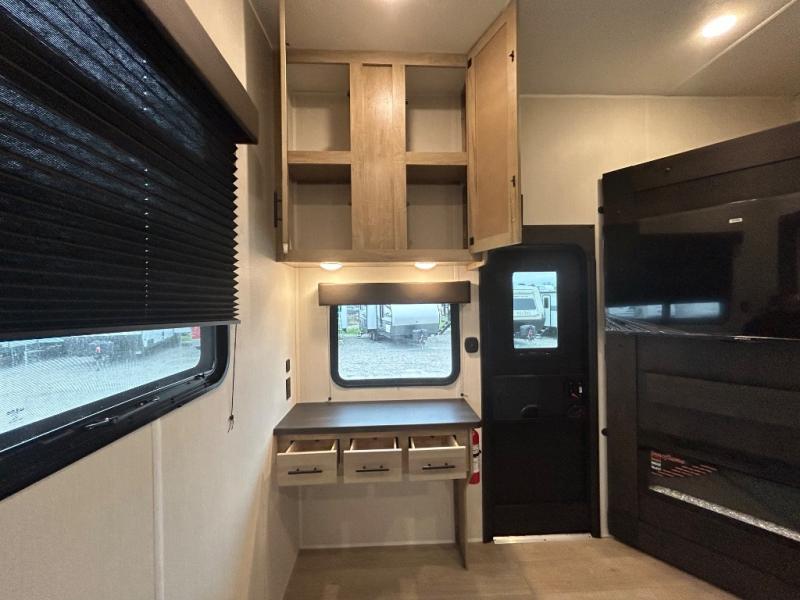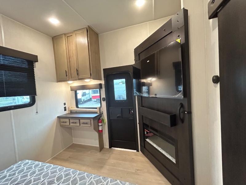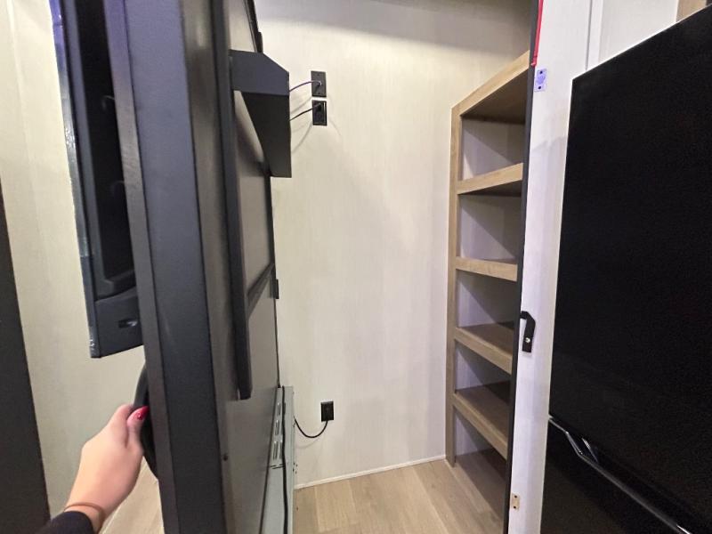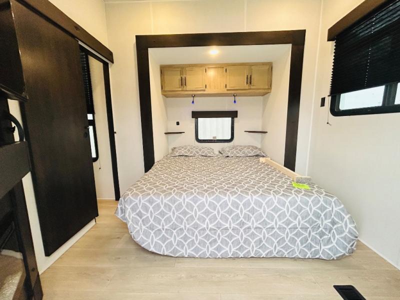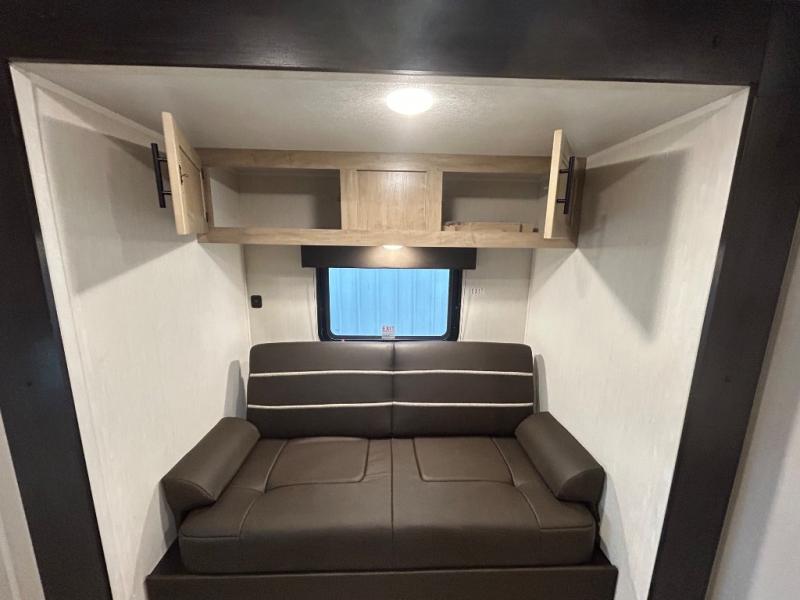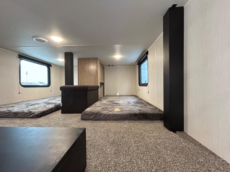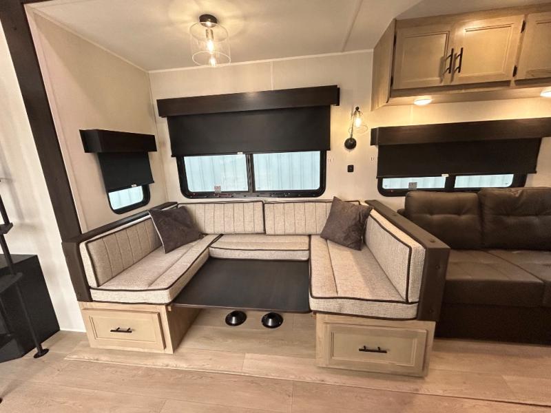 If you plan to camp with a larger group, this destination trailer will be perfect for you! There is a front private bedroom with a king bed slide out, a desk with a shoe rack underneath, plus an entertainment center with a fireplace to make it more cozy! Your guests can claim the rear den with a sofa slide out, plenty of storage, and their own full bath! There is even a loft above this room with two bunk mats and cabinets for storage. And the second full bath is up front right next to the bedroom for convenience. In the morning, everyone can meet in the combined kitchen and living area as the chef make breakfast in the full kitchen. There is a U-shaped dinette and hide-a-bed sofa within the large slide out here, plus an entertainment center with a fireplace and hidden walk-in pantry!