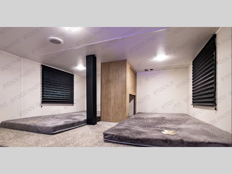 If you plan to camp with a larger group, this destination trailer will be perfect for you! There is a front private bedroom with a king bed slide out, a desk with a shoe rack underneath, plus an entertainment center with a fireplace to make it more cozy! Your guests can claim the rear den with a sofa slide out, plenty of storage, and their own full bath! There is even a loft above this room with two bunk mats and cabinets for storage. And the second full bath is up front right next to the bedroom for convenience. In the morning, everyone can meet in the combined kitchen and living area as the chef make breakfast in the full kitchen. There is a U-shaped dinette and hide-a-bed sofa within the large slide out here, plus an entertainment center with a fireplace and hidden walk-in pantry!