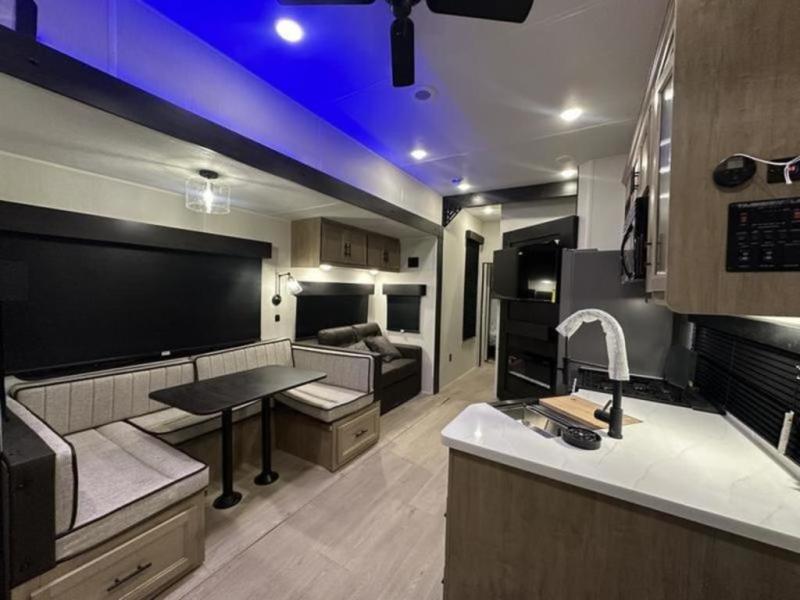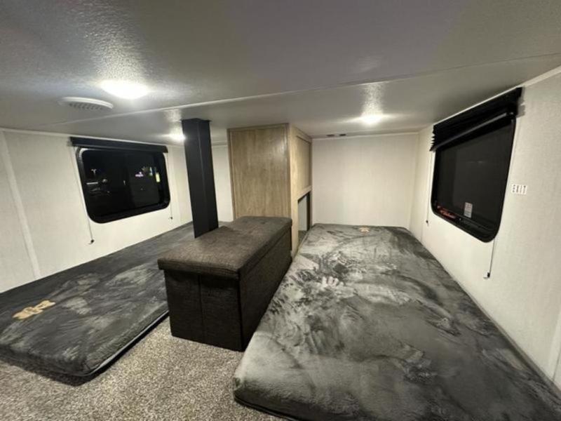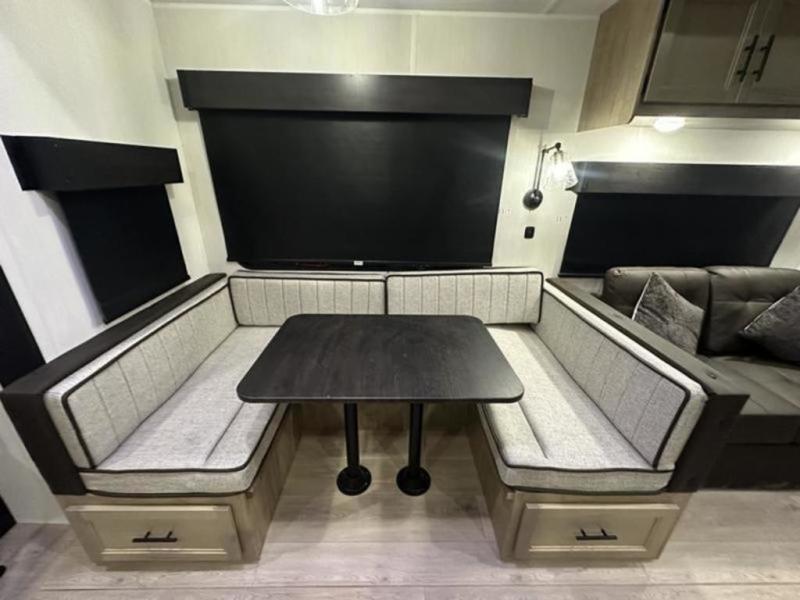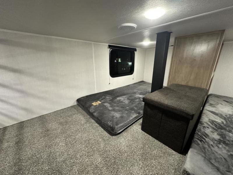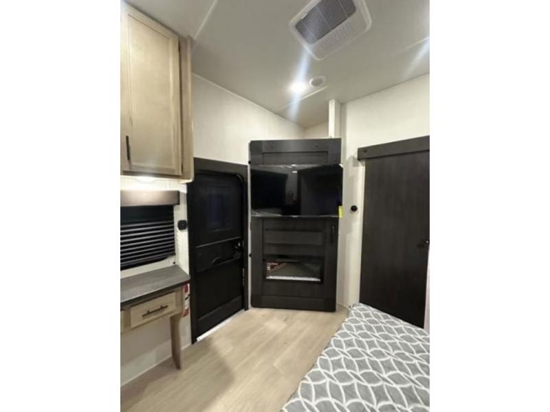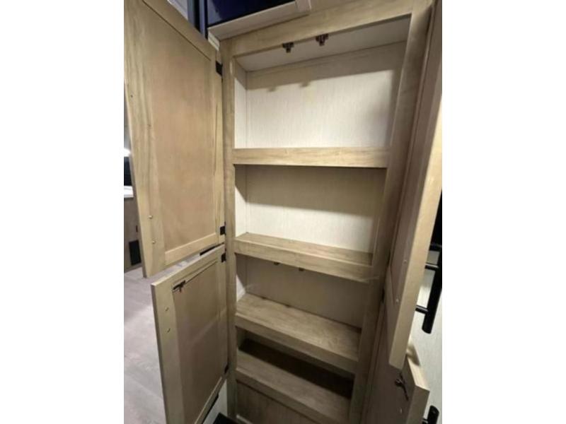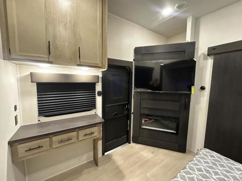 If you plan to camp with a larger group, this destination trailer will be perfect for you! There is a front private bedroom with a king bed slide out, a desk with a shoe rack underneath, plus an entertainment center with a fireplace to make it more cozy! Your guests can claim the rear den with a sofa slide out, plenty of storage, and their own full bath! There is even a loft above this room with two bunk mats and cabinets for storage. And the second full bath is up front right next to the bedroom for convenience. In the morning, everyone can meet in the combined kitchen and living area as the chef make breakfast in the full kitchen. There is a U-shaped dinette and hide-a-bed sofa within the large slide out here, plus an entertainment center with a fireplace and hidden walk-in pantry!