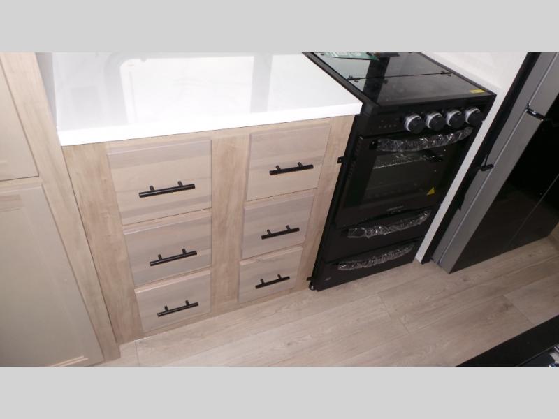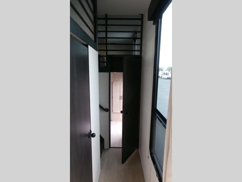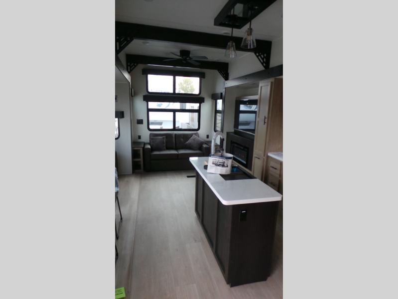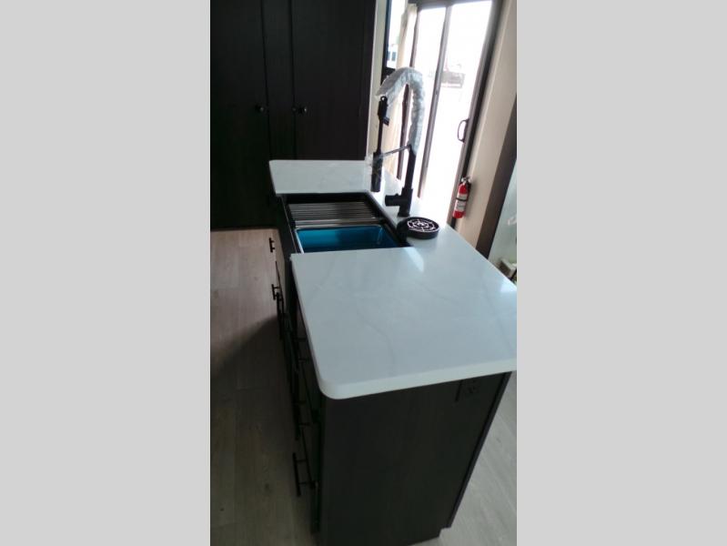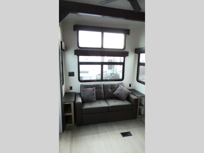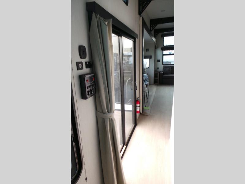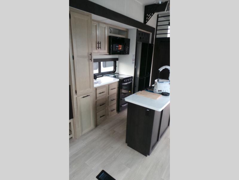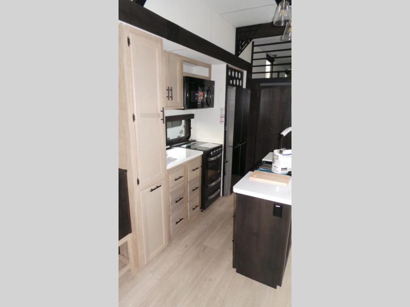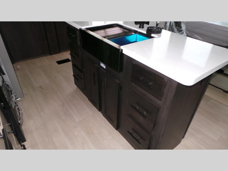 The 39DLBL features a double loft system for both additional sleeping and massive storage. The bedroom slide out is sized to accommodate an optional king bed. The two opposing rear slides open up the living room and kitchen so there is plenty of space for everyone to be comfortable. This kitchen has a huge residential French door refrigerator with two lower freezer drawers along with two full sized closets and an island suitable when preparing for the largest of gatherings.